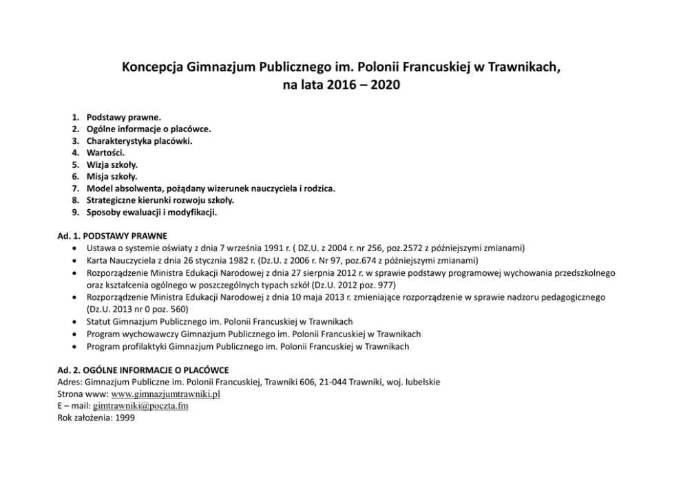 Koncepcja Gimnazjum Publicznego im. Polonii Francuskiej w Trawnikach, na lata 2016 – 2020 1. 2. 3. 4. 5. 6. 7. 8. 9. Podstawy prawne. Ogólne informacje o placówce. Charakterystyka placówki. Wartości. Wizja szkoły. Misja szkoły. Model absolwenta, pożądany wizerunek nauczyciela i rodzica. Strategiczne kierunki rozwoju szkoły. Sposoby ewaluacji i modyfikacji. Ad. 1. PODSTAWY PRAWNE Ustawa o systemie oświaty z dnia 7 września 1991 r. ( DZ.U. z 2004 r. nr 256, poz.2572 z późniejszymi zmianami) Karta Nauczyciela z dnia 26 stycznia 1982 r. (Dz.U. z 2006 r. Nr 97, poz.674 z późniejszymi zmianami) Rozporządzenie Ministra Edukacji Narodowej z dnia 27 sierpnia 2012 r. w sprawie podstawy programowej wychowania przedszkolnego oraz kształcenia ogólnego w poszczególnych typach szkół (Dz.U. 2012 poz. 977) Rozporządzenie Ministra Edukacji Narodowej z dnia 10 maja 2013 r. zmieniające rozporządzenie w sprawie nadzoru pedagogicznego (Dz.U. 2013 nr 0 poz. 560) Statut Gimnazjum Publicznego im. Polonii Francuskiej w Trawnikach Program wychowawczy Gimnazjum Publicznego im. Polonii Francuskiej w Trawnikach Program profilaktyki Gimnazjum Publicznego im. Polonii Francuskiej w Trawnikach Ad. 2. OGÓLNE INFORMACJE O PLACÓWCE Adres: Gimnazjum Publiczne im. Polonii Francuskiej, Trawniki 606, 21-044 Trawniki, woj. lubelskie Strona www: www.gimnazjumtrawniki.pl E – mail: [email protected] Rok założenia: 1999 Liczba oddziałów: 9, w tym jeden oddział sportowy o profilu piłka nożna i piłka siatkowa Liczba nauczycieli: 26 Liczba pracowników niepedagogicznych: 6 Organ prowadzący: Urząd Gminy Trawniki Organ przedstawicielski rodziców: Rada Rodziców Ad. 3. CHARAKTERYSTYKA PLACÓWKI Środowisko, potrzeby. Do naszego gimnazjum uczęszczają uczniowie w wieku od 13 do 16 lat z terenu gminy Trawniki, a także z poza obwodu szkoły. Uczniowie gimnazjum korzystają z bezpłatnego dojazdu do szkoły. Środowisko, z którego pochodzą uczniowie gimnazjum to środowisko wiejskie. Sytuacja materialna wielu rodzin jest bardzo trudna i nie ulega zmianie już od kilku lat. Ma to również wpływ na motywację dzieci do nauki. Stąd wynika konieczność wyrównywania szans edukacyjnych, pomoc uczniom. Uczniowie gimnazjum osiągają sukcesy dydaktyczne, artystyczne, sportowe. Silne strony, wyróżniające działania. Mocnymi stronami szkoły są: sale lekcyjne dobrze wyposażone w środki audiowizualne, pracownia komputerowa, biblioteka – multimedialne centrum informatyczne, z sukcesywnie wzbogacanymi zbiorami, zróżnicowana oferta zajęć pozalekcyjnych, rozwijanie wśród uczniów zainteresowania tradycją i historią regionu, wpajanie uczniom zasad dobrego wychowania, dobra współpraca z rodzicami, organizacja wycieczek, wyjazdów o charakterze kulturalnym, turystyczno-krajoznawczym, sportowym, kierownictwo, zarządzanie szkołą, wspieranie uczniów z trudnościami w nauce, udział szkoły w akcjach charytatywnych, wolontariacie, realizacja działań profilaktycznych, wysoki poziom bezpieczeństwa. Mając na uwadze integrację uczniów, rodziców i nauczycieli staramy się budować wewnątrzszkolną tradycję. 18 września, w dniu patrona młodzieży Św. Stanisława Kostki, obchodzimy uroczyście Święto Szkoły, połączone ze ślubowaniem uczniów klas pierwszych, redagujemy szkolną gazetkę „Gimnazetka”, organizujemy „Dzień Otwartych Drzwi” dla absolwentów szkół podstawowych z gminy Trawniki, nadajemy tytuł „Prymusa” i wręczamy „Puchar Przechodni” uczniom z najwyższą średnią ocen, organizujemy „Dzień Gimnazjalisty”, którego celem jest integracja uczniów, rodziców i nauczycieli. Charakter szkolnej tradycji mają również organizowane co roku konkursy i spotkania: Powiatowy Konkurs Polskiej Poezji Emigracyjnej popularyzujący twórczość klasyków i współczesnych poetów emigracyjnych, Gminne Spotkania Regionalne, których celem jest poznanie historii i tradycji naszej małej Ojczyzny. Utworzyliśmy: „Galerię Sztuki”, w której gromadzimy prace twórców naszego regionu - 23 lutego 2001, „Salę Michalskich” - dawnych dziedziców Trawnik, których potomkowie mieszkają we Francji - 18 września 2001, „Salę Tradycji”, w której dokumentujemy pracę i dorobek naszego gimnazjum, honorowe miejsce zajmuje w niej Sztandar Szkoły - 18 września 2003, „Izbę Regionalną” - 17 czerwca 2007. Prowadzimy Kronikę Szkoły, w której dokumentujemy nasze działania. Informacje o sukcesach uczniów oraz o najważniejszych wydarzeniach z życia szkoły prezentujemy w formie stałych ekspozycji oraz na stronie internetowej szkoły. Posiadamy szkolną wideotekę. Organizujemy i kultywujemy imprezy i uroczystości, które wpisały się na stałe do naszego harmonogramu: akcje charytatywne: Wielka Orkiestra Świątecznej Pomocy, zbiórka słodyczy dla Hospicjum Małego Księcia w Lublinie, Góra Grosza, Akcja Zakręceni, Narodowe Święto Niepodległości, Święto Konstytucji 3 Maja oraz Dzień Flagi, akcja „Zapal znicz”, inscenizacje wielkanocne i bożonarodzeniowe, Tydzień Ekologiczny, Tydzień języków obcych, bal gimnazjalisty, spotkania autorskie. Realizowane programy. Szkoła uczestniczy w programach ogólnopolskich: Szkoła bez przemocy, Zachowaj trzeźwy umysł, Trzymaj formę, Szkoła dobrych praktyk, Bezpieczna+, Bezpieczna i przyjazna szkoła oraz w projektach współfinansowanych ze środków zewnętrznych. Baza lokalowa i sportowa, wyposażenie szkoły. szkoła zapewnia dobre warunki bezpieczeństwa: monitoring, dyżury nauczycieli podczas przerw, opiekę podczas dowozu uczniów; szkoła posiada: klasopracownie wyposażone w sprzęt multimedialny, bibliotekę szkolną, świetlicę; szkoła posiada bogatą ofertę zajęć pozalekcyjnych: koła zainteresowań, zajęcia sportowe, zajęcia artystyczne; zajęcia odbywają się w cyklu jednozmianowym; gimnazjum posiada pełnowymiarową halę sportową; uczniowie objęci są pomocą psycholo