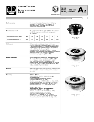 GESTRA® DISCO RK 49 DN 15 – 200 mm PN 64/100/160 Zawory zwrotne RK 49 Wydanie 10/02 Zastosowanie Do pracy w instalacjach z czynnikami ciekłymi, gazowymi i w postaci par, w rurociągach dla wszystkich gałęzi przemysłu, przy wysokich ciśnieniach i temperaturach. Granice stosowania Dla nadciśnienia roboczego do 160 bar i temperatur do 550oC. Stopniowanie ciśnienia i temperatury wg DIN 2401. Nadciśnienie robocze [bar] 160 153 146 139 118 79 35 Temperatura robocza [°C] 300 350 400 450 500 520 550 Wykonanie Wykonanie do montażu pomiędzy kołnierzami o krótkich długościach zabudowy wg DIN 3202, Część 3, Szereg K5 (zawory DISCO montuje się pomiędzy dwoma kołnierzami przez zaciśnięcie przy pomocy śrub dwóch końcówek rurociągów). Zawory DISCO w wielkościach DN 15 – 100 dla ułatwienia montaż wyposażone są w spiralny pierścień centrujący zawór w osi rurociągu pomiędzy kołnierzami z przylgami wg DIN i ANSI. Rodzaj przyłączy Wykonania między kołnierzowe, generalnie pasują dla przeciw kołnierzy z przylgami wg DIN i ANSI: PN 64/100/160 i ANSI 400 RF/600 RF/ 900 RF. Inne możliwości przyłączy na zapytanie, np. z powierzchniami przylgowymi pasującymi dla przeciw kołnierzy do wyboru wg DIN 2512, DIN 2513, ANSI 400RJ, ANSI 600RJ, ANSI 900RJ. Montaż W dowolnym położeniu pod warunkiem zamontowania zaworu zgodnie z właściwym kierunkiem przepływu czynnika. Materiały DN 15 – 65 mm. Wykonanie ze staliwa austenitycznego/ żaroodpornego: Korpus, gniazdo, prowadnice, wkładka: G-X 7 CrNiMoNb 18 10 (1.4581). Grzybek talerzowy: X 8 CrNiMoBNb 16 16 (1.4986). Sprężyna zamykająca: NiCr 20 Co 18 Ti (2.4632). Pierścień osadczy: X 10 CrNiMoTi 18 10 (1.4571). Pierścień centrujący: X 12 CrNi 17 7 (1.4310). DN 80 – 200 mm. Wykonanie ze staliwa żaroodpornego: Korpus: GS-17 CrMo 5 5 (1.7357). Gniazdo, utwardzane: S-NiCr 20 Nb (2.4806). Grzybek: X 20 CrMoV 12 1 (1.4922). Czop: X 8 CrNiMoBNb 16 16 (1.4986). Wkładka: G-X 7 CrNiMoNb 18 10 (1.4581). Sprężyna zamykająca: NiCr 20 Co 18 Ti (2.4632). Pierścień osadczy: X 10 CrNiMoTi 18 10 (1.4571). A2 A2 RK 49 DN 15 – 200 PN 64/100/160 __________________________________________________________________________________________________________________ Wymiary Wykres spadku ciśnienia Ciśnienia otwarcia Krzywe pokazane na wykresie odnoszą do wody w temperaturze 20°C. Aby odczytać na wykresie wartość spadku ciśnienia dla innego czynnika, należy z zamieszczonego poniżej wzoru wyznaczyć równoważne objętościowe natężenie przepływu wody i na tej podstawie wyznaczyć spadek ciśnienia. Ciśnienia różnicowe przy zerowym przepływie objętościowym. DN Ciśnienie otwarcia w [mbar] mm Kierunek przepływu przez zawór bez ze sprężyną sprężyny ↑ → ↓ ↑ 15 16,5 73 56,5 40 20 17,0 74 57,0 40 25 18,0 76 58,0 40 32 18,0 76 58,0 40 40 19,5 79 59,5 40 50 22,0 84 62,0 40 65 23,0 87 63,0 40 80 17,5 75 57,5 40 100 20,0 80 60,0 40 125 23,0 86 63,0 40 150 24,0 88 64,0 40 200 29,0 98 69,0 40 Vw = V x ρ 1000 Vw = równoważne objętościowe natężenie przepływu wody w l/s lub m3/h. ρ = gęstość czynnika (w warunkach roboczych) w kg/m3. V = objętościowe natężenie przepływ czynnika (w warunkach roboczych) w l/s lub m3/h. Sprężyny specjalne na określone wartości ciśnień otwierania – na zapytanie ofertowe, za dodatkową opłatą. Tekst dla celów ofertowych [mm] 15 20 25 32 40 50 65 80 100 125 150 200 Wymiary D L*) [mm] [mm] 25 54 31,5 63 35,5 74 40 84 45 95 56 110 63 130 71 147 80 173 110 209 125 245 160 301 Ciężar [kg] 0,43 0,7 1 1,4 2 3 4,7 7,1 12,1 18,2 29,4 47,5 *) Długość zabudowy wg DIN 3202, Część 3, Szereg K 5. Dane do zamawiania Typ, ciśnienie nominalne, średnica nominalna, rodzaj przyłączy, czynnik, natężenie przepływu, ciśnienie i temperatura robocze. Przepływ DN Zawory zwrotne RK 49 DN 15 – 200 w wykonaniu między kołnierzowym dla krótkiej długości zabudowy, przystosowane do montażu między kołnierzami rurociągu wg DIN i ANSI. Dane: ciśnienie nominalne, średnica nominalna, rodzaj przyłączy, materiał. Spadek ciśnienia Wartości na wykresie oparte są na pomiarach przeprowadzonych na zaworach ze sprężyną w poziomym położeniu montażowym. W przypadku pionowego położenia montażowego zaworu wartości odczytane z wykresu wykazują pomijalnie małe różnice względem wartości rzeczywistych w obszarze otwarcia częściowego. Dostawa wg naszych Ogólnych Warunków Dostawy Zastrzega się prawo do wprowadzania zmian konstrukcji i danych technicznych. Uwaga Instalacje wykazujące tendencję do drgań i pulsacji, np. ze sprężarkami, wymagają m. in. stosowania specjalnych wykonań zaworów zwrotnych. Przy zamawianiu należy informowac o tego typu przypadkach podając możliwie najdokładniejsze dane robocze. Zawory w wykonaniu z materiałów innych niż standardowe, jak również przystosowane do montażu z wykorzystaniem innego rodzaju przyłączy – za dopłatą.