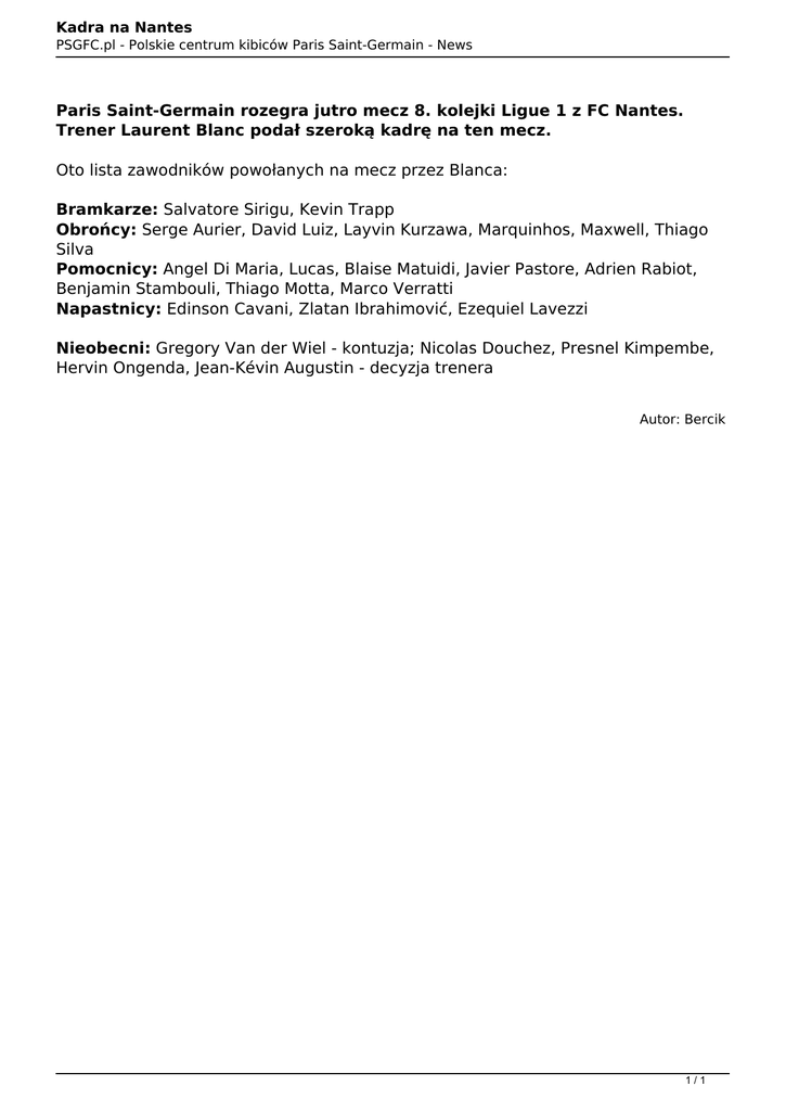 Kadra na Nantes PSGFC.pl - Polskie centrum kibiców Paris Saint-Germain - News Paris Saint-Germain rozegra jutro mecz 8. kolejki Ligue 1 z FC Nantes. Trener Laurent Blanc podał szeroką kadrę na ten mecz. Oto lista zawodników powołanych na mecz przez Blanca: Bramkarze: Salvatore Sirigu, Kevin Trapp Obrońcy: Serge Aurier, David Luiz, Layvin Kurzawa, Marquinhos, Maxwell, Thiago Silva Pomocnicy: Angel Di Maria, Lucas, Blaise Matuidi, Javier Pastore, Adrien Rabiot, Benjamin Stambouli, Thiago Motta, Marco Verratti Napastnicy: Edinson Cavani, Zlatan Ibrahimović, Ezequiel Lavezzi Nieobecni: Gregory Van der Wiel - kontuzja; Nicolas Douchez, Presnel Kimpembe, Hervin Ongenda, Jean-Kévin Augustin - decyzja trenera Autor: Bercik 1/1 Powered by TCPDF (www.tcpdf.org)