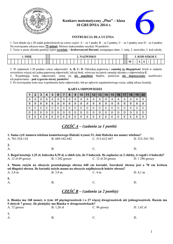Konkurs matematyczny „Plus” – klasa 10 GRUDNIA 2014 r. INSTRUKCJA DLA UCZNIA 1. Test składa się z 20 zadań podzielonych na cztery części: A – za 1 punkt, B – za 2 punkty, C – za 3 punkty oraz D – za 4 punkty. Na rozwiązanie arkusza masz 75 minut. Możesz maksymalnie uzyskać 50 punktów. 2. Teraz w puste okienka poniżej wpisz czytelnie – drukowanymi literami, następujące dane: 1. imię, 2. nazwisko, 3. kod szkoły. 1. IMIĘ 2. NAZWISKO 3. KOD SZKOŁY M - 4 6 / 3. W zadaniach 1-20 podano cztery odpowiedzi: A, B, C, D. Odszukaj poprawną i zamaluj ją długopisem! Jeżeli w zadaniu stwierdzisz więcej niż jedną poprawną odpowiedź, lub jej brak, wówczas na karcie zamaluj okienko z odpowiedzią E. 4. Wypełniając kartę odpowiedzi, staraj się nie popełniać błędów, ponieważ nie dopuszczamy możliwości ich poprawiania – pod rygorem utraty punktów! 5. Po rozwiązaniu testu oraz wypełnieniu karty odpowiedzi, lub po upływie regulaminowego czasu, oddaj arkusz komisji. KARTA ODPOWIEDZI 1 2 3 4 5 6 7 8 9 10 11 12 13 14 15 16 17 18 19 20 A A A A A A A A A A A A A A A A A A A A B B B B B B B B B B B B B B B B B B B B C C C C C C C C C C C C C C C C C C C C D D D D D D D D D D D D D D D D D D D D E E E E E E E E E E E E E E E E E E E E CZĘŚĆ A – (zadania za 1 punkt) 1. Suma cyfr numeru telefonu komórkowego Halszki wynosi 33. Jaki Halszka ma numer telefonu? A. 781-524-134 B. 609-342-442 C. 513-612-447 D. 512-341-781 2. A. B. C. D. 3. Rogal kosztuje 1,25 zł, bułeczka 0,39 zł, a chleb tyle, ile 5 bułeczek. Ile zapłacisz za 2 chleby, 6 rogali i 4 bułeczki? A. 12 zł 69 groszy B. 1 242 grosze C. 12 zł 24 grosze D. 1 296 groszy 4. Mama zużyła na obszycie prostokątnego obrusa 640 cm koronki. Szerokość obrusa jest o 70 cm krótsza od długości obrusa. Ile koronki zużyła mama na obszycie najdłuższych boków obrusa? A. 3,8 m B. 3,9 m C. 4 m D. 4,1 m 5. A. B. C. D. CZĘŚĆ B – (zadania za 2 punkty) 6. Bianka ma 168 monet, w tym: 69 pięciogroszówek i o 27 więcej dwugroszówek niż jednogroszówek. Razem ma 5 złotych 7 groszy. Ile pieniędzy ma Bianka w dwugroszówkach? A. 72 grosze B. 1,26 zł C. 96 groszy D. 1,62 zł 7. A. B. C. D. 1 8. Tomek miał 280 zł. ¼ tej kwoty przeznaczył na zakup koszuli. Za ½ pozostałej kwoty kupił spodnie. 85 zł wydał na buty. Za resztę pieniędzy kupił 8 paczek chipsów. Ile kosztowała paczka chipsów? A. 2,50 zł B. 2,75 zł C. 3 zł D. 3,25 zł 9. A. B. C. D. 10. A. B. C. D. CZĘŚĆ C – (zadania za 3 punkty) 11. A. B. C. D. 12. Igor przeczytał już 131 stron lektury. Jeśli w ciągu następnego tygodnia codziennie przeczyta 19 stron, to przeczyta całą lekturę. Ile stron ma lektura, którą czyta Igor? A. 254 B. 245 C. 264 D. 246 13. A. B. C. D. 14. Jubiler w 2 gablotach trzymał 136 kamieni szlachetnych, w tym: diamenty, 54 szmaragdy, 43 rubiny i 32 szafiry. Ile diamentów było w obu gablotach? A. 14 B. 7 C. 16 D. 8 15. A. B. C. D. CZĘŚĆ D – (zadania za 4 punkty) 16. Z Malborka do kopalni soli w Wieliczce przyjechało 138 uczniów oraz 9 ich opiekunów. Jeden przewodnik może zaopiekować się grupą 12 uczniów. Ilu przewodników będzie oprowadzało po kopalni grupę z Malborka? A. jedenastu B. dwunastu C. trzynastu D. czternastu 17. A. B. C. D. 18. W jednym opakowaniu jest 80 klocków. Kornel dostał 3 opakowania klocków. Z 96 klocków zbudował dwa piętrowe garaże. Pozostałe klocki podzielił na 6 równych części i z każdej ułożył samochód. Z ilu klocków był zbudowany każdy samochód? A. z dwudziestu czterech B. z czternastu C. z czterdziestu ośmiu D. z czterdziestu 19. A. B. C. D. 20. Trzy piłki kosztują razem 294 zł. Cena piłki do siatkówki stanowi ¾ ceny piłki do nogi, która kosztuje 96 zł. Piłka koszykowa jest o ¾ droższa od piłki siatkowej. O ile złotych piłka do siatkówki jest tańsza od piłki koszykowej? A. o 30 zł B. o 24 zł C. o 54 zł D. o 42 zł 2