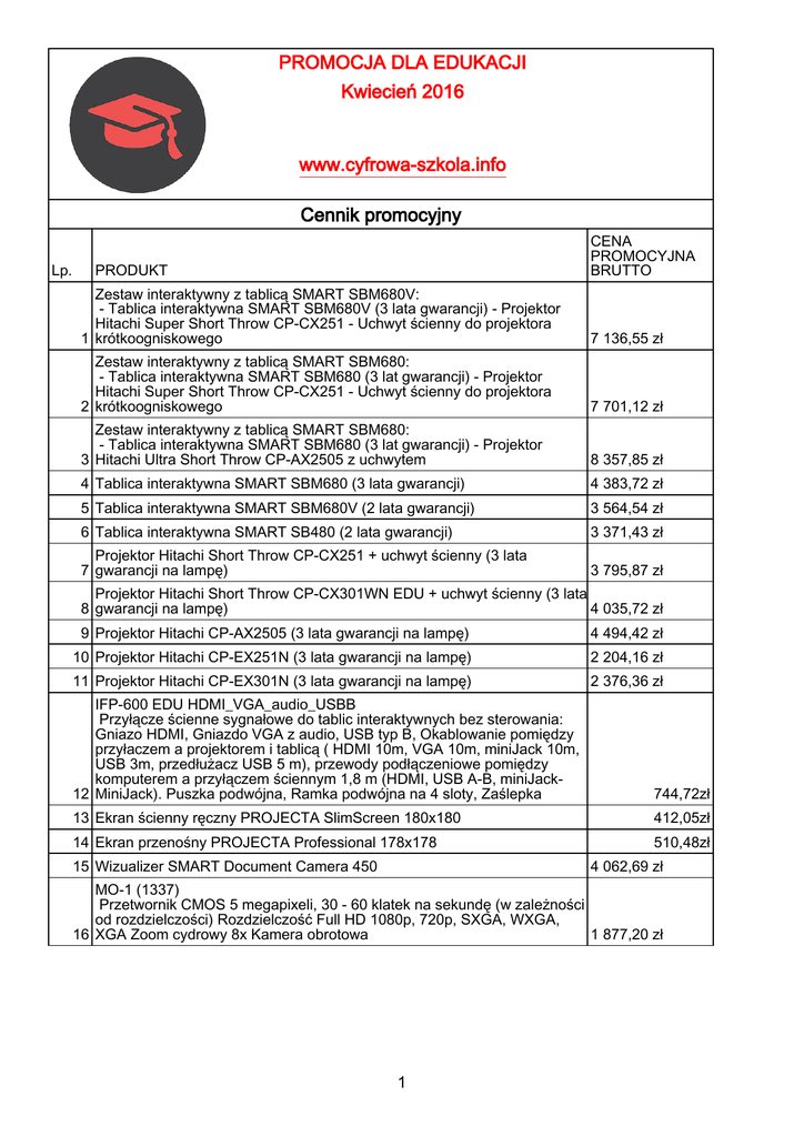 PROMOCJA DLA EDUKACJI Kwiecień 2016 www.cyfrowa-szkola.info Cennik promocyjny Lp. CENA PROMOCYJNA BRUTTO PRODUKT Zestaw interaktywny z tablicą SMART SBM680V: - Tablica interaktywna SMART SBM680V (3 lata gwarancji) - Projektor Hitachi Super Short Throw CP-CX251 - Uchwyt ścienny do projektora 1 krótkoogniskowego 7 136,55 zł Zestaw interaktywny z tablicą SMART SBM680: - Tablica interaktywna SMART SBM680 (3 lat gwarancji) - Projektor Hitachi Super Short Throw CP-CX251 - Uchwyt ścienny do projektora 2 krótkoogniskowego 7 701,12 zł Zestaw interaktywny z tablicą SMART SBM680: - Tablica interaktywna SMART SBM680 (3 lat gwarancji) - Projektor 3 Hitachi Ultra Short Throw CP-AX2505 z uchwytem 8 357,85 zł 4 Tablica interaktywna SMART SBM680 (3 lata gwarancji) 4 383,72 zł 5 Tablica interaktywna SMART SBM680V (2 lata gwarancji) 3 564,54 zł 6 Tablica interaktywna SMART SB480 (2 lata gwarancji) 3 371,43 zł Projektor Hitachi Short Throw CP-CX251 + uchwyt ścienny (3 lata 7 gwarancji na lampę) 3 795,87 zł Projektor Hitachi Short Throw CP-CX301WN EDU + uchwyt ścienny (3 lata 8 gwarancji na lampę) 4 035,72 zł 9 Projektor Hitachi CP-AX2505 (3 lata gwarancji na lampę) 4 494,42 zł 10 Projektor Hitachi CP-EX251N (3 lata gwarancji na lampę) 2 204,16 zł 11 Projektor Hitachi CP-EX301N (3 lata gwarancji na lampę) 2 376,36 zł IFP-600 EDU HDMI_VGA_audio_USBB Przyłącze ścienne sygnałowe do tablic interaktywnych bez sterowania: Gniazo HDMI, Gniazdo VGA z audio, USB typ B, Okablowanie pomiędzy przyłaczem a projektorem i tablicą ( HDMI 10m, VGA 10m, miniJack 10m, USB 3m, przedłużacz USB 5 m), przewody podłączeniowe pomiędzy komputerem a przyłączem ściennym 1,8 m (HDMI, USB A-B, miniJack12 MiniJack). Puszka podwójna, Ramka podwójna na 4 sloty, Zaślepka 744,72zł 13 Ekran ścienny ręczny PROJECTA SlimScreen 180x180 412,05zł 14 Ekran przenośny PROJECTA Professional 178x178 510,48zł 15 Wizualizer SMART Document Camera 450 4 062,69 zł MO-1 (1337) Przetwornik CMOS 5 megapixeli, 30 - 60 klatek na sekundę (w zależności od rozdzielczości) Rozdzielczość Full HD 1080p, 720p, SXGA, WXGA, 16 XGA Zoom cydrowy 8x Kamera obrotowa 1 877,20 zł 1 L-12iD (1337) Przetwornik CMOS 3,4 megapixeli, 30 klatek na sekundę Rozdzielczość Full HD 1080p, 720p, SXGA, WXGA, XGA Zoom optyczny 12x Zoom cydrowy 8x Kamera obrotowa Możliwośc podłaczenia do sieci Komunikancja z tabletem CRA-1 do robienia notatek cyfrowych bez 17 komputera 3 482,07 zł Zestaw startowy PASCO PS-2401 - Oprogramowanie SPARKvue do interaktywnej wizualizacji i analiz - licencja typu single user PS-2009A - Interfejs SPARKlink PS-2102 - PASPORT Czujnik pH PS-2103A - PASPORT Czujnik ruchu PS-2110 18 PASPORT Czujnik dwutlenku węgla 4 202,48 zł ZESTAW PROMOCYJNY BALANCEBOX Balancebox 40-70 kg (485A02) Uniwersalna płyta do projektorów ultra krótkoogniskowych (481A38) Rama mocująca do SMARTBoard (481A24) 19 Uchwyty boczne (481A26) 3 439,08 zł Cennik ma charakter informacyjny i nie stanowi oferty w myśl Kodeksu Cywilnego. Cennik anuluje wszystkie poprzednie cenniki Podane ceny nie uwzgledniają kosztów transportu Specyfikacja produktów podana jest orientacyjnie i może ulec zmianie bez powiadomienia 2