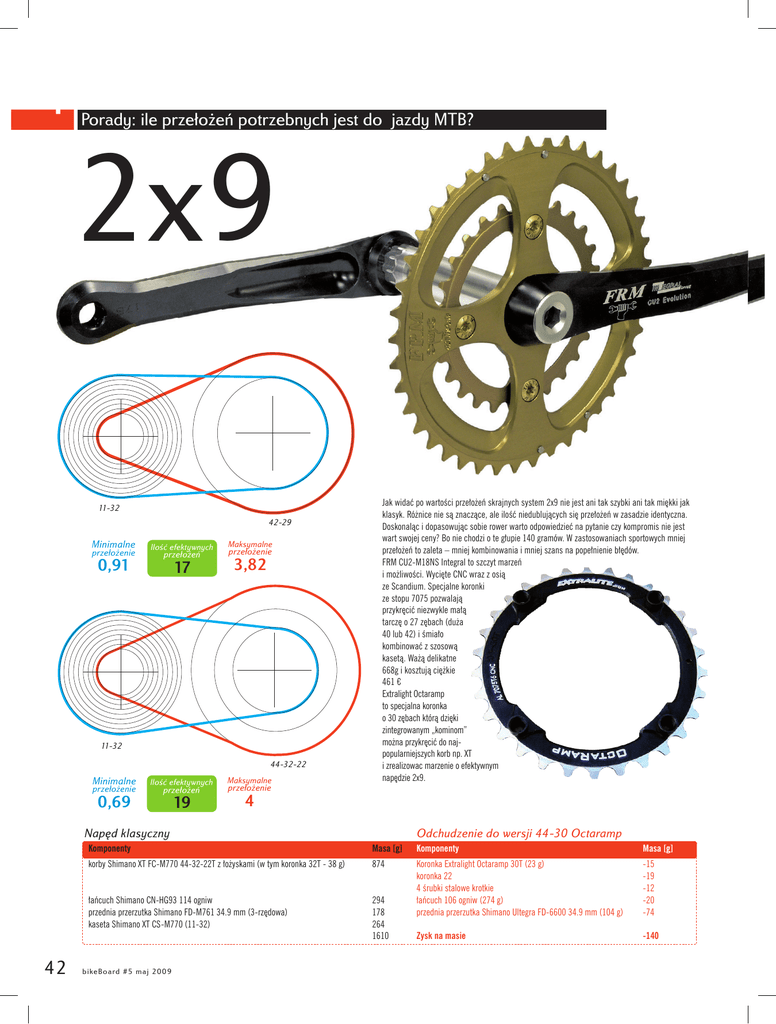 Porady: ile przełożeń potrzebnych jest do jazdy MTB? 2x9 11-32 42-29 Minimalne przełożenie Ilość efektywnych Maksymalne 17 3,82 Ilość efektywnych Maksymalne przełożeń przełożenie 19 4 przełożeń 0,91 przełożenie 11-32 44-32-22 Minimalne przełożenie 0,69 Jak widać po wartości przełożeń skrajnych system 2x9 nie jest ani tak szybki ani tak miękki jak klasyk. Różnice nie są znaczące, ale ilość niedublujących się przełożeń w zasadzie identyczna. Doskonaląc i dopasowując sobie rower warto odpowiedzieć na pytanie czy kompromis nie jest wart swojej ceny? Bo nie chodzi o te głupie 140 gramów. W zastosowaniach sportowych mniej przełożeń to zaleta – mniej kombinowania i mniej szans na popełnienie błędów. FRM CU2-M18NS Integral to szczyt marzeń i możliwości. Wycięte CNC wraz z osią ze Scandium. Specjalne koronki ze stopu 7075 pozwalają przykręcić niezwykle małą tarczę o 27 zębach (duża 40 lub 42) i śmiało kombinować z szosową kasetą. Ważą delikatne 668g i kosztują ciężkie 461 € Extralight Octaramp to specjalna koronka o 30 zębach którą dzięki zintegrowanym „kominom” można przykręcić do najpopularniejszych korb np. XT i zrealizowac marzenie o efektywnym napędzie 2x9. Napęd klasyczny 42 Odchudzenie do wersji 44-30 Octaramp Komponenty Masa [g] Komponenty Masa [g] korby Shimano XT FC-M770 44-32-22T z łożyskami (w tym koronka 32T - 38 g) 874 łańcuch Shimano CN-HG93 114 ogniw przednia przerzutka Shimano FD-M761 34.9 mm (3-rzędowa) kaseta Shimano XT CS-M770 (11-32) 294 178 264 1610 Koronka Extralight Octaramp 30T (23 g) koronka 22 4 śrubki stalowe krotkie łańcuch 106 ogniw (274 g) przednia przerzutka Shimano Ultegra FD-6600 34.9 mm (104 g) -15 -19 -12 -20 -74 Zysk na masie -140 bikeBoar d #5 maj 2009 Ostatnio znowu zrobiło się głośno wokół tego wynalazku - m.in. za sprawą przecieków dotyczących nowej grupy Sram XX. J ej sportowy charakter ujawnić się ma przede wszystkim poprzez 10 przełożeń z tyłu… oraz 2 z przodu. To jest przyszłość - a co z teraźniejszością? System 2-rzędowych korb nie jest żadnym odkrywaniem Ameryki - od dziesiątek lat stosują go przecież szosowcy, a i wyczynowi „górale” od czasu do czasu zaskakują śmiertelników takim samoograniczeniem. Ze współczesnej czołówki zainteresowanie technicznymi detalami 2x9 wykazują takie tuzy jak choćby Jose Antonio Hermida (Merida dawny Multi Van), Christopher Sauser (Specialized), czy Julien Absalon (Orbea). Panów tych oprócz wielkiej łydy charakteryzuje ciągłe poszukiwanie nowych rozwiązań, pomagających w osiągnięciu zwycięstwa. Dlatego eksperymentują i m. in. dzięki im podobnym możemy przekazać wam dość danych, byście sami mogli ocenić, na ile rozwiązanie 2x9 jest warte uwagi. Na wstępie pytanie - ile przełożeń ma standardowy zestaw korb MTB wraz z kasetą (również standard) 11-32? 27-tak, jak twierdzą reklamy w katalogach rowerowych? Otóż jest ich 19!!! (23, jeśli być ścisłym do 3 miejsc po przecinku). Obaliliśmy zatem pewien mit, ale co z tego? Nic nie zmieni faktu, iż 22-32-44 to najpopularniejsze i bardzo uniwersalne korby, najprawdopodobniej 90% z Was posiada takie w swoim rowerze. Również kasety 11-32 i 12-34 to pewnego rodzaju kompromis podparty wieloma latami testów i zdobytym w ten sposób doświadczeniem. Czemu taki potentat jak SRAM miałby utrudniać sobie życie i wprowadzać udziwnienia do standardu? Dlaczego Zawodnicy wybierają 2x9? Co kryje w sobie ten kod powtarzany w artykule jak mantra? 2x9 to przede wszystkim prostota - z przodu tylko dwie koronki, a łańcuch ma do obsłużenia mniejszą różnicę - może więc być krótszy. Zmiana biegów, z uwagi na brak jednej tarczy, z samej natury rzeczy odbywa się z przodu szybciej. Wymusza ponadto korzystanie z całego zakresu kasety do tego stopnia, że codziennością staje się jazda na skrajnych 1x9/2x1 (tu decydującą kwestią stanie się długość ośki, kwestie linii łańcucha i rozstawu pedałów Q factor zostawmy na kiedy indziej). W korbach 3-rzędowych jest to, jak wiemy, raczej niewskazane, ze względu na przyspieszenie zużycia ząbków kasety, korb oraz łańcucha, a także zwiększenie niebezpieczeństwa zerwania/skrzywienia łańcucha przy zbyt dużym „skrzyżowaniu” i obciążeniu. Zatem podjazdy robi się z blatu… albo podbiega? Po części tak - w zależności od poziomu wytrenowania i „pary” - można walczyć do oporu, choć lepiej zeskoczyć, w końcu rowery zawodników do ciężkich nie należą. Po lewej przedstawiamy wyliczenie dla standardowego rozwiązania, nie wymagającego zmiany korb, a jedynie przedniej przerzutki oraz średniej tarczy na system Octaramp, własność Extralight. Patent pozwala zamontować na miejsce średniej tarczy - 30-zębową wersję zamiast standardu 32. Przy okazji można zmienić przednią przerzutkę na wersję down swing (jest lżejsza i działa bardzo dobrze w takim systemie) lub w wersji ekstremalnej - przerzutkę na szosową (u nas Ultegra 6600 z obejmą). W ten sposób, skracając dodatkowo łańcuch - zyskujemy ok. 140 g. Oczywiście są sposoby, by ta liczba jeszcze zmalała, jednak wymagają one większego wkładu (finansowego - m.in. blat zewnętrzny również wysokiej klasy typu Specialites TA, Stronglight Chinook, śruby z kominami lżejszych wytwórców jak Token). Zysk w zawodniczych rowerach, gdzie montowane są korby dedykowane pod 2-tarcze, oraz odchudzone kasety, łańcuchy i zamienione manetki na gripshift (zapewniają najlepszą współpracę, ze względu na microindex lewej manetki), może sięgnąć ok. 7% całości. Nie należy zatem go lekceważyć. W standardowym sprzęcie, jaki posiada większość z nas, będzie to zaledwie 1-2% masy całkowitej roweru. Wspomnieliśmy wcześniej o niemal ośmiu przełożeniach, które faktycznie są w naszym napędzie zdublowane. 2x9 w najbardziej powszechnej odmianie (korby 42/29 i kaseta