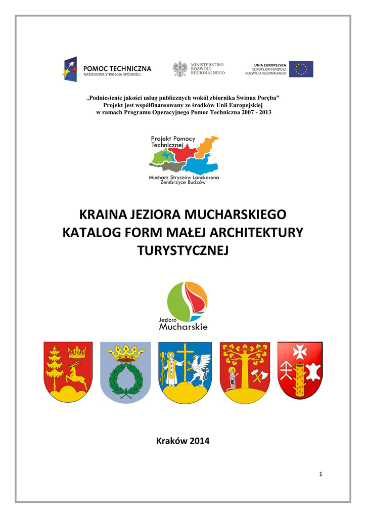 „Podniesienie jakości usług publicznych wokół zbiornika Świnna Poręba” Projekt jest współfinansowany ze środków Unii Europejskiej w ramach Programu Operacyjnego Pomoc Techniczna 2007 - 2013 KRAINA JEZIORA MUCHARSKIEGO KATALOG FORM MAŁEJ ARCHITEKTURY TURYSTYCZNEJ Kraków 2014 1 Wykonawca opracowania: Fundacja Miejsc i Ludzi Aktywnych ul. Dolnych Młynów 7/6 31-124 Kraków Koordynacja prac: dr inż. arch. Krzysztof Wielgus, Instytut Architektury Krajobrazu, Politechniki Krakowskiej Wykonanie prac studialnych i projektowych i projektowych z dziedziny architektury krajobrazu oraz teorii turystyki kulturowej: dr inż. arch. Krzysztof Wielgus dr inż. arch. Jadwiga Środulska-Wielgus mgr inż. arch. kraj. Marta Chrząszczyk inż. arch. kraj. Patrycja Urbańczyk, Instytut Architektury Krajobrazu, Politechniki Krakowskiej Opracowanie dotyczące uwarunkowań geograficznych i historycznych: dr Piotr Sadowski, Podhalańska Wyższa Szkoła Zawodowa w Nowym Targu Niniejsze opracowanie stanowi I etap prac wynikających z zadania „Opracowanie logicznie ze sobą powiązanych dokumentów o zbiorczej nazwie Dokumenty planistyczne, ekspertyzy i analizy w zakresie turystyki na terenie 5 gmin położonych w obszarze Zbiornika Świnna Poręba” określonego w umowie nr 154/RO10/2013 z dnia 10.04.2013 r. podpisanej w ramach wdrażania projektu „Podniesienie jakości usług publicznych wokół Zbiornika Świnna Poręba”. 2 SPIS TREŚCI: I. WSTĘP ………………………………………………………………………………………………………………………………………. 4 I.1. Przedmiot, cel, misja, metoda opracowania, zakres, podstawa pracy…………………………………..…….. 4 I.2. Wykaz etapów pracy w celu stworzenia właściwego katalogu form zagospodarowania turystycznego gmin Jeziora Mucharskiego – część ogólna ………………………..………………………….………….. 4 II. UWARUNKOWANIA GEOGRAFICZNE, HISTORYCZNE I WERNAKULARNE DLA ELEMENTÓW UDOSTĘPNIENIA TURYSTYCZNEGO GMIN JEZIORA MUCHARSKIEGO ………………………………………….… 5 II.1. Zasada kształtowania nowych form architektonicznych wyposażenia turystycznego gmin: Budzów, Lanckorona, Mucharz. Stryszów i Zembrzyce …………………………………………………………………….. 5 II.2. Tożsamość krajobrazu gmin Jeziora Mucharskiego. Geologia, historia, formy architektoniczne … 5 III. KIERUNKI I ZAŁOŻENIA KSZTAŁTOWANIA SYSTEMU PRZYSTANKÓW TURYSTYCZNYCH W KRAJOBRAZIE GMIN OBSZARU WOKÓŁ ZBIORNIKA JEZIORA MUCHARSKIEGO I TERENÓW PRZYLEGŁYCH - GMINY BUDZÓW, LANCKORONA, MUCHARZ. STRYSZÓW I ZEMBRZYCE. IDEA I KONCEPCJA PROJEKTU ……………………………………………………………………………………………………….…….. 11 III.1. Założenia organizacyjne …………………………………………………………………………………..……………..……... 11 III.2. Założenia edukacyjne ……………………………………………………………………………………………….…….………. 11 III.3. Założenia promocyjne …………………………………………………………………………………………………………….. 12 III.4. Założenia ochronne ……………………………………………………………………………………………………….……….. 13 III.5. Założenia kompozycyjne …………………………………………………………………….…………………………………… 16 IV. OPIS PROPONOWANYCH FORM MAŁEJ ARCHITEKTURY ………………………………………………………… 19 IV.1.Słupek szlakowy …………………………………………………………………………………………………………….………… 19 IV.2. Drogowskaz ……………………………………………………………………………………………….…………………………… 19 IV.3. Stojak dla rowerów ………………………………………………………………………………………………………………... 19 IV.4. Ławka ……..…………………………………………………………………………………………………….……………………….. 19 IV.5. Tablica pionowa ….…………………………………………………………………………………………………………………. 20 IV.6. Tablica pulpitowa informacyjna ……………………………………………………………………………………………... 20 Przewidywane większe elementy architektoniczno-konstrukcyjne IV.7. System pomostów ………………………………………………………………………………….………………………………. 20 IV.8. Wieża widokowa …………………………………………………………………………………………………………..……….. 21 IV.9. System udostępnienia Twierdzy Lanckorona ………………………………………………………………………….. 21 Inne proponowane większe elementy architektoniczno-konstrukcyjne. IV.10. Schron przeciwdeszczowy ……………………………………………………………………………………………………. 22 IV.11. System udostępnienie zabytków i obiektów inżynieryjnych (m.in. kolei) ……………………….…..… 22 V. ZAKOŃCZENIE ……………………………………………………………………………………………………………………….. 24 VI. ZAŁĄCZNIKI ……………………………………………………………………………………………………………………….…. 25 3 I. WSTĘP I.1. PRZEDMIOT, CEL, MISJA, METODA, ZAKRES TERYTORIALNY, ZAKRES 