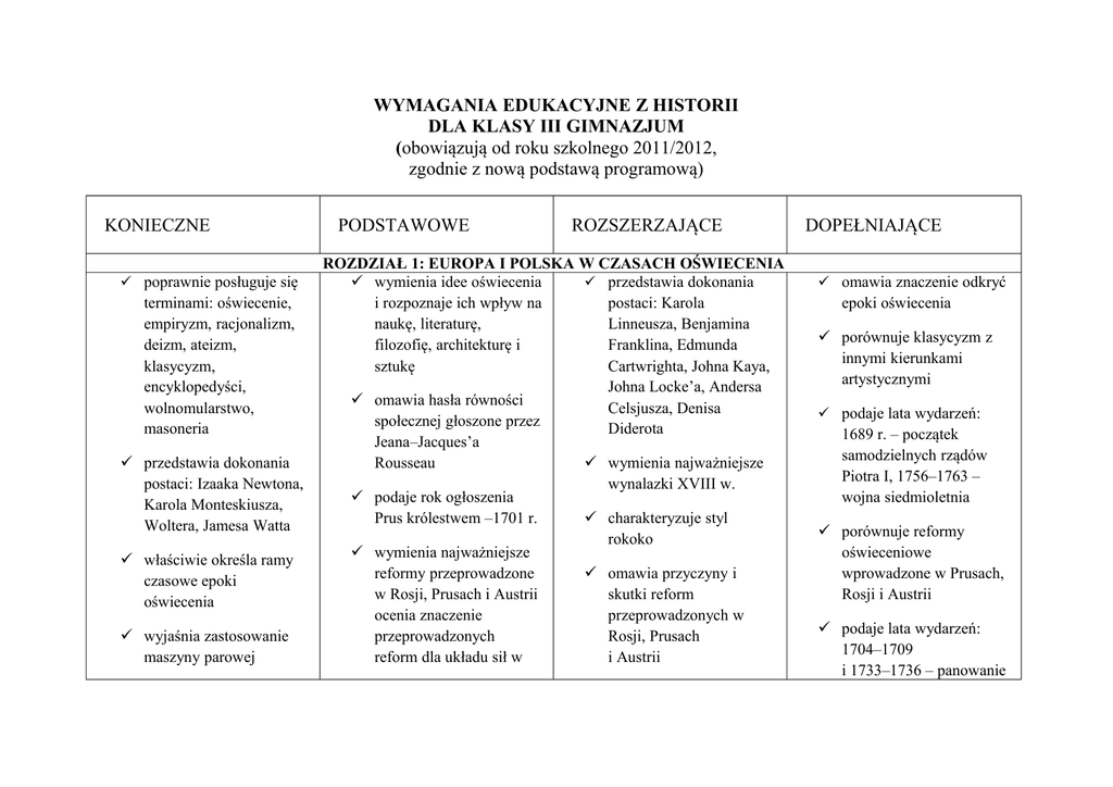 WYMAGANIA EDUKACYJNE Z HISTORII DLA KLASY III GIMNAZJUM (obowiązują od roku szkolnego 2011/2012, zgodnie z nową podstawą programową) KONIECZNE poprawnie posługuje się terminami: oświecenie, empiryzm, racjonalizm, deizm, ateizm, klasycyzm, encyklopedyści, wolnomularstwo, masoneria przedstawia dokonania postaci: Izaaka Newtona, Karola Monteskiusza, Woltera, Jamesa Watta właściwie określa ramy czasowe epoki oświecenia wyjaśnia zastosowanie maszyny parowej PODSTAWOWE ROZSZERZAJĄCE ROZDZIAŁ 1: EUROPA I POLSKA W CZASACH OŚWIECENIA wymienia idee oświecenia przedstawia dokonania i rozpoznaje ich wpływ na postaci: Karola naukę, literaturę, Linneusza, Benjamina filozofię, architekturę i Franklina, Edmunda sztukę Cartwrighta, Johna Kaya, Johna Locke’a, Andersa omawia hasła równości Celsjusza, Denisa społecznej głoszone przez Diderota Jeana–Jacques’a Rousseau wymienia najważniejsze wynalazki XVIII w. podaje rok ogłoszenia Prus królestwem –1701 r. charakteryzuje styl rokoko wymienia najważniejsze reformy przeprowadzone omawia przyczyny i w Rosji, Prusach i Austrii skutki reform ocenia znaczenie przeprowadzonych w przeprowadzonych Rosji, Prusach reform dla układu sił w i Austrii DOPEŁNIAJĄCE omawia znaczenie odkryć epoki oświecenia porównuje klasycyzm z innymi kierunkami artystycznymi podaje lata wydarzeń: 1689 r. – początek samodzielnych rządów Piotra I, 1756–1763 – wojna siedmioletnia porównuje reformy oświeceniowe wprowadzone w Prusach, Rosji i Austrii podaje lata wydarzeń: 1704–1709 i 1733–1736 – panowanie charakteryzuje zasadę trójpodziału władzy sformułowaną przez Monteskiusza poprawnie posługuje się terminami: junkrzy, absolutyzm oświecony wskazuje na mapie Rosję, Prusy i monarchię austriacką poprawnie posługuje się terminami: wojna północna, Sejm Niemy wskazuje na mapie zasięg terytorialny Rzeczypospolitej za panowania Sasów charakteryzuje skutki wojny północnej dla Polski poprawnie posługuje się terminami: Familia, konfederacja barska, sejm rozbiorowy, Rada Nieustająca omawia okoliczności Europie XVIII w. podaje lata wydarzeń: 1697 r. – koronacja Augusta II Mocnego, 1699 r. – pokój w Karłowicach, 1717 r. – Sejm Niemy, 1763 r. – śmierć Augusta III Sasa przedstawia dokonania postaci: Augusta II Mocnego, Augusta III Sasa, Stanisława Leszczyńskiego wymienia przyczyny i przejawy kryzysu państwa polskiego w czasach saskich wyjaśnia zmiany położenia międzynarodowego Rzeczypospolitej w XVIII w. podaje lata wydarzeń: 1764 r. – koronacja Stanisława Augusta Poniatowskiego, 1772 r. – charakteryzuje rozwój terytorialny Rosji, Prus i monarchii austriackiej poprawnie posługuje się terminami: konfederacja warszawska, konfederacja sandomierska, Order Orła Białego wyjaśnia okoliczności elekcji Augusta II Mocnego szczegółowo omawia znaczenie oraz skutki wojny północnej opisuje przebieg wojny północnej poprawnie posługuje się terminami: konfederacja słucka, konfederacja toruńska, konfederacja radomska, prawa kardynalne, ryngraf, innowierca przedstawia rolę postaci: Stanisława Leszczyńskiego, 1709 r. – bitwa pod Połtawą, 1721 r. – pokój w Nystad, 1736 r. – sejm pacyfikacyjny analizuje politykę wewnętrzną i zewnętrzną Wettinów ocenia rządy Wettinów w Rzeczypospolitej charakteryzuje przyczyny wzrostu nietolerancji religijnej w Polsce wymienia pozytywne i negatywne następstwa unii polsko-saskiej podaje rok zawiązania konfederacji barskiej – 1768 r. omawia reformy sejmu konwokacyjnego podaje lata wydarzeń: 1740 r. – utworzenie Collegium Nobilium, elekcji Stanisława Augusta Poniatowskiego wymienia przyczyny i skutki pierwszego rozbioru poprawnie posługuje się terminami: Collegium Nobilium, Szkoła Rycerska, Komisja Edukacji Narodowej, Towarzystwo do Ksiąg Elementarnych, oświecenie stanisławowskie rozpoznaje charakterystyczne cechy polskiego oświecenia pierwszy rozbiór Polski przedstawia rolę postaci: Tadeusza Rejtana, Mikołaja Repnina wskazuje na mapie zmiany terytorialne po pierwszym rozbiorze Polski podaje lata wydarzeń: 1765 r. – utworzenie Szkoły Rycerskiej, 1773 r. – powołanie Komisji Edukacji Narodowej przedstawia dokonania postaci: Stanisława Konarskiego, Stanisława Leszczyńskiego, Ignacego Krasickiego, Stanisława Staszica, Hugona Kołłątaja, Bernarda Bellotta zwanego Canalettem, Dominika Merliniego charakteryzuje projekty reform ustrojowych Maurycego Beniowskiego, Kajetana Sołtyka, Józefa Andrzeja Załuskiego, Wacława Rzewuskiego, Józefa Pułaskiego, Michała Krasińskiego poprawnie posługuje się terminami: Biblioteka Załuskich, Operalnia przedstawia dokonania postaci: Antoniego Tyzenhausa, Andrzeja Zamoyskiego, Adama Naruszewicza, Wojciecha Bogusławskiego, Franciszka Zabłockiego, Juliana Ursyna Niemcewicza, Marcella Bacciarellego omawia reformy w szkolnictwie w Rzeczypospolitej w XVIII w. 1747 r. – otwarcie Biblioteki Załuskich na podstawie mapy charakteryzuje rozwój oświaty i gospodarki na ziemiach polskich wymienia przykłady sztuki okresu klasycyzmu z uwzględnieniem własnego regionu Stanisława Konarskiego i Stanisława Leszczyńskiego dostrzega przejawy ożywienia w gospodarce i kulturze czasów saskich wymienia okoliczności powstania, główne zadania i osiągnięcia Komisji Edukacji Narodowej poprawnie posługuje się terminami: ustawa stemplowa, “bostońskie picie herbaty", Kongres Kontynentalny, stany wymienia przytoczone w Deklaracji niezbywalne prawa przysługujące wszystkim obywatelom omawia przyczyny i ocenia wkład Stanisława Augusta ROZDZIAŁ II: CZAS WIELKICH ZMIAN podaje daty wydarzeń: 4 przedstawia dokonania lipca 1776 r. – ogłoszenie postaci: Thomasa niepodległości Stanów Jeffersona, Benjamina Zjednoczonych Ameryki, Franklina i Johna Adamsa 17 września 1787 r. – analizuje sytuację kolonii uchwalenie konstytucji angielskich Stanów Zjednoczonych w Ameryce Północnej w przedstawia
