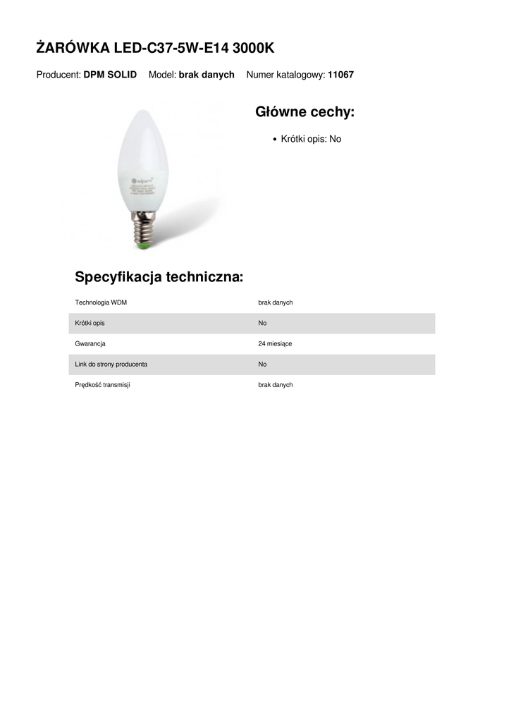 ŻARÓWKA LED-C37-5W-E14 3000K Producent: DPM SOLID Model: brak danych Numer katalogowy: 11067 Główne cechy: Krótki opis: No Specyfikacja techniczna: Technologia WDM brak danych Krótki opis No Gwarancja 24 miesiące Link do strony producenta No Prędkość transmisji brak danych
