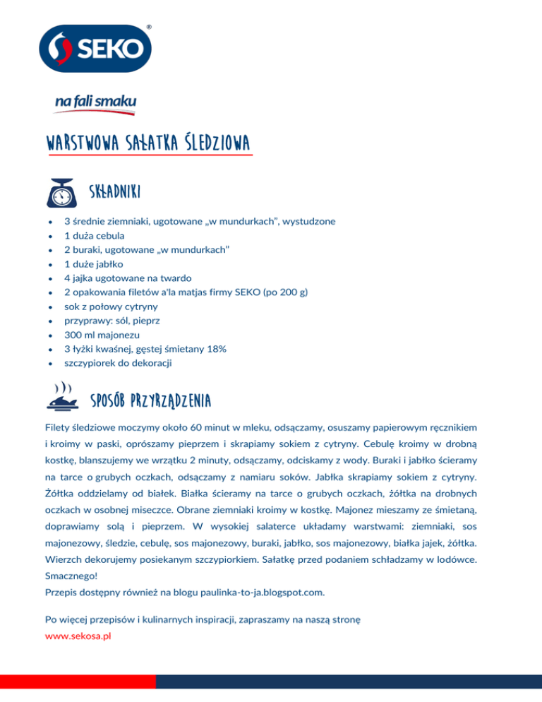WARSTWOWA SAŁATKA ŚLEDZIOWA SKŁADNIKI 3 średnie ziemniaki, ugotowane „w mundurkach”, wystudzone 1 duża cebula 2 buraki, ugotowane „w mundurkach” 1 duże jabłko 4 jajka ugotowane na twardo 2 opakowania filetów a'la matjas firmy SEKO (po 200 g) sok z połowy cytryny przyprawy: sól, pieprz 300 ml majonezu 3 łyżki kwaśnej, gęstej śmietany 18% szczypiorek do dekoracji SPOSÓB PRZYRZĄDZENIA Filety śledziowe moczymy około 60 minut w mleku, odsączamy, osuszamy papierowym ręcznikiem i kroimy w paski, oprószamy pieprzem i skrapiamy sokiem z cytryny. Cebulę kroimy w drobną kostkę, blanszujemy we wrzątku 2 minuty, odsączamy, odciskamy z wody. Buraki i jabłko ścieramy na tarce o grubych oczkach, odsączamy z namiaru soków. Jabłka skrapiamy sokiem z cytryny. Żółtka oddzielamy od białek. Białka ścieramy na tarce o grubych oczkach, żółtka na drobnych oczkach w osobnej miseczce. Obrane ziemniaki kroimy w kostkę. Majonez mieszamy ze śmietaną, doprawiamy solą i pieprzem. W wysokiej salaterce układamy warstwami: ziemniaki, sos majonezowy, śledzie, cebulę, sos majonezowy, buraki, jabłko, sos majonezowy, białka jajek, żółtka. Wierzch dekorujemy posiekanym szczypiorkiem. Sałatkę przed podaniem schładzamy w lodówce. Smacznego! Przepis dostępny również na blogu paulinka-to-ja.blogspot.com. Po więcej przepisów i kulinarnych inspiracji, zapraszamy na naszą stronę www.sekosa.pl