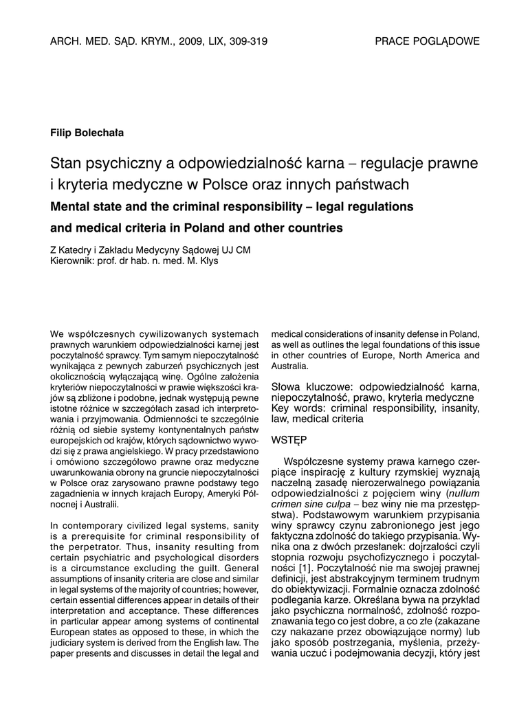 ARCH. MED. SĄD. KRYM., 2009, LIX, 309-319 PRACE POGLĄDOWE Filip Bolechała Stan psychiczny a odpowiedzialność karna – regulacje prawne i kryteria medyczne w Polsce oraz innych państwach Mental state and the criminal responsibility – legal regulations and medical criteria in Poland and other countries Z Katedry i Zakładu Medycyny Sądowej UJ CM Kierownik: prof. dr hab. n. med. M. Kłys We współczesnych cywilizowanych systemach prawnych warunkiem odpowiedzialności karnej jest poczytalność sprawcy. Tym samym niepoczytalność wynikająca z pewnych zaburzeń psychicznych jest okolicznością wyłączającą winę. Ogólne założenia kryteriów niepoczytalności w prawie większości krajów są zbliżone i podobne, jednak występują pewne istotne różnice w szczegółach zasad ich interpretowania i przyjmowania. Odmienności te szczególnie różnią od siebie systemy kontynentalnych państw europejskich od krajów, których sądownictwo wywodzi się z prawa angielskiego. W pracy przedstawiono i omówiono szczegółowo prawne oraz medyczne uwarunkowania obrony na gruncie niepoczytalności w Polsce oraz zarysowano prawne podstawy tego zagadnienia w innych krajach Europy, Ameryki Północnej i Australii. In contemporary civilized legal systems, sanity is a prerequisite for criminal responsibility of the perpetrator. Thus, insanity resulting from certain psychiatric and psychological disorders is a circumstance excluding the guilt. General assumptions of insanity criteria are close and similar in legal systems of the majority of countries; however, certain essential differences appear in details of their interpretation and acceptance. These differences in particular appear among systems of continental European states as opposed to these, in which the judiciary system is derived from the English law. The paper presents and discusses in detail the legal and medical considerations of insanity defense in Poland, as well as outlines the legal foundations of this issue in other countries of Europe, North America and Australia. Słowa kluczowe: odpowiedzialność karna, niepoczytalność, prawo, kryteria medyczne Key words: criminal responsibility, insanity, law, medical criteria WSTęP Współczesne systemy prawa karnego czerpiące inspirację z kultury rzymskiej wyznają naczelną zasadę nierozerwalnego powiązania odpowiedzialności z pojęciem winy (nullum crimen sine culpa – bez winy nie ma przestępstwa). Podstawowym warunkiem przypisania winy sprawcy czynu zabronionego jest jego faktyczna zdolność do takiego przypisania. Wynika ona z dwóch przesłanek: dojrzałości czyli stopnia rozwoju psychofizycznego i poczytalności [1]. Poczytalność nie ma swojej prawnej definicji, jest abstrakcyjnym terminem trudnym do obiektywizacji. Formalnie oznacza zdolność podlegania karze. Określana bywa na przykład jako psychiczna normalność, zdolność rozpoznawania tego co jest dobre, a co złe (zakazane czy nakazane przez obowiązujące normy) lub jako sposób postrzegania, myślenia, przeżywania uczuć i podejmowania decyzji, który jest 310 Filip bolechała zgodny z normą psychiczną [2, 3]. W praktyce przyjmuje się z założenia, że poczytalność osoby jest powszechną statystyczną regułą. Jest domniemana i dlatego w toku postępowania karnego nie dowodzi się jej ani nie analizuje w każdym przypadku, lecz dopiero wówczas, gdy zaistnieje uzasadniona wątpliwość co do poczytalności sprawcy. Obrona na gruncie niepoczytalności jest powszechnie obecna w sądownictwie większości państw na świecie, które respektują prawa człowieka i dysponują uregulowanymi systemami prawnymi. Niepoczytalność jest niczym innym jak zaprzeczeniem, przeciwieństwem poczytalności. Oznacza niemożność przypisania winy i odpowiadania za swoje czyny z powodu pewnych konkretnych uwarunkowań stanu psychicznego. Tym samym osoba niepoczytalna choć dopuszcza się czynu zabronionego nie może być ukarana, bo nie popełnia przestępstwa. Mimo, że ogólne założenia kryteriów niepoczytalności w prawie większości krajów są zbliżone i zbieżne, to szczegóły określające warunki wyłączenia odpowiedzialności z uwagi na stan psychiczny sprawcy przynoszą pewne różnice, nieraz bardzo istotne w konsekwencjach praktyki ich stosowania. NIEPOCZYTALNOść I OGRANICZONA POCZYTALNOść W POLSKIM PRAWIE KARNYM W aktualnie obowiązującym w Polsce Kodeksie karnym z 1997 roku definicja pojęcia niepoczytalności zawarta została w art. 31 § 1, który stanowi: „Nie popełnia przestępstwa, kto z powodu choroby psychicznej, upośledzenia umysłowego lub innego zakłócenia czynności psychicznych, nie mógł w czasie czynu rozpoznać jego znaczenia lub pokierować swoim postępowaniem” [4]. Przepis powyższy sam w sobie nie zawiera słowa „niepoczytalność”, jednak ustawa wprowadza ten termin drogą odesłania przez inne artykuły poświęcone środkom zabezpieczającym (art. 94 i 99 kk.), gdzie mowa jest o sprawcy „w stanie niepoczytalności określonej w art. 31 § 1” [4]. Rodzima ustawa karna określając kryteria niepoczytalności posłużyła się metodą mieszaną psychiatryczno-psychologiczną, która wskazuje zarówno źródła jak i skutki. Uznaje niepoczytalność za określony stan psychiki osoby związany z pewnymi właściwościami procesów Nr 4 motywacyjnych i stopniem samokontroli działania (element psychologiczny), który wynika z konkretnych przyczyn biologicznych (element psychiatryczny). Oba te człony powiązane są ze sobą zależnością przyczynową, a jednocześnie ograniczają się wzajemnie. Oznacza to z jednej strony, że nie każde zaburzenie psychiczne jest podstawą do orzeczenia niepoczytalności lecz tylko takie, które faktycznie pozbawia sprawcę zdolności rozpoznania znaczenia czynu lub pokierowania swoim postępowaniem. Po drugie zniesienie tych zdolności musi być spowodowane tylko przez czynniki wymienione w członie psychiatryczny