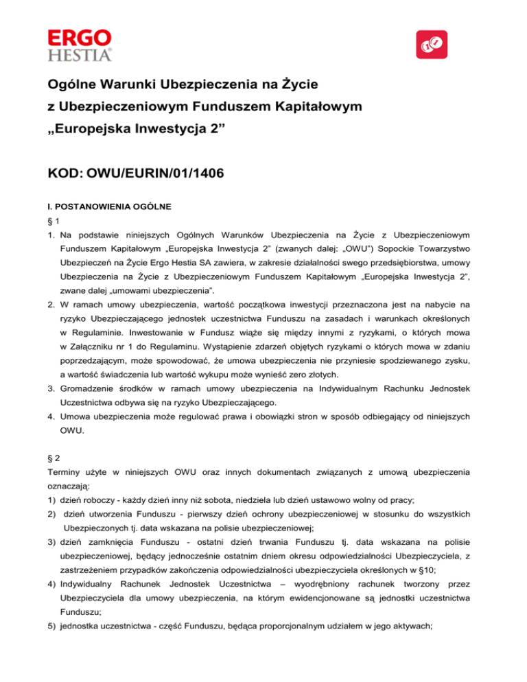Ogólne Warunki Ubezpieczenia na Życie z Ubezpieczeniowym Funduszem Kapitałowym „Europejska Inwestycja 2” KOD: OWU/EURIN/01/1406 I. POSTANOWIENIA OGÓLNE §1 1. Na podstawie niniejszych Ogólnych Warunków Ubezpieczenia na Życie z Ubezpieczeniowym Funduszem Kapitałowym „Europejska Inwestycja 2” (zwanych dalej: „OWU”) Sopockie Towarzystwo Ubezpieczeń na Życie Ergo Hestia SA zawiera, w zakresie działalności swego przedsiębiorstwa, umowy Ubezpieczenia na Życie z Ubezpieczeniowym Funduszem Kapitałowym „Europejska Inwestycja 2”, zwane dalej „umowami ubezpieczenia”. 2. W ramach umowy ubezpieczenia, wartość początkowa inwestycji przeznaczona jest na nabycie na ryzyko Ubezpieczającego jednostek uczestnictwa Funduszu na zasadach i warunkach określonych w Regulaminie. Inwestowanie w Fundusz wiąże się między innymi z ryzykami, o których mowa w Załączniku nr 1 do Regulaminu. Wystąpienie zdarzeń objętych ryzykami o których mowa w zdaniu poprzedzającym, może spowodować, że umowa ubezpieczenia nie przyniesie spodziewanego zysku, a wartość świadczenia lub wartość wykupu może wynieść zero złotych. 3. Gromadzenie środków w ramach umowy ubezpieczenia na Indywidualnym Rachunku Jednostek Uczestnictwa odbywa się na ryzyko Ubezpieczającego. 4. Umowa ubezpieczenia może regulować prawa i obowiązki stron w sposób odbiegający od niniejszych OWU. §2 Terminy użyte w niniejszych OWU oraz innych dokumentach związanych z umową ubezpieczenia oznaczają: 1) dzień roboczy - każdy dzień inny niż sobota, niedziela lub dzień ustawowo wolny od pracy; 2) dzień utworzenia Funduszu - pierwszy dzień ochrony ubezpieczeniowej w stosunku do wszystkich Ubezpieczonych tj. data wskazana na polisie ubezpieczeniowej; 3) dzień zamknięcia Funduszu - ostatni dzień trwania Funduszu tj. data wskazana na polisie ubezpieczeniowej, będący jednocześnie ostatnim dniem okresu odpowiedzialności Ubezpieczyciela, z zastrzeżeniem przypadków zakończenia odpowiedzialności ubezpieczyciela określonych w §10; 4) Indywidualny Rachunek Jednostek Uczestnictwa – wyodrębniony rachunek tworzony przez Ubezpieczyciela dla umowy ubezpieczenia, na którym ewidencjonowane są jednostki uczestnictwa Funduszu; 5) jednostka uczestnictwa - część Funduszu, będąca proporcjonalnym udziałem w jego aktywach; 6) miesiąc polisowy - każdy kolejny miesiąc kalendarzowy trwania okresu odpowiedzialności, poczynając od dnia rozpoczęcia ochrony ubezpieczeniowej; 7) okres subskrypcji – okres, wskazany w Załączniku nr 1 do Regulaminu, w którym Ubezpieczający ma możliwość złożenia wniosku o zawarcie ubezpieczenia oraz w którym zobowiązany jest do dokonania wpłaty na poczet składki ubezpieczeniowej; 8) okres odpowiedzialności - okres, w którym Ubezpieczyciel udziela ochrony ubezpieczeniowej; 9) opłata początkowa - opłata pobierana z kwoty składki ubezpieczeniowej przed jej zainwestowaniem, na którą składają się opłata administracyjna i opłata za ryzyko; 10) opłata administracyjna - zawarta w opłacie początkowej, opłata przeznaczona na pokrycie kosztów administracyjnych w okresie subskrypcji oraz kosztów przygotowania inwestycji w ramach Funduszu; 11) opłata za ryzyko - zawarta w opłacie początkowej, opłata przeznaczona na pokrycie ryzyka związanego z objęciem Ubezpieczonego odpowiedzialnością Ubezpieczyciela z tytułu umowy ubezpieczenia, uwzględniająca m.in. wysokość sumy ubezpieczenia ustalanej zgodnie z §14 ust 2; 12) ochrona ubezpieczeniowa - zobowiązanie Ubezpieczyciela do wypłaty świadczenia, w zakresie wskazanym w umowie ubezpieczenia w przypadku wystąpienia zdarzenia ubezpieczeniowego; 13) polisa ubezpieczeniowa - dokument potwierdzający zawarcie umowy ubezpieczenia, objęcie Ubezpieczonego ochroną ubezpieczeniową oraz nabycie jednostek uczestnictwa Funduszu; 14) Regulamin Ubezpieczeniowego Funduszu Kapitałowego „Europejska Inwestycja 2” Sopockiego Towarzystwa Ubezpieczeń na Życie Ergo Hestia S.A. (kod: REG/EURIN/01/1406) (zwany także „Regulaminem”) - dokument określający zasady lokowania środków Funduszu, w szczególności charakterystykę aktywa wchodzącego w skład Funduszu, zasady funkcjonowania i strategię Funduszu oferowanego przez Ubezpieczyciela, stanowiący Załącznik nr 1 do OWU; 15) składka ubezpieczeniowa - kwota opłacana jednorazowo przez Ubezpieczającego, przeznaczana w części określonej w OWU, na nabycie jednostek uczestnictwa Funduszu; 16) Ubezpieczający - osoba fizyczna, która w dniu zawarcia umowy ubezpieczenia ma ukończone 18 lat i posiada pełną zdolność do czynności prawnych, która zawiera umowę ubezpieczenia z Ubezpieczycielem, 17) Ubezpieczeniowy Fundusz Kapitałowy „Europejska Inwestycja 2” (zwany także „Funduszem”) - wydzielony fundusz aktywów tworzony z łącznej kwoty wartości początkowych inwestycji, funkcjonujący na zasadach określonych w Regulaminie; 18) Ubezpieczony - osoba fizyczna objęta ochroną ubezpieczeniową; w przypadku zawarcia umowy ubezpieczenia na własny rachunek, Ubezpieczający i Ubezpieczony jest tą samą osobą; 19) Ubezpieczyciel - Sopockie Towarzystwo Ubezpieczeń na Życie Ergo Hestia Spółka Akcyjna z siedzibą w Sopocie; wpisana do rejestru przedsiębiorców Krajowego Rejestru Sądowego prowadzonego przez Sąd Rejonowy Gdańsk - Północ, VIII Wydział Gospodarczy pod numerem KRS 0000024807, NIP 585-12-45-589, wysokość kapitału zakładowego, który został opłacony w całości: 64.000.000 zł, wykonująca działalność ubezpieczeniową za zezwoleniem Komisji Nadzoru Finansowego w Warszawie, Plac Powstańców Warszawy 1, 00-950 Warszawa; 20) Uposażony - wskazana przez Ubezpieczonego osoba uprawniona do otrzymania w sytuacjach wskazanych w OWU świadczenia z tytułu zgonu Ubezpieczonego; 21) Uprawniony - Uposażony lub inna osoba uprawniona do otrzymania świadczenia; 22) wartość początkowa inwestycji - składka u