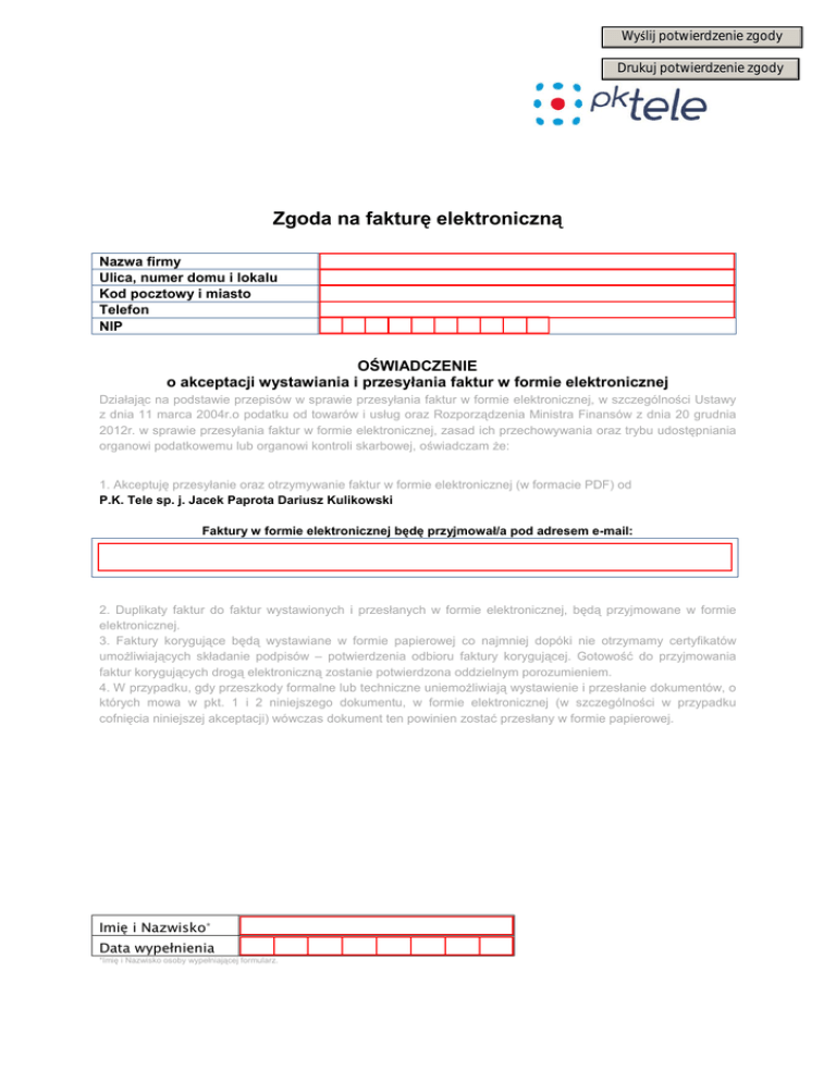 Wyślij potwierdzenie zgody Drukuj potwierdzenie zgody Zgoda na fakturę elektroniczną Nazwa firmy Ulica, numer domu i lokalu Kod pocztowy i miasto Telefon NIP OŚWIADCZENIE o akceptacji wystawiania i przesyłania faktur w formie elektronicznej Działając na podstawie przepisów w sprawie przesyłania faktur w formie elektronicznej, w szczególności Ustawy z dnia 11 marca 2004r.o podatku od towarów i usług oraz Rozporządzenia Ministra Finansów z dnia 20 grudnia 2012r. w sprawie przesyłania faktur w formie elektronicznej, zasad ich przechowywania oraz trybu udostępniania organowi podatkowemu lub organowi kontroli skarbowej, oświadczam że: 1. Akceptuję przesyłanie oraz otrzymywanie faktur w formie elektronicznej (w formacie PDF) od P.K. Tele sp. j. Jacek Paprota Dariusz Kulikowski Faktury w formie elektronicznej będę przyjmował/a pod adresem e-mail: 2. Duplikaty faktur do faktur wystawionych i przesłanych w formie elektronicznej, będą przyjmowane w formie elektronicznej. 3. Faktury korygujące będą wystawiane w formie papierowej co najmniej dopóki nie otrzymamy certyfikatów umożliwiających składanie podpisów – potwierdzenia odbioru faktury korygującej. Gotowość do przyjmowania faktur korygujących drogą elektroniczną zostanie potwierdzona oddzielnym porozumieniem. 4. W przypadku, gdy przeszkody formalne lub techniczne uniemożliwiają wystawienie i przesłanie dokumentów, o których mowa w pkt. 1 i 2 niniejszego dokumentu, w formie elektronicznej (w szczególności w przypadku cofnięcia niniejszej akceptacji) wówczas dokument ten powinien zostać przesłany w formie papierowej. Imię i Nazwisko* Data wypełnienia *Imię i Nazwisko osoby wypełniającej formularz.