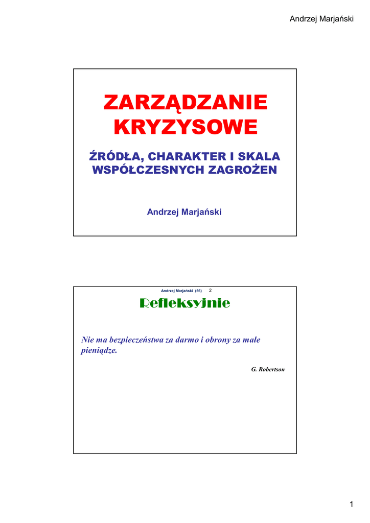 Andrzej Marjański ZARZĄDZANIE KRYZYSOWE ŹRÓDŁA, CHARAKTER I SKALA WSPÓŁCZESNYCH ZAGROŻEN Andrzej Marjański Andrzej Marjański (56) 2 Refleksyjnie Nie ma bezpieczeństwa za darmo i obrony za małe pieniądze. G. Robertson 1 Andrzej Marjański Andrzej Marjański (56) 3 Postrzeganie zagrożeń Człowiek żył i nadal żyje w dwóch przestrzeniach. Przestrzeń naturalna - będącą początkiem wszystkiego, co zdarzyło się na ziemi, tworzy środowisko naturalne Przestrzeń cywilizacyjna – stworzył ją człowiek. Stanowiła początkowo tarczę przeciw ślepym siłom natury, przekształciła się, w miarę rozwoju cywilizacyjnego, w byt niezależny. Wyodrębniono ją ze środowiska naturalnego, środowiska właściwego tylko ludziom, którego istotą są powiązania międzyludzkie wspomagane przez naukę i technikę. prof. dr hab. Jerzy WOLANIN, Wybrane elementy teorii doboru cywilizacyjnego - Czyli o tym, dlaczego zdarzenia niekorzystne są nieuchronne. * Andrzej Marjański (56) 4 Uwarunkowania współczesności Olbrzymi postęp naukowo-techniczny przyniósł nowe olbrzymie zagrożenia dla ludzkości Pojawiło się widmo zagłady atomowej cywilizacji Wystąpiło zagrożenie całkowitej degradacji środowiska naturalnego ….. Rozwój przemysłu powoduje zwiększanie ilości odpadów i emisji dwutlenku węgla do atmosfery Szczególne zagrożenia stwarzają elektrownie atomowe, zakłady chemiczne oraz magazynowanie i transport środków toksycznych Zagrożenia występują także w labolatoriach wykorzystujących niebezpieczne substancje * 2 Andrzej Marjański Andrzej Marjański (56) 5 Czynniki bezpieczeństwa Na współczesne bezpieczeństwo Polski wpływa wiele czynników obiektywnych i subiektywnych. Obiektywne - położenie geopolityczne, stan gospodarki, potencjał obronny, stan sojuszy, poziom życia obywateli. Subiektywne - prestiż międzynarodowy, autorytet przywódców, sprawność dyplomacji, poparcie społeczne w głównych kwestiach racji stanu, rola i znaczenie państwa w międzynarodowym systemie politycznym, poczucie bezpieczeństwa itp. * Andrzej Marjański (56) 6 Czynniki bezpieczeństwa Tradycyjnie bezpieczeństwo państwa rozpatrywane jest w aspekcie zagrożenia zewnętrznego, stąd istotne znaczenie przypisuje się polityce zagranicznej państwa w całokształcie działań i przedsięwzięć mających na celu jego kształtowanie. Podstawowym celem polityki zagranicznej państwa jest zapewnienie sobie bezpieczeństwa w środowisku międzynarodowym. Istota bezpieczeństwa państwa - zdolność narodu (państwa) do ochrony przed zagrożeniami zewnętrznymi szeroko rozumianych jego wartości. Potrzeby w zakresie kształtowania i utrzymania bezpieczeństwa narodowego na odpowiednim poziomie leżą w gestii państwa. 3 Andrzej Marjański Andrzej Marjański (56) 7 Sfera zewnętrzna bezpieczeństwa Celem polityki bezpieczeństwa państwa jest ochrona i zaspokajanie podstawowych potrzeb egzystencjalnych społeczeństwa, utrzymanie niepodległości i suwerenności itp. Sfera zewnętrzna - obszar polityki międzynarodowej, Państwo prowadzi działania, które mają zapobiec powstawaniu sytuacji konfliktowych. Jednak sama polityka zagraniczna nie jest jedynym wyznacznikiem bezpieczeństwa państwa. Andrzej Marjański (56) 8 Sfera wewnętrzna bezpieczeństwa Na bezpieczeństwo narodowe składa się również polityka wewnętrzna, która przekłada się na postrzeganie państwa, na arenie międzynarodowej. Stabilne stosunki społeczno-polityczne, przejrzysty, spójny i unormowany system prawny oraz silna gospodarka stanowią o suwerenności państwa. Państwo silne wewnętrznie jest traktowane przez inne podmioty międzynarodowe na zasadach partnerstwa. Brak bezpieczeństwa wewnętrznego wywołuje niepokój i poczucie zagrożenia nie tylko w społeczeństwie danego państwa, ale i w jego najbliższym otoczeniu, i na arenie międzynarodowej. * 4 Andrzej Marjański Andrzej Marjański (56) 9 Edukacja dla bezpieczeństwa Edukacja dla bezpieczeństwa jest kategorią nierozerwalnie związaną z istotą bezpieczeństwa, Wiedza i świadomość oraz ukształtowana osobowość stanowią o zdolności jednostek i grup do postrzegania zagrożeń, ich oceny oraz gotowości do przeciwdziałania, a tym samym stanowią jeden z elementów kształtowania bezpieczeństwa państwa. * Andrzej Marjański (56) 10 Rola struktur politycznych państwa Zabezpieczenie potrzeb bezpieczeństwa państwa lub narodu i w konsekwencji każdego członka społeczności, realizowane jest poprzez struktury polityczne państwa, które wytyczają kierunki i zakres działań w obszarze wewnętrznym oraz zewnętrznym * 5 Andrzej Marjański Andrzej Marjański (56) 11 Rola struktur politycznych państwa Oddziaływanie zewnętrzne to oddziaływanie na środowisko międzynarodowe, gdzie realizowana jest polityka zagraniczna. Polityka zagraniczna to środek oddziaływania i wpływania na inne państwa w celu realizacji wartości wewnętrznych, które dane państwo samo określa. O istocie bezpieczeństwa państwa będzie decydować jego ogólnie rozumiany potencjał, dawniej sprowadzany do siły militarnej i oddziaływań polityczno-dyplomatycznych tj. porozumień międzynarodowych gwarantujących pomoc militarną, a obecnie rozszerzony na inne kategorie umacniania bezpieczeństwa jak ekonomiczną, ekologiczną, humanitarną. Andrzej Marjański (56) 12 Rola struktur politycznych państwa Podobnie jak sojusze o charakterze militarnym, w dłuższej perspektywie można oczekiwać nie mniej istotnych dla bezpieczeństwa, ściślejszych porozumień ekonomicznych, czego obecnym przykładem są układy i porozumienia handlowe. Porozumienia i układy handlowe działać mogą w trzech obszarach: stabilizacji walutowej, udzielania pomocy finansowej rozwoju handlu międzynarodowego. Niezależnie od istoty porozumień handlowych są one jednym z istotniejszych elementów systemu bezpieczeństwa państwa. 6 Andrzej Marjański Andrzej Ma