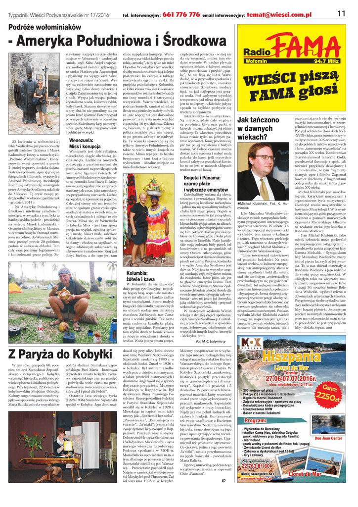 Tygodnik Wieści Podwarszawskie nr 17/2016 tel. interwencyjny: 661 776 776 email interwencyjny: [email protected] 11 Podróże wołominiaków - Ameryka Południowa i Środkowa stawiamy najpiękniejsze chyba miejsce w Wenezueli - wodospad Anioła, czyli Salto Angel (najwyższy wodospad świata), spływający ze stoku Płaskowyżu Auyantepui i płyniemy na wyspy karaibskie - nazywane rajem na Ziemi. Wyspy są całkowicie nastawione na turystykę; tylko domy rybackie i knajpki. Zatrzymujemy się na jednej z nich. Wyspa jak wyspa: palmy, krystaliczna woda, kolorowe rybki, biały piasek. Staramy się wytrzymać te trzy dni, bo nie potrafimy tak po prostu leżeć i patrzeć. Potem wypad po wyspach i pływanie w otwartym oceanie. Zwiedzamy lasy namorzynowe, grotę Maryi, zatopiony wrak i pobliskie wysepki. 22 kwietnia w wołomińskiej Izbie Wodiczków, już po raz czwarty gościli państwo Grażyna i Marek Ładomirscy, którzy w ramach cyklu „Podróże Wołominiaków”, kontynuowali swoją opowieść z prawie 2-letniej wyprawy dookoła świata. Podczas spotkania, opierając się na fotografiach i filmach, wyruszyli z Ameryki Południowej, zwiedzając Kolumbię i Wenezuelę, a następnie przez Amerykę Środkową udali się do Meksyku. Tę część swojej podróży odbyli w okresie: październik - grudzień 2014 r. - Na Amerykę Południową i Środkową mieliśmy zaledwie 3 miesiące, w związku z tym, była to bardzo szybka podróż - powiedział na wstępie Marek Ładomirski. Ostatnio skończyliśmy w Manaus, w centrum Brazylii. Stamtąd startujemy na północ, do Wenezueli. Musimy przeżyć prawie 20-godzinną podróż w autobusie-chłodni. Tam cały czas jesteśmy legitymowani i kontrolowani przez policję. Zo- Wenezuela: Miss i korupcja Wenezuela jest dość religijna, mieszkańcy ciągle obchodzą jakieś święta. Ludzie na rowerach podróżują z przytroczonymi do pleców, czasami naprawdę sporych rozmiarów, figurami świętych. W Ameryce Południowej wszechobecne są pomniki Jana Pawła II, który zawsze jest pogodny; nie jest przedstawiany jak u nas, jako zatroskany czy przygarbiony staruszek. Ludzie są pogodni, to i pomniki są pogodne. Z drugiej strony nie ma tematów tabu; w ogólnym gronie córka opowiada przy matce o swoich stosunkach seksualnych i nikogo to nie oburza. Mówi się, że Wenezuela to fabryka Miss - jest tam spora presja na wygląd, zgrabną sylwetkę i urodę. Nawet małe, zaledwie kilkuletnie dziewczynki robi się na damy - chodzą na szpilkach, w bogato zdobionych sukienkach, są ufryzowane i umalowane. Kraj jest dosyć biedny, a do tego jest tam silnie napędzana korupcja. Wenezuelczycy na widok każdego patrolu robią „zrzutkę”, żeby tylko nie mieć kłopotów. W związku z tym wszelkie służby mundurowe stawiają kolejne posterunki, bo czerpią z takiego nastawienia ogromne zyski. Do przejścia granicznego z Kolumbią, co kilka kilometrów stoi kilkanaście posterunków różnych służb (każdy ma inny mundur) i zatrzymują wszystkich. Warto wiedzieć, że podczas kontroli, zamiast zdradzać ile się ma pieniędzy, należy mówić, że „nie więcej niż jest dozwolone prawem”, a turysta może wjechać z gotówką 10 tys. dolarów. Zdarza się bowiem, że jeśli skłamiemy, a policja znajdzie przy nas więcej, to po prostu zabiorą tę nadwyżkę. Te wymyki stosowane są nie tylko w Ameryce Południowej, ale także w wielu innych krajach na świecie. Mimo tego jest to bardzo bezpieczny i tani kraj z ładnym wybrzeżem - idealne miejsce na niskobudżetowe wakacje. W Kolumbii da się zauważyć duży postęp cywilizacyjny - to piękny, bogaty kraj, wspaniałe miasta z czystymi ulicami i bardzo zadbanymi starówkami. Sporo małych knajpek i dzieł sztuki rozstawionych na ulicach nadaje mu delikatny charakter. Zachwyciła nas Cartagena i wioski górskie. Tak samo mają cudowną karaibską plażę, czy lasy tropikalne. Popularny jest tam szybki drink w formie kokosa ze ściętym wierzchem i słomką w środku. Woda jest po prostu gorąca, W tym roku przypada 80. rocznica śmierci Stanisława Szpotańskiego - związanego z Kobyłką wybitnego historyka, publicysty, powieściopisarza i działacza politycznego. Przy tej okazji, 22 kwietnia w kobyłkowskim Miejskim Ośrodku Kultury zorganizowane zostało wyjątkowe spotkanie, podczas którego Maria Balicka zabrała wszystkich w podróż śladami Stanisława Szpotańskiego. Pani Maria - honorowa obywatelka miasta Kobyłka, życiorys Szpotańskiego zna na pamięć i poświęciła wiele czasu na przestudiowanie twórczości człowieka, który „żył i pisał dla Polski”. Ostatnie lata swojego życia (1928-1936) Stanisław Szpotański spędził w Kobyłce. Jego dom znaj- Jak tańczono w dawnych wiekach? Bogota i Panama: czarne plaże i wybrzeże emerytów Kolumbia: żółwie i kawa Z Paryża do Kobyłki cieplejsza od powietrza - w niej nie da się zmarznąć, można tam siedzieć wiecznie. W wodzie pływają ogromne żółwie, z którymi można sobie ponurkować i przybić „piątkę”, bo nie boją się ludzi. Warto dodać, że w przypadku spotkania z jakimkolwiek jadowitym, morskim stworzeniem (koralowce, meduzy itp.), na jad najlepsza jest gorąca woda. Pod wpływem wysokiej temperatury jad ulega degradacji i jest to najlepszy i właściwie jedyny sposób na szybkie pozbycie się trucizny z organizmu. Jak Kolumbia - to musi być kawa. Są miejsca, gdzie całe wzgórza są porośnięte kawą oraz parki, w których można zobaczyć jej różne odmiany. Ta właściwa, prawdziwa kawa rośnie tylko na jednym paśmie wysokości. Kawę powinno się pić tuż po jej wypaleniu z białych nasion. W Polsce czasami można dostać takie nasiona i nabyć małą palarkę do kawy, jeśli oczywiście komuś zależy na prawdziwej kawie, bo to co jest w naszych sklepach trudno nazwać kawą. dował się przy ulicy, która obecne nosi imię Wacława Nałkowskiego. Szpotański urodził się 1880 r. w okolicach Łodzi.