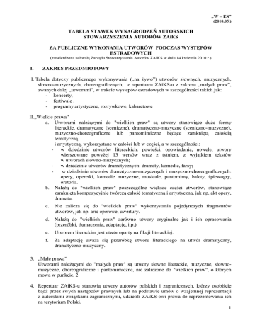 „W – ES” (2010.05.) TABELA STAWEK WYNAGRODZEŃ AUTORSKICH STOWARZYSZENIA AUTORÓW ZAiKS ZA PUBLICZNE WYKONANIA UTWORÓW PODCZAS WYSTĘPÓW ESTRADOWYCH (zatwierdzona uchwałą Zarządu Stowarzyszenia Autorów ZAiKS w dniu 14 kwietnia 2010 r.) I. ZAKRES PRZEDMIOTOWY I. Tabela dotyczy publicznego wykonywania („na Ŝywo”) utworów słownych, muzycznych, słowno-muzycznych, choreograficznych, z repertuaru ZAiKS-u z zakresu „małych praw”, zwanych dalej „utworami”, w trakcie występów estradowych w szczególności takich jak: - koncerty, - festiwale , - programy artystyczne, rozrywkowe, kabaretowe II.„Wielkie prawa” a. Utworami naleŜącymi do "wielkich praw" są utwory stanowiące duŜe formy literackie, dramatyczne (sceniczne), dramatyczno-muzyczne (sceniczno-muzyczne), muzyczno-choreograficzne lub pantomimiczne będące zamkniętą całością tematyczną i artystyczną, wykorzystane w całości lub w części, a w szczególności: - w dziedzinie utworów literackich: powieści, opowiadania, nowele, utwory wierszowane powyŜej 13 wersów wraz z tytułem, z wyjątkiem tekstów w utworach słowno-muzycznych; - w dziedzinie utworów dramatycznych: dramaty, komedie, farsy; w dziedzinie utworów dramatyczno-muzycznych i muzyczno-choreograficznych: opery, operetki, komedie muzyczne, musicale, pantomimy, balety, śpiewogry, oratoria. b. NaleŜą do "wielkich praw" poszczególne większe części utworów, stanowiące zamkniętą kompozycyjnie twórczą całość tematyczną i artystyczną, jak np. akt opery, dramatu. c. Nie zalicza się do "wielkich praw" wykorzystania pojedynczych fragmentów utworów, jak np. arie operowe, uwertury. d. NaleŜą do "wielkich praw" zarówno utwory oryginalne jak i ich opracowania (przeróbki, tłumaczenia, adaptacje, itp.) e. Utworem literackim jest utwór oparty na fikcji literackiej. f. Za adaptację uwaŜa się przeróbkę utworu literackiego na utwór dramatyczny, dramatyczno-muzyczny. 3. „Małe prawa” Utworami naleŜącymi do "małych praw" są utwory słowne literackie, muzyczne, słownomuzyczne, choreograficzne i pantomimiczne, nie zaliczone do "wielkich praw", o których mowa w punkcie. 2 4. Repertuar ZAiKS-u stanowią utwory autorów polskich i zagranicznych, którzy osobiście bądź przez swych następców prawnych lub na podstawie umów o wzajemnej reprezentacji z autorskimi związkami zagranicznymi, udzielili ZAiKS-owi prawa do reprezentowania ich na terytorium Polski. 1 „W – ES” (2010.05.) II. POSTANOWIENIA OGÓLNE Stawka wynagrodzeń autorskich dla wszystkich rodzajów występów estradowych ustalana jest za kaŜdą imprezę (koncert ) oddzielnie według następujących zasad: 1. Występy estradowe - biletowane a. Umowa stała „generalna” 8% wpływów brutto (z wyłączeniem podatku VAT), z biletów wstępu, karnetów, płatnych zaproszeń, opłat ryczałtowych, w tym równieŜ wartości biletów przekazanych firmom, instytucjom, osobom fizycznym w ramach sponsoringu, dotacji subwencji, umów barterowych itp. b. Umowa jednorazowa - stosownie do udziału utworów z repertuaru ZAiKS-u w programie stawki wynoszą: - do 20% utworów 2% - 21% - 40% 6% - 41% - 60% 8% - 61% - 75% 10% - powyŜej 75% 12% wpływów brutto (z wyłączeniem podatku VAT) , z biletów wstępu, karnetów, płatnych zaproszeń, opłat ryczałtowych, w tym równieŜ wartości biletów przekazanych firmom, instytucjom, osobom fizycznym w ramach sponsoringu, dotacji subwencji, umów barterowych itp. c. Wynagrodzenia autorskie obliczone na podstawie zasad określonych pod lit.a.) i b.) nie moŜe być niŜsze: - od kwoty stanowiącej 10% wynagrodzeń wszystkich wykonawców w szczególności solistów, zespołu artystycznego, zespołu muzycznego, orkiestrowego, tanecznego, - lub od stawki określonej w dziale III 2. Występy estradowe – niebiletowane a. jeśli nie pobiera się opłat za wstęp wynagrodzenie autorskie stanowi 10% wynagrodzeń wszystkich wykonawców w szczególności solistów, zespołu artystycznego, zespołu muzycznego, orkiestrowego, tanecznego, konferansjera, b. jeśli nie pobiera się opłat za wstęp i wykonawcy nie otrzymują wynagrodzenia, wynagrodzenie autorskie stanowi stawka ryczałtowa określona w dziale III, c. jeśli kwota wynagrodzenia autorskiego wyliczona według zasad określonych pod lit. a.) jest niŜsza od odpowiedniej stawki określonej w, dziale III, stosuje się stawkę z ziału III. 3. Występy estradowe– z frekwencją ponad 4 tysiące osób, („wielkie koncerty”) organizowane w halach widowiskowych, na stadionach, lotniskach itp. a. stawka wynosi 6% wpływów brutto (z wyłączeniem podatku VAT), z biletów wstępu, karnetów, płatnych zaproszeń, opłat ryczałtowych, itp.. b. w wypadku gdy nie pobiera się opłat za wstęp stosuje się stawki jak punkcie niniejszego działu. 4. Stawki wynagrodzeń autorskich ustalone niniejszą tabelą nie obejmują podatku od towarów i usług (VAT). 2 „W – ES” (2010.05.) 5. NaleŜności z tytułu wynagrodzeń autorskich wyliczone na podstawie niniejszej tabeli, zaokrągla się do pełnych złotych według zasady: do 0,50 zł w dół, powyŜej 0,50 zł w górę. III. STAWKI RYCZAŁTOWE liczba uczestników 100 200 300 400 500 KaŜde następne rozpoczęte 100 stawka 150 zł 300 zł 450 zł 600 zł 750 zł 150 zł Uwaga: dla niekomercyjnych koncertów organizowanych przez instytucje oświatowe i kultury gdy wykonawcami są zespoły szkolne lub amatorskie, stawki ryczałtowe obniŜa się, jednak nie więcej niŜ o 30% IV. POSTANOWIENIA KOŃCOWE 1. Stawki wynagrodzeń ryczałtowych określone w dziale III, podlegać będą zmianie (waloryzacji) w okresach rocznych na dzień 1 kwietnia, począwszy od dnia 1 kwietnia 2011 roku, z uwzględnieniem średniorocznego wskaźnika cen towarów i usług konsumpcyjnych w poprzednim roku, ogłaszanego przez Prezesa GUS. Waloryzacja na dany rok będzie dokonywana, o ile od ostatniego ustalenia wysokości stawki ceny towarów i u