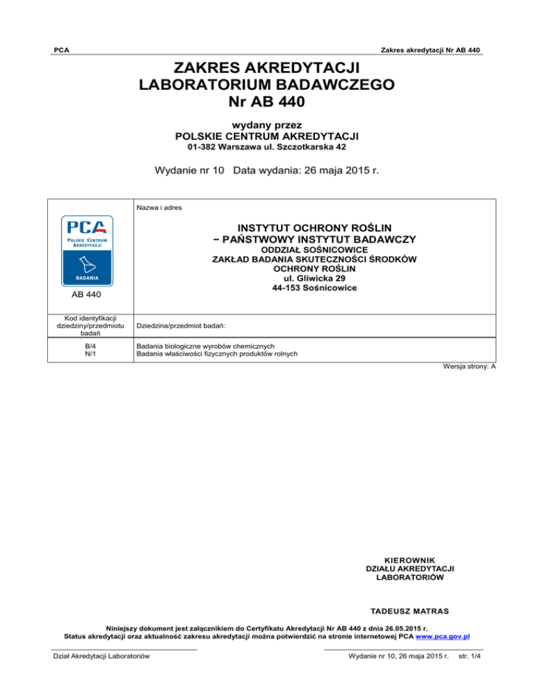 PCA Zakres akredytacji Nr AB 440 ZAKRES AKREDYTACJI LABORATORIUM BADAWCZEGO Nr AB 440 wydany przez POLSKIE CENTRUM AKREDYTACJI 01-382 Warszawa ul. Szczotkarska 42 Wydanie nr 10 Data wydania: 26 maja 2015 r. Nazwa i adres INSTYTUT OCHRONY ROŚLIN − PAŃSTWOWY INSTYTUT BADAWCZY ODDZIAŁ SOŚNICOWICE ZAKŁAD BADANIA SKUTECZNOŚCI ŚRODKÓW OCHRONY ROŚLIN ul. Gliwicka 29 44-153 Sośnicowice AB 440 Kod identyfikacji dziedziny/przedmiotu badań B/4 N/1 Dziedzina/przedmiot badań: Badania biologiczne wyrobów chemicznych Badania właściwości fizycznych produktów rolnych Wersja strony: A KIEROWNIK DZIAŁU AKREDYTACJI LABORATORIÓW TADEUSZ MATRAS Niniejszy dokument jest załącznikiem do Certyfikatu Akredytacji Nr AB 440 z dnia 26.05.2015 r. Status akredytacji oraz aktualność zakresu akredytacji można potwierdzić na stronie internetowej PCA www.pca.gov.pl Dział Akredytacji Laboratoriów Wydanie nr 10, 26 maja 2015 r. str. 1/4 PCA Zakres akredytacji Nr AB 440 Zakład Badania Skuteczności Środków Ochrony Roślin ul. Gliwicka 29, 44-153 Sośnicowice Rodzaj działalności/badane Przedmiot badań/wyrób Dokumenty odniesienia cechy/metoda Elastyczny zakres akredytacji 1) Fungicydy stosowane w ochronie źdźbeł zbóż Fungicydy stosowane w ochronie liści i kłosów zbóż Fungicydy stosowane w ochronie liści, łuszczyn i pędów rzepaku Zaprawy fungicydowe stosowane w ochronie zbóż i rzepaku Herbicydy stosowane w zwalczaniu chwastów w uprawie zbóż Herbicydy stosowane w zwalczaniu chwastów w uprawie rzepaku Herbicydy stosowane w zwalczaniu chwastów w uprawie kukurydzy Regulatory wzrostu i rozwoju roślin stosowane w uprawach zbóż Regulatory wzrostu i rozwoju roślin stosowane w uprawie rzepaku Skuteczność działania fungicydów na podstawie uszkodzenia podstaw źdźbeł, plonu Metoda wizualna, wagowa Skuteczność działania fungicydów na podstawie uszkodzenia lub/i zachowanych tkanek roślin, plonu Metoda wizualna, wagowa Skuteczność działania fungicydów na podstawie uszkodzenia liści łuszczyn i pędów rzepaku, plonu Metoda wizualna, wagowa Skuteczność działania zapraw fungicydowych na podstawie uszkodzenia lub/i zachowanych tkanek roślin, liczby roślin, plonu Metoda wizualna, wagowa Skuteczność działania herbicydów na podstawie uszkodzenia lub/i zachowania tkanek roślin niepożądanych, plonu Metoda wizualna, wagowa Skuteczność działania herbicydów na podstawie uszkodzenia lub/i zachowania tkanek roślin, plonu Metoda wizualna, wagowa Skuteczność działania herbicydów na podstawie uszkodzenia lub/i zachowania tkanek roślin niepożądanych, plonu Metoda wizualna, wagowa Efektywność działania na podstawie ograniczania wylegania i wpływu na rozwój roślin, plonu Metoda wizualna, biometryczna, wagowa Efektywność działania na podstawie ograniczania wylegania i wpływu na rozwój roślin, plonu Metoda wizualna, biometryczna, wagowa EPPO PP 1/281) EPPO PP 1/1521) EPPO PP 1/1811) EPPO PP 1/261) EPPO PP 1/1521) EPPO PP 1/1811) EPPO PP 1/781) EPPO PP 1/1521) EPPO PP 1/1811) IB-07 1) IB-08 1) EPPO PP 1/191) EPPO PP 1/2621) EPPO PP 1/1521) EPPO PP 1/1811) EPPO PP 1/931) EPPO PP 1/1521) EPPO PP 1/1811) EPPO PP 1/491) EPPO PP 1/1521) EPPO PP 1/1811) EPPO PP 1/501) EPPO PP 1/1521) EPPO PP 1/1811) EPPO PP 1/1441) EPPO PP 1/1521) EPPO PP 1/1811) EPPO PP 1/1531) EPPO PP 1/1521) EPPO PP 1/1811) Wersja strony: A Dział Akredytacji Laboratoriów Wydanie nr 10, 26 maja 2015 r. str. 2/4 PCA Zakres akredytacji Nr AB 440 Przedmiot badań/wyrób Środki ochrony roślin Ziarno zbóż (pszenica, żyto, jęczmień, pszenżyto, kukurydza), nasiona rzepaku Ziarno zbóż (pszenica, żyto, jęczmień, pszenżyto, kukurydza) Nasiona rzepaku Rodzaj działalności/badane cechy/metoda Fitotoksyczność środków ochrony roślin na podstawie uszkodzenia tkanek roślin i wpływu na rozwój roślin oraz plon Dokumenty odniesienia EPPO PP 1/1351) EPPO PP 1/1521) EPPO PP 1/1811) Metoda wizualna, biometryczna wagowa Zawartość wilgotności PB-021) Metoda transmisji bliskiej podczerwieni (NIR) Zawartość białka Metoda transmisji bliskiej podczerwieni ( (NIR) Zawartość oleju Metoda transmisji bliskiej podczerwieni (NIR) 1) Dopuszcza się: stosowanie zaktualizowanych metod znormalizowanych oraz modyfikację metod opracowanych przez Laboratorium Aktualna „Lista badań prowadzona w ramach elastycznego zakresu akredytacji” jest dostępna na każde żądanie w akredytowanym podmiocie. Wersja strony: A Dział Akredytacji Laboratoriów Wydanie nr 10, 26 maja 2015 r. str. 3/4 PCA Zakres akredytacji Nr AB 440 Wykaz zmian Zakresu Akredytacji Nr AB 440 Status zmian: wersja pierwotna - A Zatwierdzam status zmian KIEROWNIK DZIAŁU AKREDYTACJI LABORATORIÓW TADEUSZ MATRAS dnia: 26.05.2015 r. Dział Akredytacji Laboratoriów Wydanie nr 10, 26 maja 2015 r. str. 4/4