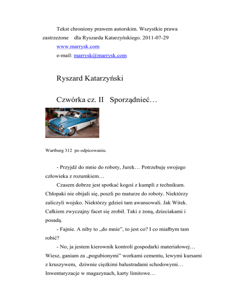 Tekst chroniony prawem autorskim. Wszystkie prawa zastrzeżone dla Ryszarda Katarzyńskiego. 2011-07-29 www.marrysk.com e-mail: [email protected] Ryszard Katarzyński Czwórka cz. II Sporządnieć… Wartburg 312 po odpicowaniu. - Przyjdź do mnie do roboty, Jurek… Potrzebuję swojego człowieka z rozumkiem… Czasem dobrze jest spotkać kogoś z kumpli z technikum. Chłopaki nie obijali się, poszli po maturze do roboty. Niektórzy zaliczyli wojsko. Niektórzy gdzieś tam awansowali. Jak Witek. Całkiem zwyczajny facet się zrobił. Taki z żoną, dzieciakami i posadą. - Fajnie. A niby to „do mnie”, to jest co? I co miałbym tam robić? - No, ja jestem kierownik kontroli gospodarki materiałowej… Wiesz, ganiam za „pogubionymi” workami cementu, lewymi kursami z kruszywem, dziwnie ciężkimi balustradami schodowymi… Inwentaryzacje w magazynach, karty limitowe… - Ganiasz sam? - Coś ty?! Kierownik jestem! Jego przyszły kierownik, troszkę się nadął, spróbował nawet czegoś w rodzaju poważnej miny - A ja co miałbym być i za ile? - Starszy inspektor będziesz… Dostaniesz dwa dwieście… To góra co mogę z taryfikatora… I premia kwartalna 15%... - Cienko. Połowa pójdzie mi na mieszkanie. - Więcej nie da rady… - A zaświadczenie i zgodę na studia wieczorowe załatwisz? - Pogadam z Głównym Księgowym… W jego pionie jesteśmy… A ty co będziesz studiował? - Pociągnę na ekonomicznym… Dwa lata mi zaliczą… Może uda się i trzy… Jednego wpisu mi brakuje… - To chyba się zgodzi… Przynieś jutro papiery… Finansowo, propozycja żadna. Więcej zarobiłby na Turzynie… W każdej branży. Tym bardziej, że miał te troszkę grosza, żeby obrócić. Tylko, że na Turzynie zaświadczenia z pracy miał nie będzie… A jak kupi lewe, to dziekanat po zaliczeniu semestru wyśle do kadr pisulkę… Dopiero taki kadrowy by się dziwował, że pracownika Nowaka Jurka ma… Studia wieczorowe i zaoczne to były tylko dla ciężko pracujących w jednostkach gospodarki uspołecznionej… Póki nie ma zaklepanego zaliczenia tego szóstego semestru, nie ma co się wygłupiać Jakby w tym tygodniu wyrobił się z papierami, to była szansa, że przed wakacjami zdąży jeszcze złapać profesorka od finansów… Bo niby wszystko miał. Ćwiczenia zaliczone, kolokwia zaliczone. Egzamin zaliczony i nawet ocena 3,5 wstawiona przez asystenta… Tylko tego jednego podpisu samego Pana Boga było brak… Łysy Pan Bóg, nawet go trochę lubił. Może dla tego, że tak rzadko go widywał na wykładach… Nie było okazji do wzajemnego psucia sobie humorów. Praca okazała się zupełnie niezła. Nikt na ręce nie patrzał, nikt za człowiekiem nie chodził i nie sprawdzał co robi… Bo było to niemożliwe. W mieście budowanych było jednocześnie kilka osiedli, W terenie, kilka samodzielnych Kierownictw Grup Robót i ze dwadzieścia odrębnych budów takich jak agronomówki, przedszkola, ośrodki zdrowia… Własna produkcja prefabrykatów, własna produkcja stolarki budowlanej, własne kierownictwo budowania zaplecza i przygotowywania placów budowy… Te dwa tysiące ludzi coś w końcu musiało robić! Same inwentaryzacje w magazynach na budowach takim inspektorkom jak on, dawały wystarczające uzasadnienie istnienia i wystarczający luz, aby sobie spokojnie studiować. I było jeszcze sporo czasu na inne przyjemne aspekty życia budowlanego. Jedyne co było przykre w tym wszystkim, to rzeczywistość finansowa. Jakby nie ścibił, to co miesiąc, do tej swojej pensji dokładał z topniejącej kupki. Niedużo. Dwieście, trzysta złociszów…Ale z kupki ubywało. Spróbował załapać się na jakiś interesik… Znajomy marynarz przytargał sporą kupkę dżinów, a jego odbiorca się wziął i zbiesił. Zdarza się. To pan Jurek Nowak wziął sobie te szmaty do rozprowadzenia i o mało nie zawalił kolokwium! I jeszcze pojawiła się śliczna Ania! Jurek Nowak też był prawie śliczny. I słuchy o nim różne chodziły… Im dziewczyna z porządniejszego domu, tym bardziej do łobuza ją ciągnie. Śliczna Ania. Pani świeża magister, przyszła do księgowości odpracować stypendium fundowane. Do dyplomu dodane były kruczoczarne, niesforne loczki, roześmiane siwe oczy i zadarty szpiczasty nosek. Minkę miała taką jakby ciągle za czymś śmiesznym węszyła. I figurka! Mniej więcej, dwie trzecie wzrostu zajmowały nogi! Gdy wszedł do materiałówki z arkuszami inwentaryzacyjnymi pod pachą, w pierwszej chwili pomyślał, że dziewczę przy szafie pod oknem ma szpileczki na dziesięć centymetrów… A dziewczę się ruszyło i pokazało stópki w klapeczkach! On się gapił na te stópki, a dziewczę gapiło się na jego zagapienie. Pozostałe panie w pokoju musiałyby być idiotkami, żeby nie dostrzec tego. A że panie kochają być swatkami, to po przyjacielsku podbechtywały ich ku sobie. Fajnie było. Zapleczem do tej fajności dysponował samodzielnym. Młoda pani magister mająca za sobą niedawno zakończone życie studenckie, prowadzone na wszelki wypadek w innym mieście niż mieszkali rodzice, nie miała żadnych oporów przed wykorzystywaniem takiego zaplecza. Jurka opory pojawiły się w momencie gdy rozmawiali sobie o takich rzeczach, jak wspólne mieszkanie. I w takim wspólnym, gdzie i co będzie stało, co da się „wziąć na raty”… Może nawet telewizor? Zdecydowały argumenty ekonomiczne. - To głupie, żebyśmy każde z osobna wydawali pół pensji na mieszkania… Ja mam książeczkę mieszkaniową i za pół roku z puli zakładowej dostanę mieszkanie w spółdzielni, wiesz? - Teraz już wiem. Gratulacje. - Pożyczkę mieszkaniową też mi dali z funduszu mieszkaniowego… Tylko, że to jest takie malutkie M-1. - To M-1 to jakie? Jedno okno? - No prawie. Taka garsoniera, kawalerka. Jeden pokoik tak z piętnaście metrów, kuchnia pięć, łazienka trzy i taka wnęka niby przedpokój metr na metr! - Dobre i to. - W komisji 