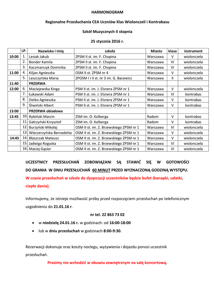 HARMONOGRAM Regionalne Przesłuchania CEA Uczniów Klas Wiolonczeli i Kontrabasu Szkół Muzycznych II stopnia 25 stycznia 2016 r. LP. 10:00 1. 2. 3. 11:00 4. 5. 11:40 12:00 6. 7. 8. 9. 13:00 13:45 10. 11. 12. 13. 14:45 14. 15. 16. Nazwisko i imię Lesiak Jakub Bonder Kamila Kaczmarczyk Dominika Kiljan Agnieszka Leszczyńska Maria PRZERWA Maciejewska Kinga Łukawski Adam Detko Agnieszka Śliwiński Albert PRZERWA obiadowa Rybiński Marcin Gałczyński Krzysztof Burzyński Mikołaj Wieczerzyńska Bernadetta Błaszczak Mateusz Jadwiga Roguska Maciej Gąsior UCZESTNICY szkoła ZPSM II st. im. F. Chopina ZPSM II st. im. F. Chopina ZPSM II st. im. F. Chopina OSM II st. ZPSM nr 4 ZPOSM I i II st. nr 3 im. G. Bacewicz Miasto Warszawa Warszawa Warszawa Warszawa Warszawa klasa V VI VI V II instrument wiolonczela wiolonczela wiolonczela wiolonczela wiolonczela PSM II st. im. J. Elsnera ZPSM nr 1 PSM II st. im. J. Elsnera ZPSM nr 1 PSM II st. im. J. Elsnera ZPSM nr 1 PSM II st. im. J. Elsnera ZPSM nr 1 Warszawa Warszawa Warszawa Warszawa V VI V V wiolonczela kontrabas kontrabas kontrabas ZSM im. O. Kolberga ZSM im. O. Kolberga OSM II st. im. Z. Brzewskiego ZPSM nr 1 OSM II st. im. Z. Brzewskiego ZPSM nr 1 OSM II st. im. Z. Brzewskiego ZPSM nr 1 OSM II st. im. Z. Brzewskiego ZPSM nr 1 OSM II st. im. Z. Brzewskiego ZPSM nr 1 Radom Radom Warszawa Warszawa Warszawa Warszawa Warszawa V V VI V V VI VI kontrabas kontrabas wiolonczela wiolonczela wiolonczela wiolonczela wiolonczela PRZESŁUCHAŃ ZOBOWIĄZANI SĄ STAWIĆ SIĘ W GOTOWOŚCI DO GRANIA W DNIU PRZESŁUCHAŃ 60 MINUT PRZED WYZNACZONĄ GODZINĄ WYSTĘPU. W czasie przesłuchań w szkole do dyspozycji uczestników będzie bufet (kanapki, sałatki, ciepłe dania). Informujemy, że istnieje możliwość próby przed rozpoczęciem przesłuchań po telefonicznym uzgodnieniu do 21.01.16 r. nr tel. 22 863 73 02 w niedzielę 24.01.16 r. w godzinach: od 16:00-18:00 lub w dniu przesłuchań w godzinach 8:00-9:30. Rezerwacji dokonuje oraz koszty noclegu, wyżywienia i dojazdu ponosi uczestnik przesłuchań. Prosimy nie wchodzić w obuwiu zewnętrznym na salę koncertową.