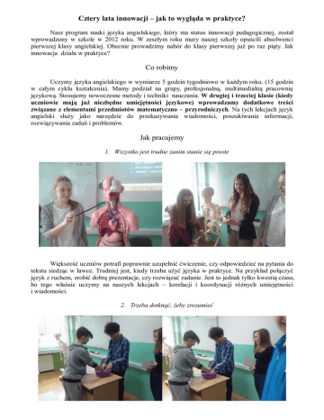 Cztery lata innowacji – jak to wygląda w praktyce? Nasz program nauki języka angielskiego, który ma status innowacji pedagogicznej, został wprowadzony w szkole w 2012 roku. W zeszłym roku mury naszej szkoły opuścili absolwenci pierwszej klasy angielskiej. Obecnie prowadzimy nabór do klasy pierwszej już po raz piąty. Jak innowacja działa w praktyce? Co robimy Uczymy języka angielskiego w wymiarze 5 godzin tygodniowo w każdym roku. (15 godzin w całym cyklu kształcenia). Mamy podział na grupy, profesjonalną, multimedialną pracownię językową. Stosujemy nowoczesne metody i techniki nauczania. W drugiej i trzeciej klasie (kiedy uczniowie mają już niezbędne umiejętności językowe) wprowadzamy dodatkowe treści związane z elementami przedmiotów matematyczno – przyrodniczych. Na tych lekcjach język angielski służy jako narzędzie do przekazywania wiadomości, poszukiwania informacji, rozwiązywania zadań i problemów. Jak pracujemy 1. Wszystko jest trudne zanim stanie się proste Większość uczniów potrafi poprawnie uzupełnić ćwiczenie, czy odpowiedzieć na pytania do tekstu siedząc w ławce. Trudniej jest, kiedy trzeba użyć języka w praktyce. Na przykład połączyć język z ruchem, zrobić dobrą prezentacje, czy rozwiązać zadanie. Jest to jednak tylko kwestią czasu, bo tego właśnie uczymy na naszych lekcjach – korelacji i koordynacji różnych umiejętności i wiadomości. 2. Trzeba dotknąć, żeby zrozumieć Dodatkowe treści realizowane są między innymi metoda projektu. To uczniowie sami wybierają temat, który ich interesuje. Dzięki temu robią to chętniej, bo mają na to realny wpływ. Uczniowie są prawdziwą kopalnią pomysłów i my – nauczyciele – czerpiemy z tego całymi garściami. Wspieramy uczniów, pomagamy, kierujemy, ale to oni są prawdziwymi twórcami. Najlepsze projekty są wyróżniane i przedstawiane w młodszych klasach tak, aby uczniowie mogli się wzajemnie inspirować. 3. Uczeń źródłem wiedzy i centrum sali lekcyjnej Uczniowie uczą się od siebie i uczą się w szkole – to jest bardzo istotne. Posiadają wiedzę z różnych źródeł, również pozaszkolnych (gry komputerowe, Internet), i lubią się tą wiedzą dzielić. Ich znajomość programów komputerowych czy aplikacji mobilnych wykorzystujemy do celów edukacyjnych. Mają oni możliwość wykazania się, bycia w centrum, pokazania swojego potencjału. Słuchamy naszych uczniów i słuchamy ich rodziców Przeprowadzamy regularnie ankiety, analizujemy je, wyciągamy wnioski i modyfikujemy swoje działania. Jedną z sugestii rodziców zawartych w ankietach były wyjazdy uczniów na anglojęzyczne spektakle i przedstawienia. Pomysł okazał się strzałem w dziesiątkę. Wyjazdy te cieszą się ogromną popularnością pomimo tego,(a może właśnie dlatego) że repertuar jest ambitny, w oryginalnej wersji językowej, przedstawiany w godzinach wieczornych. Spektakle omawiane są na lekcjach tak aby uczniowie mogli jak najwięcej z nich skorzystać. Ambitny repertuar dla ambitnych uczniów: Sen Nocy Letniej Hamlet Upiór z Canterville William Szekspir William Szekspir Oscar Wilde The Globe Theatre National Theatre TNT Theatre Britain Ideą innowacji jest używanie języka angielskiego jako narzędzia do różnych celów.Służą temu zadania problemowe na lekcji. Ćwiczymy też praktycznie umiejętność mówienia – co jest najistotniejsze w nauce języka. Na tym najbardziej zależy uczniom i ich rodzicom. (jak wynika z ankiet). Umiejętność ta nie jest sprawdzana na egzaminie gimnazjalnym ale my mamy na to czas na naszych lekcjach. W ten cel świetnie się również wpisuje nasza współpraca ze szkołą Holly Family w Wielkiej Brytanii. Uczniowie prowadzą ze sobą korespondencję. Piszą tradycyjne listy – nawiązują nowe znajomości rozwijając jednocześnie umiejętność pisania. My koordynujemy tą wymianę. Tradycją już stały się wyjazdy na zagraniczne warsztaty językowe Co roku nasi uczniowie uczestniczą w warsztatach językowych organizowanych na Malcie lub w Londynie. Mieszkają u rodzin, szlifują więc język podczas codziennych konwersacji.. Mają też zajęcia w szkole językowej w grupach międzynarodowych. Dostają od nas różne zadania w przerwach czy w trakcie zwiedzania obiektów turystycznych. Słynne zadania językowe - przy których czasami trzeba poprosić o pomoc pracownika muzeum, czy przechodniów na ulicy. Organizujemy też warsztaty językowe w Polsce. W tym roku w maju wybieramy się do Kotliny Kłodzkiej żeby wziąć udział w projekcie YouthMaSter finansowanym częściowo z programu Erasmus Plus. Zajęcia językowe będą prowadzone przez trenerów i wolontariuszy z różnych krajów świata.