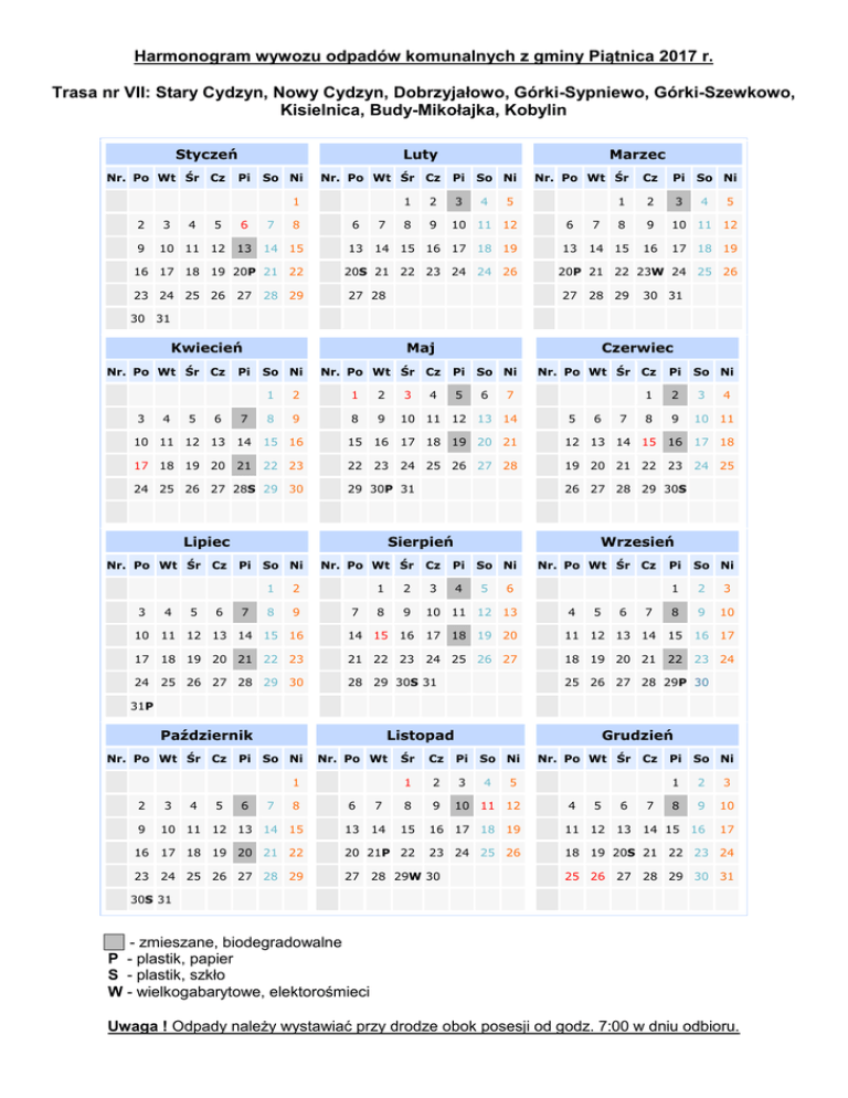 Harmonogram wywozu odpadów komunalnych z gminy Piątnica 2017 r. Trasa nr VII: Stary Cydzyn, Nowy Cydzyn, Dobrzyjałowo, Górki-Sypniewo, Górki-Szewkowo, Kisielnica, Budy-Mikołajka, Kobylin Styczeń Nr. Po Wt Śr Cz Luty Pi So Ni Nr. Po Wt Śr Cz 1 2 9 3 4 5 10 11 12 6 13 7 8 14 15 16 17 18 19 20P 21 22 23 24 25 26 27 28 29 6 13 7 1 2 8 9 Marzec Pi 3 So Ni 4 Nr. Po Wt Śr 5 10 11 12 14 15 16 17 18 19 20S 21 22 23 24 24 26 27 28 6 13 7 Cz Pi 1 2 3 8 9 10 11 12 16 17 18 19 14 15 So Ni 4 5 20P 21 22 23W 24 25 26 27 28 29 30 31 30 31 Kwiecień Nr. Po Wt Śr Cz 3 4 5 6 Pi 7 Maj So Ni Nr. Po Wt Śr Cz 3 Czerwiec Pi 4 5 So Ni 1 2 1 2 6 8 9 8 9 10 11 12 13 14 Nr. Po Wt Śr Cz 7 5 6 7 Pi So Ni 1 2 3 4 8 9 10 11 10 11 12 13 14 15 16 15 16 17 18 19 20 21 12 13 14 15 16 17 18 17 18 19 20 21 22 23 22 23 24 25 26 27 28 19 20 21 22 23 24 25 24 25 26 27 28S 29 30 29 30P 31 Lipiec Nr. Po Wt Śr Cz 3 4 5 6 26 27 28 29 30S Sierpień Pi 7 So Ni 1 2 8 9 Nr. Po Wt Śr 7 Wrzesień Cz Pi 3 4 So Ni 1 2 5 8 9 10 11 12 13 Nr. Po Wt Śr Cz 6 4 5 6 7 Pi So Ni 1 2 3 8 9 10 10 11 12 13 14 15 16 14 15 16 17 18 19 20 11 12 13 14 15 16 17 17 18 19 20 21 22 23 21 22 23 24 25 26 27 18 19 20 21 22 23 24 24 25 26 27 28 29 30 28 29 30S 31 25 26 27 28 29P 30 31P Październik Nr. Po Wt Śr Cz Pi Listopad So Ni Nr. Po Wt 1 2 3 4 5 6 7 8 Grudzień Śr Cz Pi 1 2 3 9 6 7 8 14 So Ni 4 Nr. Po Wt Śr Cz 5 10 11 12 4 5 6 So Ni 1 2 3 8 9 10 14 15 16 17 7 9 10 11 12 13 14 15 13 15 16 17 18 19 11 12 16 17 18 19 20 21 22 20 21P 22 23 24 25 26 18 19 20S 21 22 23 24 23 24 25 26 27 28 29 27 28 29W 30 25 26 13 Pi 27 28 29 30 31 30S 31 - zmieszane, biodegradowalne P - plastik, papier S - plastik, szkło W - wielkogabarytowe, elektorośmieci Uwaga ! Odpady należy wystawiać przy drodze obok posesji od godz. 7:00 w dniu odbioru.