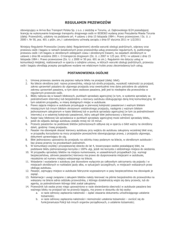 REGULAMIN PRZEWOZÓW obowiązujący w Arriva Bus Transport Polska Sp. z o.o. z siedzibą w Toruniu, ul. Dąbrowskiego 8/24 posiadającej licencję na wykonywanie krajowego transportu drogowego osób nr 0038363 wydaną przez Prezydenta Miasta Torunia (dalej: Przewoźnik), ustalony na podstawie art. 4 ustawy z dnia 15 listopada 1984 r. Prawo przewozowe / Dz. U. z 2000 r. Nr 50, poz. 601 z późn. zm./ i zatwierdzony uchwałą zarządu z dnia 07 stycznia 2011 nr 1/Z/2011 Niniejszy Regulamin Przewozów (zwany dalej: Regulaminem) określa warunki obsługi podróżnych, odprawy oraz przewozu osób i bagażu w ramach świadczonych przez przewoźnika usług przewozów regularnych, tj. publicznego przewozu osób i ich bagażu w określonych odstępach czasu i określonymi trasami, na zasadach określonych w ustawie z dnia 06 września 2001 r. O transporcie drogowym (Dz. U. z 2007 nr 125 poz. 874) i w ustawie z dnia 15 listopada 1984 r. Prawo przewozowe (Dz. U. z 2000 nr 50 poz. 601 ze zm.). Regulamin nie dotyczy usług w komunikacji miejskiej, realizowanych w oparciu o odrębne umowy, w których warunki obsługi podróżnych, przewozu osób i bagażu określają przepisy porządkowe wydane we właściwym trybie przez zleceniodawcę tych usług. POSTANOWIENIA OGÓLNE 1. 2. 3. 4. 5. 6. 7. 8. 9. 10. 11. 12. 13. 14. Umowę przewozu zawiera się poprzez nabycie biletu na przejazd (dalej: bilet). Na bilecie określona jest: nazwa przewoźnika, relacja lub strefa przejazdu, wysokość należności za przejazd, zakres uprawnień pasażera do ulgowego przejazdu oraz ewentualnie inne dane potrzebne do ustalenia zakresu uprawnień pasażera, w tym dane osobowe pasażera, jeśli jest to niezbędne dla przewoźnika w regularnym przewozie osób. Bilety nabywa się w kasach biletowych, punktach sprzedaży agencyjnej (w tym, w systemie sprzedaży za pośrednictwem internetu) lub bezpośrednio u kierowcy autobusu obsługującego daną linię komunikacyjną. W tym ostatnim przypadku, w miarę dostępnych miejsc w autobusie. Prawo zajęcia miejsca w autobusie przysługuje w pierwszej kolejności pasażerowi z ważnym biletem miesięcznym lub innym biletem okresowym wielokrotnego przejazdu, następnie z ważnym biletem jednorazowym zakupionym w kasie biletowej lub w punkcie sprzedaży agencyjnej (w tym za pośrednictwem internetu) a w ostatniej kolejności pasażerowi, który zakupił bilet jednorazowy u kierowcy. Kasjer kasy biletowej lub sprzedawca w punktach sprzedaży agencyjnej może odmówić sprzedaży biletu, jeżeli do odjazdu danego autobusu zostało mniej niż 10 minut. Przewóz pasażerów na podstawie biletów jednorazowych odbywa się w oparciu o bilet ważny na określony dzień, godzinę i trasę przejazdu. Pasażer ma obowiązek okazać kierowcy autobusu przy wejściu do autobusu zakupiony wcześniej bilet oraz, w przypadku korzystania na mocy przepisów powszechnie obowiązującego prawa, z przejazdu ulgowego, dokument uprawniający do ulg. Bilet jednorazowy upoważnia do przejazdu na odcinku trasy podanym na bilecie, w określonym autobusie i bez prawa przerwy na przystankach pośrednich. W komunikacji zwykłej i przyspieszonej dziecko do lat 4, towarzyszące osobie posiadającej bilet, na podstawie biletu jednorazowego korzysta z 100% ulgi, jeżeli nie korzysta z oddzielnego miejsca do siedzenia. W przypadku sprzedaży biletów na miejsca numerowane, w uzasadnionych przypadkach (np. wymogi bezpieczeństwa, zdrowie pasażerów) kierowca ma prawo do dysponowania miejscami w autobusie, niezależnie od numeru miejsca wskazanego na bilecie. Wsiadanie i wysiadanie z autobusu jest dozwolone wyłącznie po całkowitym zatrzymaniu się pojazdu i w miejscach określonych w rozkładzie jazdy albo, w sytuacjach szczególnych, w miejscach wskazanych przez obsługę autobusu. Pasażer, zajmujący miejsce w autobusie fabrycznie wyposażonym w pasy bezpieczeństwa ma obowiązek je zapiąć. Reklamacje i uwagi związane z zakupem biletów należy kierować na piśmie bezpośrednio do przewoźnika na wskazany na bilecie adres oddziału przewoźnika, z którego działalnością wiąże się dany przewóz, lub do agenta, za pośrednictwem którego bilet został zakupiony. Przewoźnik lub osoba przez niego upoważniona w razie stwierdzenia obecności w autobusie pasażera bez ważnego biletu na przejazd lub na przewóz bagażu, ma prawo w stosunku do tej osoby: a. w razie odmowy zapłacenia należności – żądać okazania dokumentu umożliwiającego ustalenie tożsamości; b. w razie odmowy zapłacenia należności i niemożności ustalenia tożsamości – zwrócić się do funkcjonariusza Policji lub innych organów porządkowych, o ustalenie tożsamości; c. w razie uzasadnionego podejrzenia, że bilet lub dokument uprawniający do przejazdu ulgowego jest podrobiony lub przerobiony lub należy do innej osoby niż posługujący się nim pasażer, zatrzymać bilet lub dokument za pokwitowaniem i przesłać go organom ścigania, powiadamiając, w dwóch pierwszych przypadkach, o tym fakcie wystawcę dokumentu. 15. Pasażer przed wejściem do autobusu zobowiązany jest upewnić się, czy pojazd, którym zamierza odbyć podróż jest właściwy, jak też pasażer zobowiązany jest upewnić się, czy wysiada na właściwym przystanku. II. ZASADY KORZYSTANIA Z BILETÓW 1. 2. 3. 4. 5. 6. 7. 8. 9. 10. 11. 12. 13. 14. 15. Niezwłocznie po nabyciu biletu pasażer powinien sprawdzić prawidłowość jego wystawienia. Po odejściu od kasy biletowej reklamacje nie będą uwzględniane. Przedsprzedaż biletów prowadzona jest maksymalnie na 30 dni przed planowaną podróżą. Po zajęciu miejsca w autobusie zabronione jest przekazywanie biletu innym pasażerom. W miejsce biletów na okaziciela skradzionych lub zagubionych nie wystawia się duplikatów. Bilet zniszczony, uszkodzony lub poprawiany jest nieważny. Bilety miesięczne (imienne) wydaje się na okres miesiąca kalendarzowego (wszystkie dni miesiąca kalendarzowego),