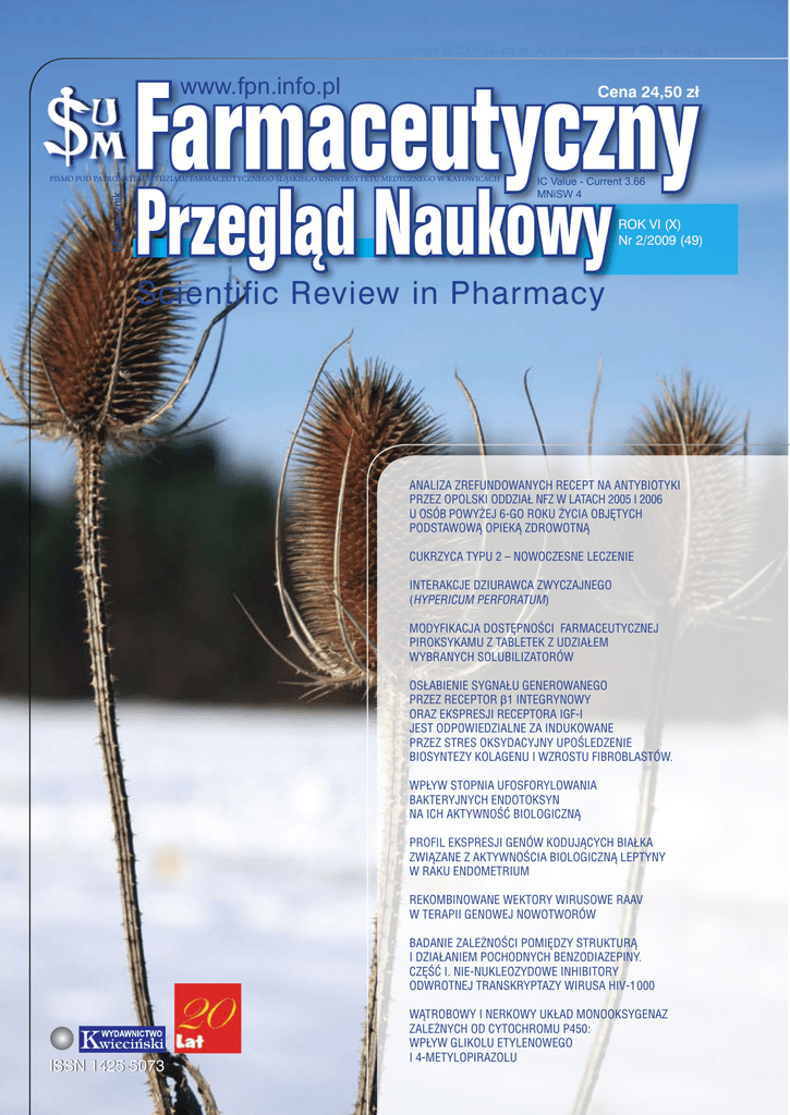 copyright © 2009 Grupa dr. A. R. Kwiecińskiego ISSN 1425-5073 Farmaceutyczny www.fpn.info.pl Cena 24,50 zł Przegląd Naukowy Miesięcznik PISMO POD PATRONATEM WYDZIAŁU FARMACEUTYCZNEGO ŚLĄSKIEGO UNIWERSYTETU MEDYCZNEGO W KATOWICACH IC Value - Current 3.66 MNiSW 4 ROK VI (X) Nr 2/2009 (49) Scientific Review in Pharmacy Analiza zrefundowanych recept na antybiotyki przez Opolski Oddział NFZ w latach 2005 i 2006 u osób powyżej 6-go roku życia objętych Podstawową Opieką Zdrowotną Cukrzyca typu 2 – nowoczesne leczenie Interakcje Dziurawca zwyczajnego (Hypericum perforatum) Modyfikacja dostępności farmaceutycznej piroksykamu z tabletek z udziałem wybranych solubilizatorów 0 Osłabienie sygnału generowanego przez receptor β1 integrynowy oraz ekspresji receptora IGF-I jest odpowiedzialne za indukowane przez stres oksydacyjny upośledzenie biosyntezy kolagenu i wzrostu fibroblastów. Wpływ stopnia ufosforylowania bakteryjnych endotoksyn na ich aktywność biologiczną Profil ekspresji genów kodujących białka związane z aktywnościa biologiczną leptyny w raku endometrium Rekombinowane wektory wirusowe rAAV w terapii genowej nowotworów Badanie zależności pomiędzy strukturą i działaniem pochodnych benzodiazepiny. Część I. Nie-nukleozydowe inhibitory odwrotnej transkryptazy wirusa HIV-10000 ISSN 1425-5073 Wątrobowy i nerkowy układ monooksygenaz zależnych od cytochromu P450: wpływ glikolu etylenowego i 4-metylopirazolu 1 Farmaceutyczny Przegląd Naukowy Miesięcznik PISMO POD PATRONATEM WYDZIAŁU FARMACEUTYCZNEGO ŚLĄSKIEGO UNIWERSYTETU MEDYCZNEGO W KATOWICACH Index Copernicus 2,51 Scientific Review in Pharmacy Redaktor Naczelny: Prof. dr hab. Krystyna Olczyk Adres redakcji: 41-200 Sosnowiec, ul. Jedności 8 Tel. 500 722 219 Fax. 032/364-11-34 Mail: [email protected] Spis treści Konsultacyjna Rada Naukowa Przewodniczący: Prof. dr hab. Krystyna Olczyk - Sosnowiec Członkowie: Prof. dr hab. Edward Bańkowski - Białystok Prof. dr hab. Jerzy Brandys - Kraków Prof. dr hab. Elżbieta Brzezińska - Łódź Prof. dr hab. Kazimierz Głowniak -Lublin Prof. dr hab. Edmund Grześkowiak - Poznań Prof. dr hab. Ewa Jagiełło-Wójtowicz - Lublin Prof. dr hab. Krzysztof Jonderko - Sosnowiec Prof. dr hab. Marcin Kamiński - Katowice Prof. dr hab. Jan Pachecka - Warszawa Prof. dr hab. Jerzy Pałka - Białystok Prof. dr hab. Janusz Pluta - Wrocław Prof. dr hab. Janusz Solski - Lublin Prof. dr hab. Marek Wesołowski - Gdańsk Sekretarz Naukowy: Dr n. med. Robert D. Wojtyczka Członkowie Kolegium Redakcyjnego: Dr n. farm. Paweł Olczyk Dr n. biol. Małgorzata Kępa Mgr Anna Szeremeta Mgr Agnieszka Jura – Półtorak Wydawca: Grupa dr. A. R. Kwiecińskiego Adres Wydawcy: Grupa dr. A. R. Kwiecińskiego ul. Wiśniowa 25/2, 43-300 Bielsko-Biała tel. (0-33) 817-28-79 fax (0-33)817-36-31 Prezes: dr n. med. Adam Kwieciński Marketing Manager: Agnieszka Romańska [email protected] Opracowanie graficzne: Robert Cyganik Skład: Jerzy Partyka Nakład: do 7 000 egz. Wszystkie materiały opublikowane w piśmie objęte są ochroną Prawa autorskiego. Projekty chronione są Ustawą o Prawie autorskim i pokrewnych prawach z 1994 r. (Dz. U. Nr 24, poz. 83). Redakcja zastrzega sobie prawo dostosowania nadesłanych materiałów do potrzeb pisma. Przedruki możliwe jedynie za zgodą wydawcy. Za treść materiałów reklamowych oraz listów od czytelników redakcja nie odpowiada. Analiza zrefundowanych recept na antybiotyki przez Opolski Oddział NFZ w latach 2005 i 2006 u osób powyżej 6-go roku życia objętych Podstawową Opieką Zdrowotną 7 Cukrzyca typu 2 – nowoczesne leczenie 14 Interakcje Dziurawca zwyczajnego (Hypericum perforatum) 19 Modyfikacja dostępności farmaceutycznej piroksykamu z tabletek z udziałem wybranych solubilizatorów 0 24 Osłabienie sygnału generowanego przez receptor β1 integrynowy oraz ekspresji receptora IGF-I jest odpowiedzialne za indukowane przez stres oksydacyjny upośledzenie biosyntezy kolagenu i wzrostu fibroblastów. 28 Wpływ stopnia ufosforylowania bakteryjnych endotoksyn na ich aktywność biologiczną0 35 Profil ekspresji genów kodujących białka związane z aktywnościa biologiczną leptyny w raku endometrium0 43 Rekombinowane wektory wirusowe rAAV w terapii genowej nowotworów0 48 Badanie zależności pomiędzy strukturą i działaniem pochodnych benzodiazepiny. Część I. Nie-nukleozydowe inhibitory odwrotnej transkryptazy wirusa HIV-10 52 Wątrobowy i nerkowy układ monooksygenaz zależnych od cytochromu P450: wpływ glikolu etylenowego i 4-metylopirazolu 61 Szanowni Państwo, Koleżanki i Koledzy, Drodzy Czytelnicy Serdecznie zapraszam na łamy kolejnego numeru Farmaceutycznego Przeglądu Naukowego. Zawiera on prace o zróżnicowanej tematyce z zakresu nauk farmaceutycznych, ale i pokrewnych dziedzin biomedycznych. W niniejszym numerze zamieszczamy także krótki, anglojęzyczny artykuł pod tytułem „Community pharmacy in Turkey”, a to w związku ze zbliżającym się, 69. Międzynarodowym Kongresem FIP (International Pharmaceutical Federation), który odbędzie się w Stambule, w dniach 3 – 8 września bieżącego roku. Artykuł pokrótce omawia sytuację społeczno – polityczną w Turcji, oczekującej od 1999 roku na przyjęcie w poczet członków Unii Europejskiej, i na tym tle – sytuację farmaceutów – pracowników aptek ogólnodostępnych, także w aspekcie obecnego i prognozowanego zatrudnienia. Zamieszcza informacje na temat wybranych zagadnień prawa farmaceutycznego, wskazuje najważniejsze zmiany w przeddyplomowym kształceniu farmaceutów, odnosząc się także do kwestii kształcenia techników farmaceutycznych. Warto przeczytać ten syntetyczny opis najważniejszych problemów nurtujących farmaceutów w Turcji, kwestii wcale nie tak odległych od tych, które napotykamy na co dzień i u nas. Autor artykułu wyraża nadzieję, iż nadcho- dzący Kongres stanie się sposobnością do żywej dyskusji na temat wsz