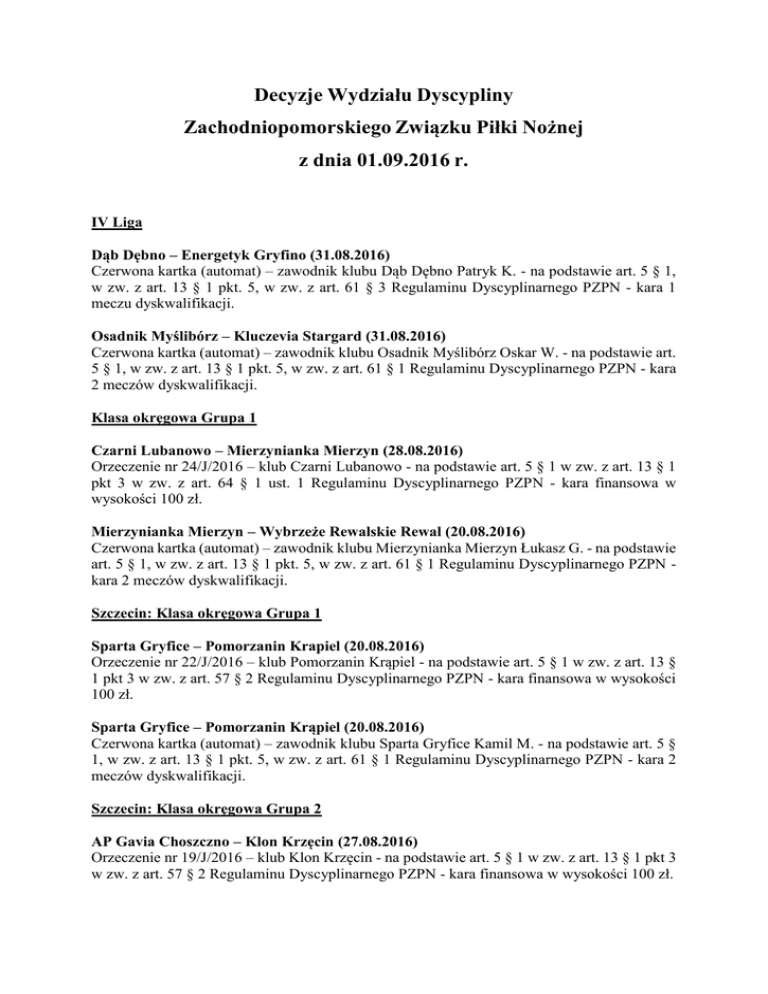 Decyzje Wydziału Dyscypliny Zachodniopomorskiego Związku Piłki Nożnej z dnia 01.09.2016 r. IV Liga Dąb Dębno – Energetyk Gryfino (31.08.2016) Czerwona kartka (automat) – zawodnik klubu Dąb Dębno Patryk K. - na podstawie art. 5 § 1, w zw. z art. 13 § 1 pkt. 5, w zw. z art. 61 § 3 Regulaminu Dyscyplinarnego PZPN - kara 1 meczu dyskwalifikacji. Osadnik Myślibórz – Kluczevia Stargard (31.08.2016) Czerwona kartka (automat) – zawodnik klubu Osadnik Myślibórz Oskar W. - na podstawie art. 5 § 1, w zw. z art. 13 § 1 pkt. 5, w zw. z art. 61 § 1 Regulaminu Dyscyplinarnego PZPN - kara 2 meczów dyskwalifikacji. Klasa okręgowa Grupa 1 Czarni Lubanowo – Mierzynianka Mierzyn (28.08.2016) Orzeczenie nr 24/J/2016 – klub Czarni Lubanowo - na podstawie art. 5 § 1 w zw. z art. 13 § 1 pkt 3 w zw. z art. 64 § 1 ust. 1 Regulaminu Dyscyplinarnego PZPN - kara finansowa w wysokości 100 zł. Mierzynianka Mierzyn – Wybrzeże Rewalskie Rewal (20.08.2016) Czerwona kartka (automat) – zawodnik klubu Mierzynianka Mierzyn Łukasz G. - na podstawie art. 5 § 1, w zw. z art. 13 § 1 pkt. 5, w zw. z art. 61 § 1 Regulaminu Dyscyplinarnego PZPN kara 2 meczów dyskwalifikacji. Szczecin: Klasa okręgowa Grupa 1 Sparta Gryfice – Pomorzanin Krapiel (20.08.2016) Orzeczenie nr 22/J/2016 – klub Pomorzanin Krąpiel - na podstawie art. 5 § 1 w zw. z art. 13 § 1 pkt 3 w zw. z art. 57 § 2 Regulaminu Dyscyplinarnego PZPN - kara finansowa w wysokości 100 zł. Sparta Gryfice – Pomorzanin Krąpiel (20.08.2016) Czerwona kartka (automat) – zawodnik klubu Sparta Gryfice Kamil M. - na podstawie art. 5 § 1, w zw. z art. 13 § 1 pkt. 5, w zw. z art. 61 § 1 Regulaminu Dyscyplinarnego PZPN - kara 2 meczów dyskwalifikacji. Szczecin: Klasa okręgowa Grupa 2 AP Gavia Choszczno – Klon Krzęcin (27.08.2016) Orzeczenie nr 19/J/2016 – klub Klon Krzęcin - na podstawie art. 5 § 1 w zw. z art. 13 § 1 pkt 3 w zw. z art. 57 § 2 Regulaminu Dyscyplinarnego PZPN - kara finansowa w wysokości 100 zł. Klasa A Grupa 2 Orzeł Pęzino – Dąb Dębice (27.08.2016) Czerwona kartka (automat) – zawodnik klubu Dąb Dębice Łukasz P. - na podstawie art. 5 § 1, w zw. z art. 13 § 1 pkt. 5, w zw. z art. 61 § 1 Regulaminu Dyscyplinarnego PZPN - kara 2 meczów dyskwalifikacji. Czerwona kartka (automat) – zawodnik klubu Orzeł Pęzino Łukasz F. - na podstawie art. 5 § 1, w zw. z art. 13 § 1 pkt. 5, w zw. z art. 61 § 1 Regulaminu Dyscyplinarnego PZPN - kara 2 meczów dyskwalifikacji. Klasa A Grupa 3 Sparta Skalin – Arkonia II Szczecin (27.08.2016) Czerwona kartka (automat) – zawodnik klubu Arkonia II Szczecin Mateusz B. - na podstawie art. 5 § 1, w zw. z art. 13 § 1 pkt. 5, w zw. z art. 61 § 1 Regulaminu Dyscyplinarnego PZPN kara 2 meczów dyskwalifikacji. Kasta Majowe – Hanza Goleniów (27.08.2016) Czerwona kartka (automat) – zawodnik klubu Hanza Goleniów Paweł K. - na podstawie art. 5 § 1, w zw. z art. 13 § 1 pkt. 5, w zw. z art. 61 § 1 Regulaminu Dyscyplinarnego PZPN - kara 2 meczów dyskwalifikacji. Klasa A Grupa 4 Iskra Banie – Energetyk II Gryfino (27.08.2016) Orzeczenie nr 20/J/2016 – klub Energetyk II Gryfino - na podstawie art. 5 § 1 w zw. z art. 13 § 1 pkt 3 w zw. z art. 57 § 2 Regulaminu Dyscyplinarnego PZPN - kara finansowa w wysokości 100 zł. Iskra Banie – Energetyk II Gryfino (27.08.2016) Czerwona kartka (automat) – zawodnik klubu Energetyk II Gryfino Jakub D. - na podstawie art. 5 § 1, w zw. z art. 13 § 1 pkt. 5, w zw. z art. 61 § 1 Regulaminu Dyscyplinarnego PZPN kara 2 meczów dyskwalifikacji. Klasa A Grupa 5 Błękitni Sarnik – Ina Nadarzyn (28.08.2016) Orzeczenie nr 18/J/2016 – zawodnik klubu Ina Nadarzyn Radosław W. - na podstawie art. 5 § 1, w zw. z art. 13 § 1 pkt. 5, w zw. z art. 110 § 1 pkt 2b Regulaminu Dyscyplinarnego PZPN kara 2 meczów dyskwalifikacji. Orzeł Bierzwnik – Remor Recz (28.08.2016) Czerwona kartka (automat) – zawodnik klubu Orzeł Bierzwnik Krystian J. - na podstawie art. 5 § 1, w zw. z art. 13 § 1 pkt. 5, w zw. z art. 61 § 1 Regulaminu Dyscyplinarnego PZPN - kara 2 meczów dyskwalifikacji. Korona Raduń – Pomorzanin Zamęcin (28.08.2016) Czerwona kartka (automat) – zawodnik klubu Pomorzanin Zamęcin Marcin L. - na podstawie art. 5 § 1, w zw. z art. 13 § 1 pkt. 5, w zw. z art. 61 § 1 Regulaminu Dyscyplinarnego PZPN kara 2 meczów dyskwalifikacji. Czerwona kartka (automat) – zawodnik klubu Korona Raduń Jakub L. - na podstawie art. 5 § 1, w zw. z art. 13 § 1 pkt. 5, w zw. z art. 61 § 1 Regulaminu Dyscyplinarnego PZPN - kara 2 meczów dyskwalifikacji. Sokół Sokoliniec – Iskra Pomień (28.08.2016) Czerwona kartka (automat) – zawodnik klubu Iskra Pomień Bartłomiej K. - na podstawie art. 5 § 1, w zw. z art. 13 § 1 pkt. 5, w zw. z art. 61 § 1 Regulaminu Dyscyplinarnego PZPN - kara 2 meczów dyskwalifikacji. Klasa B Grupa 1 Światowid Łobez – Światowid 63 II Łobez (27.08.2016) Orzeczenie nr 21/J/2016 – klub Światowid Łobez - na podstawie § 17 ust. 5 Regulaminu Rozgrywek Mistrzowskich ZZPN - kara finansowa w wysokości 100 zł. Klasa B Grupa 2 Błyskawica Kluki – Bryza Reńsko (28.08.2016) Czerwona kartka (automat) – zawodnik klubu Bryza Reńsko Krzysztof P. - na podstawie art. 5 § 1, w zw. z art. 13 § 1 pkt. 5, w zw. z art. 61 § 1 Regulaminu Dyscyplinarnego PZPN - kara 2 meczów dyskwalifikacji. I liga wojewódzka A1 Junior „WLJ Starszych” Błękitni Stargard – Gwardia Koszalin (27.08.2016) Czerwona kartka (automat) – zawodnik klubu Gwardia Koszalin Kacper P. - na podstawie art. 5 § 1, w zw. z art. 13 § 1 pkt. 5, w zw. z art. 61 § 1 Regulaminu Dyscyplinarnego PZPN - kara 2 meczów dyskwalifikacji. Gwardia Koszalin – Świt Szczecin (31.08.2016) Czerwona kartka (automat) – zawodnik klubu Gwardia Koszalin Oskar B. - na podstawie art. 5 § 1, w zw. z art. 13 § 1 pkt. 5, w zw. z art. 61 § 1 Regulaminu Dyscyplinarnego PZPN - kara 2 meczów dyskwalifikacji. Czerwona kartka (au