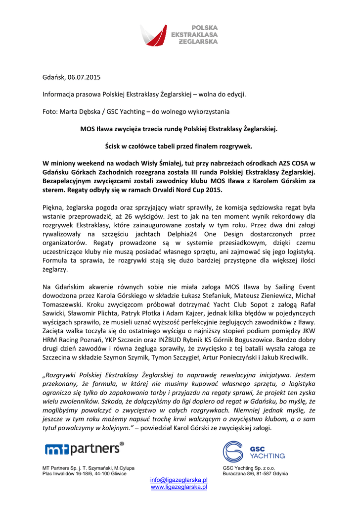 Gdańsk, 06.07.2015 Informacja prasowa Polskiej Ekstraklasy Żeglarskiej – wolna do edycji. Foto: Marta Dębska / GSC Yachting – do wolnego wykorzystania MOS Iława zwycięża trzecia rundę Polskiej Ekstraklasy Żeglarskiej. Żeglarskiej Ścisk w czołówce tabeli przed finałem rozgrywek. W miniony weekend na wodach Wisły Śmiałej, tuż przy nabrzeżach ośrodkach AZS COSA w Gdańsku Górkach Zachodnich rozegrana została III runda Polskiej Ekstraklasy Żeglarskiej. Żeglarskiej Bezapelacyjnym zwycięzcami zostali zawodnicy klubu MOS Iława z Karolem Górskim za sterem. Regaty odbyły się w ramach Orvaldi Nord Cup 2015. Piękna, żeglarska pogoda oraz sprzyjający wiatr sprawiły, że komisja sędziowska regat była wstanie przeprowadzić, aż 26 wyścigów. Jest to jak na ten moment wynik rekordowy dla rozgrywek Ekstraklasy, które zainaugurowane zostały w tym roku. Przez dwa dni załogi rywalizowały na szczęściu jachtach Delphia24 One Design dostarczonych przez organizatorów. Regaty prowadzone są w systemie przesiadkowym, dzięki czemu uczestniczące kluby nie muszą posiadać własnego sprzętu, ani zajmować się jego logistyką. Formuła ta sprawia, że rozgrywki stają się dużo bardziej przystępne dla większej ilości żeglarzy. Na Gdańskim akwenie równych sobie nie miała załoga MOS Iława by Sailing Event dowodzona przez Karola Górskiego w składzie Łukasz Stefaniuk, Mateusz Zieniewicz, Michał Tomaszewski. Kroku zwycięzcom próbował dotrzymać Yacht Club Sopot z załogą Rafał Sawicki, Sławomir Plichta, Patryk Płotka i Adam Kajzer, jednak kilka błędów w pojedynczych wyścigach sprawiło, że musieli uznać wyższość perfekcyjnie żeglujących zawodników z Iławy. Zacięta walka toczyła się do ostatniego wyścigu o najniższy stopień podium pomiędzy pomiędz JKW HRM Racing Poznań, YKP Szczecin oraz INŻBUD Rybnik KS Górnik Boguszowice. Bardzo dobry drugi dzień zawodów i równa żegluga sprawiły, że zwycięsko z tej batalii wyszła załoga ze Szczecina w składzie Szymon Szymik, Szymik, Tymon Szczygieł, Artur Ponieczyński i Jakub Kreciwilk. „Rozgrywki Polskiej Ekstraklasy Żeglarskiej to naprawdę rewelacyjna inicjatywa. Jestem przekonany, że formuła, w której nie musimy kupować własnego sprzętu, a logistyka ogranicza się tylko do zapakowania torby i przyjazdu na regaty sprawi, sprawi, że projekt ten zyska wielu zwolenników. Szkoda, że dołączyliśmy do ligi dopiero od regat w Gdańsku, bo myślę, że moglibyśmy powalczyć o zwycięstwo w całych rozgrywkach. Niemniej jednak myślę, że jeszcze w tym roku możemy napsuć trochę krwi walczącym o zwycięstwo zwycięstwo klubom, a o sam tytuł powalczymy w kolejnym.” – powiedział Karol Górski ze zwycięskiej załogi. MT Partners Sp. j. T. Szymański, ski, M.Cylupa Plac Inwalidów 16-18/6, 44-100 Gliwice GSC Yachting Sp. z o.o. Buraczana 8/6, 81-587 81 Gdynia [email protected] www.ligazeglarska.pl „Cieszymy się, że III runda naszych rozgrywek odbyła się w ramach wielkiego święta żeglarstwa jakim jest Orvaldi Nord Cup. W ośrodku AZS COSA Gdańsk w jednym czasie spotkało się wielu żeglarzy z Polski i ze świata, co pozwoliło na znakomitą integrację środowiska, co jest jednym z głównych celów naszej Ligi.” – dodaje Rafał Sawicki współorganizator Polskiej Ekstraklasy Żeglarskiej, a jednocześnie sternik Yacht Club Sopot w gdańskich zawodach. Wynik III Rundy Polskiej Ekstraklasy Żeglarskiej 1. MOS Iława by Sailing Event 2. Yacht Club Sopot 3. YKP Szczecin 4. JKW HRM Racing Poznań 5. Inżbud Rybnik KS Górnik Boguszowice 6. JKM Gryf Gdynia 7. PŻKS DŻYGIT Białystok 8. MUKŻ Bałtyk Mielno 9. AutoFit KŻ Ostróda 10. YKP Warszawa 11. KŻ Horn Kraków 21pkt. 22pkt. 33pkt. 39pkt. 40pkt. 47pkt. 49pkt. 55pkt. 58pkt. 59pkt. DNS Mimo czwartego miejsca w Gdańsku, prowadzenie w tabeli Ekstraklasy utrzymał JKW Poznań, ale jego przewaga zewaga stopniała tylko do jednego punktu. W walce o zwycięstwo w Lidze powalczyć jeszcze mogą YKP Szczecin, Yacht Club Sopot, JKM Gryf Gdynia, matematyczne szanse zachowuje również Inżbud Rybnik. Rybnik. Rywalizacja w finałowej imprezie, która rozegrana zostanie w dniach 8-9.08.2015 9.08.2015 przy sopockim molo zapowiada się naprawdę pasjonująco. Pierwsze dwa kluby Ligi otrzymają prawo startu w światowych rozgrywkach Sailing Champions League http://sailing-championsleague.com/. http://sailing Żeglarskie skie ligi krajowe cieszą się coraz większą popularnością.. U naszych zachodnich sąsiadów Niemców oraz w Danii istnieją już dwie ligi, a w tym roku rozgrywki zainaugurowały również Austria, Finlandia, Holandia, Norwegia, Rosja, Słowenia, Szwajcaria, Szwecja, USA, Wielka Brytania i Włochy. Tegoroczny finał Ligi Światowej odbędzie się w drugiej połowie września w jednym z najlepszych klubów żeglarskich w Europie – Yacht Club Costa Smeralda w Porto Cervo na Sardynii. Aktualna klasyfikacja Polskiej olskiej Ekstraklasy Żeglarskiej po trzech imprezach. 1. JKW Poznań 33 pkt 2. YKP Szczecin 32 pkt 3. YC Sopot 29 pkt 4. JKM Gryf Gdynia 27 pkt 5. KS Górnik Boguszowice - Rybnik 26 pkt 7. MUKZ Bałtyk Mielno 19 pkt MT Partners Sp. j. T. Szymański, ski, M.Cylupa Plac Inwalidów 16-18/6, 44-100 Gliwice GSC Yachting Sp. z o.o. Buraczana 8/6, 81-587 81 Gdynia [email protected] www.ligazeglarska.pl 6. KZ Ostróda 8. PŻKS Dżygit Białystok 9. MOS Iława 10. KZ Horn Kraków 11. YKP Warszawa 18 pkt 16 pkt 13 pkt 4 pkt 3 pkt Organizatorami Polskiej Ekstraklasy Żeglarskiej są firmy MT Partners oraz GSC Yachting. Partnerami rundy w Gdańsku są: Hotel Galion, Nautica Nord, Delphia phia Yachts Kot, D.A.D, Garmin, NCŻ Gdańsk. Patronat medialny: Prestiż Magazyn Trójmiejski, W Ślizgu!, Trojmiasto.pl, Radio Gdańsk. Więcej informacji można znaleźć na stronie www.ligazeglarska.pl oraz na profilu ligi na facebooku. Kalendarz alendarz regat Polskiej Ekstraklasy Żeglarskiej w sezonie 2015