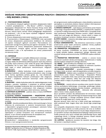 OGÓLNE WARUNKI UBEZPIECZENIA MAŁYCH I ŚREDNICH PRZEDSIĘBIORSTW – MÓJ BIZNES (19033) § 2. DEFINICJE Użyte w OWU definicje (w porządku alfabetycznym) oznaczają: 1) AKTY TERRORU – działanie mające na celu wywarcie wpływu na organy władzy lub administracji publicznej poprzez użycie siły, przemocy lub groźby użycia przemocy przez osobę lub grupę osób działających samodzielnie, lub na rzecz, bądź z ramienia jakiejkolwiek organizacji, bądź rządu w celach politycznych, ekonomicznych, religijnych, ideologicznych; 2) BUDOWLE – obiekty budowlane trwale związane z gruntem, nie będące budynkami, takie jak: instalacje przemysłowe, wiaty, rurociągi, wieże, kominy, ogrodzenia, parkany, garaże, itp., oraz wbudowane, nie służące bezpośrednio funkcjom produkcyjnym i/lub usługowym instalacje i urządzenia techniczne stanowiące całość techniczną i użytkową; 3) BUDYNKI – obiekty budowlane jedno lub wielokondygnacyjne trwale związane z gruntem, wydzielone z przestrzeni za pomocą przegród budowlanych, posiadające fundamenty, dach oraz wbudowane, nie służące bezpośrednio funkcjom produkcyjnym i/lub usługowym instalacje i urządzenia techniczne stanowiące całość techniczną i użytkową; 4) CENTRUM ALARMOWE – podmiot, który w imieniu COMPENSY świadczy usługi assistance; 5) CZYSTA STRATA FINANSOWA / MAJĄTKOWA (DALEJ CZYSTA STRATA FINANSOWA) – uszczerbek majątkowy nie będący szkodą rzeczową lub osobową (dotyczy ubezpieczenia odpowiedzialności cywilnej); 6) DANE – dowolne przedstawienie faktów, informacji lub pojęć w formie właściwej do przetwarzania w systemie komputerowym, łącznie z odpowiednim oprogramowaniem powodującym wykonanie funkcji przez system informatyczny, to jest: a) bazy danych (rozumiane jako zbiory danych o określonej strukturze, zapamiętane w pamięci komputera oraz zewnętrznych nośnikach danych), w tym również oprogramowanie do zarządzania nimi, b) oprogramowanie systemowe i narzędziowe, c) biblioteki programistyczne, d) standardowe i niestandardowe w standardzie oprogramowanie firmowe, w tym oprogramowanie biurowe, e) oprogramowanie użytkowe/aplikacyjne z danej dziedziny zastosowań sporządzane na zamówienie złożone własnym służbom informatycznym w przedsiębiorstwie lub podmiotom zewnętrznym; 7) DESZCZ NAWALNY – opad deszczu potwierdzony przez Instytut Meteorologii i Gospodarki Wodnej (IMiGW), o współczynniku natężenia, co najmniej 4 według stosowanej przez IMiGW skali; w przypadku braku stacji pomiarowej obejmującej zakresem pomiaru miejsce zdarzenia, należy brać pod uwagę stan faktyczny i rozmiar szkód w miejscu ich powstania, świadczące wyraźnie o działaniu deszczu nawalnego; 8) DYM I SADZA – mieszanina ciała stałego i gazu powstała jako produkt spalania w tym na skutek pożaru; 9) FALA UDERZENIOWA – fala ciśnieniowa wytworzona w wyniku przekroczenia przez statek powietrzny prędkości równej prędkości rozchodzenia się dźwięku w atmosferze; 10) FRANSZYZA INTEGRALNA – ustalona w umowie kwota, do której wysokości COMPENSA nie ponosi odpowiedzialności w każdej szkodzie będącej następstwem jednego zdarzenia; jeżeli wysokość szkody przekracza tę kwotę, COMPENSA wypłaca odszkodowanie; 11) FRANSZYZA REDUKCYJNA – ustalona w umowie kwota lub procent wysokości szkody pomniejszający odszkodowanie w każdej szkodzie będącej następstwem jednego zdarzenia; 12) GRAD – opad atmosferyczny składający się z bryłek lodu; 13) GRAFFITI – akt wandalizmu polegający na wykonaniu rysunków, napisów lub malunków na przedmiocie ubezpieczenia; 14) HANDEL OBWOŹNY – sprzedaż przewożonego z miejsca na miejsce mienia, ze skrzyń, waliz lub bezpośrednio ze środka transportu; 15) HURAGAN – działanie wiatru o prędkości nie mniejszej niż 17,5 m/s, potwierdzone przez Instytut Meteorologii i Gospodarki Wodnej (IMiGW); w przypadku braku stacji pomiarowej obejmującej zakresem pomiaru miejsce zdarzenia, należy brać pod uwagę stan faktyczny i rozmiar szkód w miejscu ich powstania, świadczące wyraźnie o działaniu huraganu; 16) INFEKCJA – rozstrój zdrowia wywołany przez czynniki chorobotwórcze pochodzenia bakteryjnego, wirusowego, grzybiczego (zakażenia) oraz pasożytniczego (zarażenia, choroby inwazyjne – pasożytnicze); 17) KRADZIEŻ Z WŁAMANIEM – dokonanie albo usiłowanie zaboru mienia z lokalu, pojazdu lub placu: a) po uprzednim usunięciu siłą zabezpieczenia lub otworzeniu wejścia przy użyciu narzędzi, albo podrobionego lub dopasowanego klucza, bądź klucza oryginalnego, w którego posiadanie sprawca wszedł wskutek włamania do innego lokalu lub w wyniku rabunku, b) przez sprawcę, który ukrył się w lokalu przed jego zamknięciem, jeżeli pozostawił ślady mogące służyć jako dowód jego potajemnego ukrycia, c) w przypadku ubezpieczenia mienia w transporcie – dokonanie albo usiłowanie zaboru ładunku ze środka przewozu lub wraz ze środkiem przewozu (przy czym środek przewozu nie jest objęty ubezpieczeniem), po uprzednim usunięciu siłą zabezpieczenia będącego częścią konstrukcji środka przewozu przy użyciu narzędzi albo podrobionego klucza, bądź oryginalnego klucza, w którego posiadanie sprawca wszedł wskutek włamania do innego lokalu lub w wyniku rabunku; 18) LAWINA – gwałtowne zsuwanie lub staczanie mas śniegu, lodu lub kamieni z naturalnych stoków; Compensa Towarzystwo Ubezpieczeń S.A. Vienna Insurance Group KRS 6691, Sąd Rejonowy dla m.st. Warszawy, XII Wydział Gospodarczy KRS, NIP 526 02 14 686, Kapitał zakładowy: 266.639.180,00 zł - opłacony w całości Al. Jerozolimskie 162, 02-342 Warszawa Compensa Kontakt: +48 22 501 61 00, 801 120 000 1/34 21.02.2012 § 1. POSTANOWIENIA OGÓLNE 1. Na podstawie niniejszych ogólnych warunków ubezpieczenia małych i średnich przedsiębiorstw – „Mój Biznes” („OWU”), Compensa Towarzystwo Ubezpieczeń S.A. Vienna Insurance Group z
