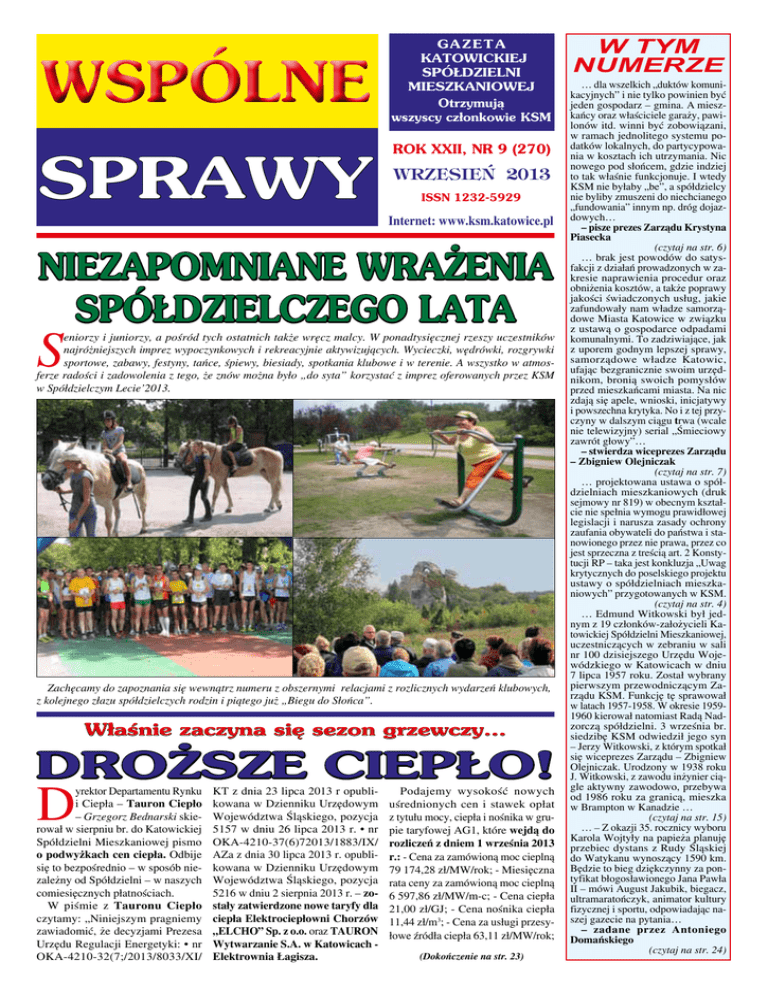 WSPÓLNE SPRAWY GAZETA KATOWICKIEJ SPÓ£DZIELNI MIESZKANIOWEJ Otrzymuj¹ wszyscy cz³onkowie KSM ROK XXII, NR 9 (270) WRZESIEŃ 2013 ISSN 1232-5929 Internet: www.ksm.katowice.pl Niezapomniane wrażenia spółdzielczego lata S eniorzy i juniorzy, a pośród tych ostatnich także wręcz malcy. W ponadtysięcznej rzeszy uczestników najróżniejszych imprez wypoczynkowych i rekreacyjnie aktywizujących. Wycieczki, wędrówki, rozgrywki sportowe, zabawy, festyny, tańce, śpiewy, biesiady, spotkania klubowe i w terenie. A wszystko w atmosferze radości i zadowolenia z tego, że znów można było „do syta” korzystać z imprez oferowanych przez KSM w Spółdzielczym Lecie’2013. Zachęcamy do zapoznania się wewnątrz numeru z obszernymi relacjami z rozlicznych wydarzeń klubowych, z kolejnego złazu spółdzielczych rodzin i piątego już „Biegu do Słońca”. Właśnie zaczyna się sezon grzewczy… Droższe ciepło! D yrektor Departamentu Rynku i Ciepła – Tauron Ciepło – Grzegorz Bednarski skierował w sierpniu br. do Katowickiej Spółdzielni Mieszkaniowej pismo o podwyżkach cen ciepła. Odbije się to bezpośrednio – w sposób niezależny od Spółdzielni – w naszych comiesięcznych płatnościach. W piśmie z Tauronu Ciepło czytamy: „Niniejszym pragniemy zawiadomić, że decyzjami Prezesa Urzędu Regulacji Energetyki: • nr OKA-4210-32(7;/2013/8033/XI/ KT z dnia 23 lipca 2013 r opublikowana w Dzienniku Urzędowym Województwa Śląskiego, pozycja 5157 w dniu 26 lipca 2013 r. • nr OKA-4210-37(6)72013/1883/IX/ AZa z dnia 30 lipca 2013 r. opublikowana w Dzienniku Urzędowym Województwa Śląskiego, pozycja 5216 w dniu 2 sierpnia 2013 r. – zostały zatwierdzone nowe taryfy dla ciepła Elektrociepłowni Chorzów „ELCHO” Sp. z o.o. oraz TAURON Wytwarzanie S.A. w Katowicach Elektrownia Łagisza. Podajemy wysokość nowych uśrednionych cen i stawek opłat z tytułu mocy, ciepła i nośnika w grupie taryfowej AG1, które wejdą do rozliczeń z dniem 1 września 2013 r.: - Cena za zamówioną moc cieplną 79 174,28 zł/MW/rok; - Miesięczna rata ceny za zamówioną moc cieplną 6 597,86 zł/MW/m-c; - Cena ciepła 21,00 zł/GJ; - Cena nośnika ciepła 11,44 zł/m3; - Cena za usługi przesyłowe źródła ciepła 63,11 zł/MW/rok; (Dokończenie na str. 23) W TYM NUMERZE … dla wszelkich „duktów komunikacyjnych” i nie tylko powinien być jeden gospodarz – gmina. A mieszkańcy oraz właściciele garaży, pawilonów itd. winni być zobowiązani, w ramach jednolitego systemu podatków lokalnych, do partycypowania w kosztach ich utrzymania. Nic nowego pod słońcem, gdzie indziej to tak właśnie funkcjonuje. I wtedy KSM nie byłaby „be”, a spółdzielcy nie byliby zmuszeni do niechcianego „fundowania” innym np. dróg dojazdowych… – pisze prezes Zarządu Krystyna Piasecka (czytaj na str. 6) … brak jest powodów do satysfakcji z działań prowadzonych w zakresie naprawienia procedur oraz obniżenia kosztów, a także poprawy jakości świadczonych usług, jakie zafundowały nam władze samorządowe Miasta Katowice w związku z ustawą o gospodarce odpadami komunalnymi. To zadziwiające, jak z uporem godnym lepszej sprawy, samorządowe władze Katowic, ufając bezgranicznie swoim urzędnikom, bronią swoich pomysłów przed mieszkańcami miasta. Na nic zdają się apele, wnioski, inicjatywy i powszechna krytyka. No i z tej przyczyny w dalszym ciągu trwa (wcale nie telewizyjny) serial „Śmieciowy zawrót głowy”… – stwierdza wiceprezes Zarządu – Zbigniew Olejniczak (czytaj na str. 7) … projektowana ustawa o spółdzielniach mieszkaniowych (druk sejmowy nr 819) w obecnym kształcie nie spełnia wymogu prawidłowej legislacji i narusza zasady ochrony zaufania obywateli do państwa i stanowionego przez nie prawa, przez co jest sprzeczna z treścią art. 2 Konstytucji RP – taka jest konkluzja „Uwag krytycznych do poselskiego projektu ustawy o spółdzielniach mieszkaniowych” przygotowanych w KSM. (czytaj na str. 4) … Edmund Witkowski był jednym z 19 członków-założycieli Katowickiej Spółdzielni Mieszkaniowej, uczestniczących w zebraniu w sali nr 100 dzisiejszego Urzędu Wojewódzkiego w Katowicach w dniu 7 lipca 1957 roku. Został wybrany pierwszym przewodniczącym Zarządu KSM. Funkcję tę sprawował w latach 1957-1958. W okresie 19591960 kierował natomiast Radą Nadzorczą spółdzielni. 3 września br. siedzibę KSM odwiedził jego syn – Jerzy Witkowski, z którym spotkał się wiceprezes Zarządu – Zbigniew Olejniczak. Urodzony w 1938 roku J. Witkowski, z zawodu inżynier ciągle aktywny zawodowo, przebywa od 1986 roku za granicą, mieszka w Brampton w Kanadzie … (czytaj na str. 15) … – Z okazji 35. rocznicy wyboru Karola Wojtyły na papieża planuję przebiec dystans z Rudy Śląskiej do Watykanu wynoszący 1590 km. Będzie to bieg dziękczynny za pontyfikat błogosławionego Jana Pawła II – mówi August Jakubik, biegacz, ultramaratończyk, animator kultury fizycznej i sportu, odpowiadając naszej gazecie na pytania… – zadane przez Antoniego Domańskiego (czytaj na str. 24) Trzy posiedzenia Komisji Nadzwyczajnej do rozpatrzenia projektów ustaw z zakresu prawa spółdzielczego Propozycje ustaw „ustrojowych” omawiane w pierwszej kolejności W ciągu dwu miesięcy, jakie upłynęły od ukazania się poprzedniego wydania „Wspólnych Spraw”, w których jak zwykle informowaliśmy o przebiegu prac w Sejmie nad zestawem ustaw poświęconych spółdzielczości ogólnie i szczegółowo spółdzielczości mieszkaniowej – „Komisja Nadzwyczajna do rozpatrzenia projektów ustaw z zakresu prawa spółdzielczego” (NPS) zebrała się aż trzykrotnie: 24 lipca, 28 sierpnia i 12 września. Swoje informacje na łamach naszego czasopisma opieramy na oficjalnych sprawozdaniach publikowanych na stronie internetowej Sejmu RP: www.sejm.gov.pl Niestety, do czasu przekazania do druku niniejszego wydania „Wspólny