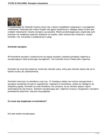ŻYCIE W HOLANDII: Wynajem mieszkania Przyjeżdżając do Holandii musimy liczyć się z dużym wydatkiem związanym z wynajęciem mieszkania. Holandia jest małym krajem ale gęsto zaludnionym, dlatego dosyć trudno jest znaleźć mieszkanie i koszty wynajmu są wysokie. Warto przestrzegać paru zasad aby tych kosztów nie zwiększyć poprzez działania na szybko, tylko zawsze być uważnym, czytać kontrakt i nie korzystać z podejrzanych usług. Kontrakt wynajmu W kontrakcie wynajmu umieszczone są reguły wynajmu zawarte pomiędzy najemcą a wynajmującym lokal przed jego wynajęciem. Ten kontrakt chroni Ciebie jako najemcę. Kontrakt nie musi być pisemny może być również ustny, który jest również ważny ale za to bardzo trudny do udowodnienia. Kontrakt może być na określony czas (np. 12 miesięcy) wtedy nie można zrezygnować z wynajmu wcześniej niż jest to uzgodnione i zapisane w kontrakcie, chyba że nastąpi to za obopólną zgodą. Kontrakt na czas określony nie oznacza, że po okresie upływu najmu automatycznie się kończy. Zarówno wynajmujący jak i najemca muszą o rezygnacji z wynajmu powiadomić pisemnie i się pod nią podpisać. Co musi się znajdować w kontrakcie? kim jest osoba wynajmująca - 1/8 ŻYCIE W HOLANDII: Wynajem mieszkania kim jest najemca wysokość czynszu wysokość depozytu adres oraz opis wynajmowanego mieszkania (ilość pokoi, łazienki, ogród oraz pozostałe) datę rozpoczęcia wynajmu czas oraz sposób płatności datę rocznej podwyżki umowę dotyczącą utrzymania mieszkania reguły domu podpis wynajmującego i najemcy 2/8 ŻYCIE W HOLANDII: Wynajem mieszkania Dobrze jest umieścić w kontrakcie stan w jakim znajduje się mieszkanie, aby w razie przeprowadzki nie było problemu ze „zdaniem” starego mieszkania. Koszty serwisu to koszty związane z dostawami i usługami świadczonymi w tym mieszkaniu (np. gaz, woda, elektryczność). Czysty czynsz oraz koszty serwisowe tworzą czynsz całkowity. Ochrona wynajmu (huurbescherming) Ochrona wynajmu chroni najemcę przez wypowiedzeniem wynajmu przez właściciela lub wynajmującego. Zarówno mieszkańcy samodzielnych lub niesamodzielnych domostw mają prawo do huurbescherming. Ochrona wynajmu nie obejmuje najemców: łodzi lub barek mieszkalnych, nieruchomości typu mieszkanie-sklep, mieszkań służbowych, domków rekreacyjnych, pokoi w domach opieki. Również najemcy bez kontraktu pisemnego a tylko ustnego mają prawo do ochrony wynajmu. Umowa ustna jest ważna tylko bardzo trudna do potwierdzenia. Jeżeli najemca nie zgadza się z wypowiedzeniem wynajmu, wtedy sąd musi zdecydować o słuszności wypowiedzenia lub jej braku. Sąd zgadza się na wypowiedzenie tylko wtedy gdy jest to zgodne z prawem. Wszelkie prawa wynajmu są opisane w Burgerlijk Wetboek. Reguły dotyczące zakończenia kontraktu Najemca jest zobowiązany do: - 3/8 ŻYCIE W HOLANDII: Wynajem mieszkania do trzymania się terminu wypowiedzenia wynajmu (musi to zrobić minimum 1 miesiąc i maksimum 3 miesiące wcześniej) wypowiedzenie musi być to wypowiedzenie pisemne i nie jest się zobowiązanym do podawania powodów jeżeli jest wynajem na określony czas, można wypowiedzieć wynajem gdy wygasa kontrakt, wcześniej można zakończyć kontrakt tylko za porozumieniem stron Reguły do wynajmującego: wypowiedzenie wynajmu musi nastąpić przynajmniej 3 miesiące wcześniej wypowiedzenie musi nastąpić listownie i własnoręcznie podpisane w liście muszą być podane powody wypowiedzenia i muszą być prawnie dozwolone jeżeli jest więcej niezależnych od siebie najemców, wtedy każda osoba musi dostać wypowiedzenie w liście musi być napisane, że w ciągu 6 tygodni najemca musi odesłać odpowiedź, że się 4/8 ŻYCIE W HOLANDII: Wynajem mieszkania zgadzają z zakończeniem kontraktu Jeżeli najemca nie odpowie w ciągu 6 tygodni, to wynajmujący może zgłosić się do sądu, który wyda orzeczenie czy zakończenie kontraktu jest prawomocne i ewentualnie poda datę eksmisji. Kiedy właściciel mieszkania może rozwiązać kontrakt Wynajmujący może zakończyć kontrakt gdy najemca złamie zasady opisane w kontrakcie, gdy jest to kontrakt tymczasowy, gdy pilnie potrzebuje do własnego użytku, wygaśnie umowa wynajmu, gdy zmienią się plany zagospodarowania terenu na którym stoi budynek. Złamanie zasad opisanych w kontrakcie oznacza, że najemca np. nie płaci czynszu itp. Wynajmujący może w tym momencie zakończyć kontrakt i również może sprawę do sądu który da najemcy maksymalnie 1 miesiąc na wyprowadzenie się. Kontrakt tymczasowy oznacza, że po upływie terminu, najemca musi się wyprowadzić. Wszystko to musi być zawarte jasno w kontrakcie. Kontrakt nie kończy się gdy mieszkanie czy dom zostanie sprzedane. Nadal ważny jest stary kontrakt. Jeżeli nowy właściciel chce zakończyć kontrakt to musi być to prawnie uzasadnione. Wspólnota mieszkaniowa (woningbouwvereniging) Wspólnota mieszkaniowa jest organizacją, która buduje mieszkania do wynajęcia, bez nastawienia na zysk. Większość mieszkań do wynajęcia w Holandii jest oferowana przez takie właśnie wspólnoty mieszkaniowe. 5/8 ŻYCIE W HOLANDII: Wynajem mieszkania Wspólnota mieszkaniowa buduje, zarządza i wynajmuje mieszkania socjalne. Takie spółdzielnie również budują domy, które są na sprzedaż. Poza tym zapewniają mieszkania dla osób starszych oraz niepełnosprawnych, które potrzebują opieki lub nadzoru. Również oferują mieszkania na sprzedaż osobom, które je przez pewien okres czasu wynajmują. Woningbouwvereniging jest często też nazywany woningcorporaties. Listę wspólnot mieszkaniowych można znaleźć na stronie www.cfv.nl/corporaties W Polsce podobną rolę odgrywają mieszkania spółdzielcze i okres oczekiwania na takie mieszkanie jest dosyć długi nawet do kilku lat. Makelaar oraz osoby prywatne Mieszkanie można również wynajęć od pośrednika (hol. Makelaar). Niektóre osoby pry