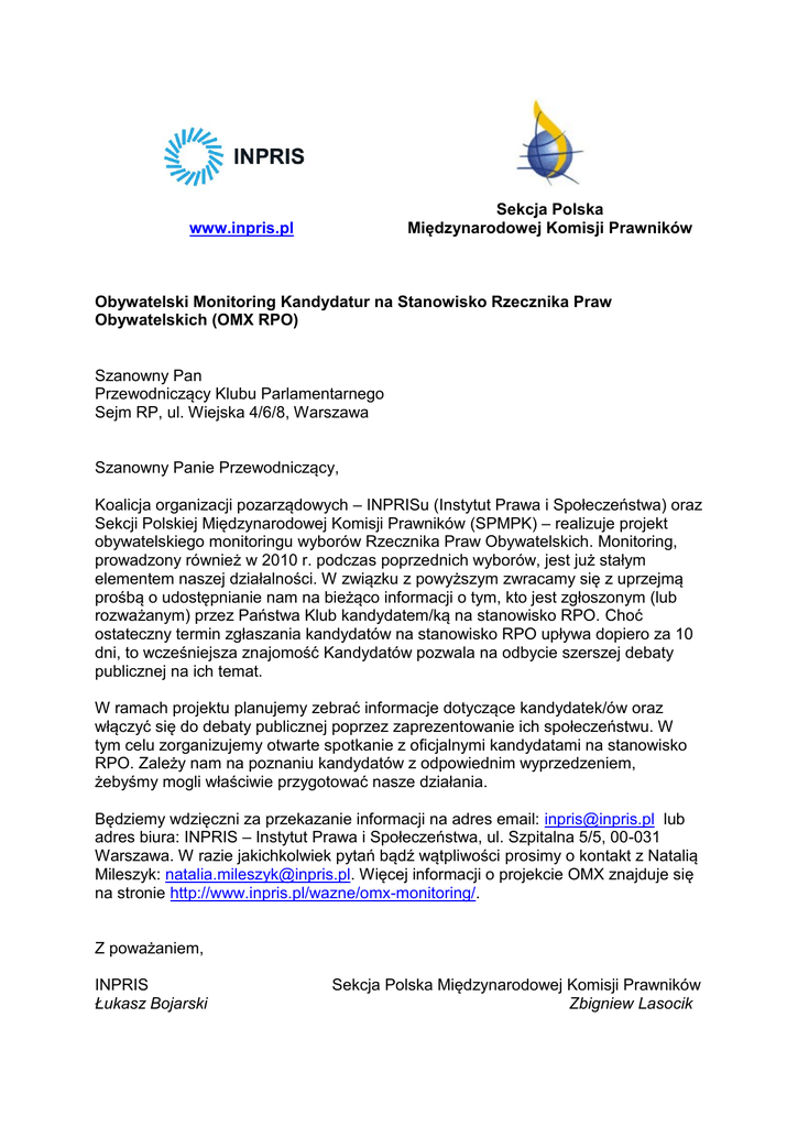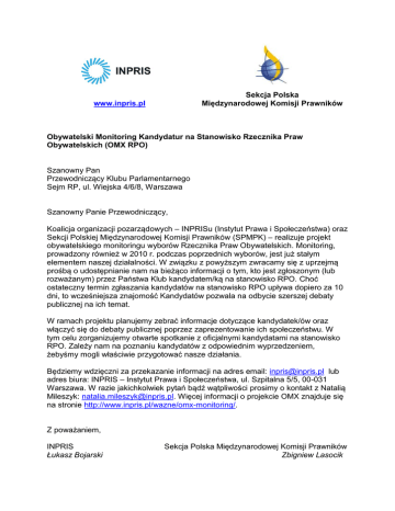 Sekcja Polska Międzynarodowej Komisji Prawników www.inpris.pl Obywatelski Monitoring Kandydatur na Stanowisko Rzecznika Praw Obywatelskich (OMX RPO) Szanowny Pan Przewodniczący Klubu Parlamentarnego Sejm RP, ul. Wiejska 4/6/8, Warszawa Szanowny Panie Przewodniczący, Koalicja organizacji pozarządowych – INPRISu (Instytut Prawa i Społeczeństwa) oraz Sekcji Polskiej Międzynarodowej Komisji Prawników (SPMPK) – realizuje projekt obywatelskiego monitoringu wyborów Rzecznika Praw Obywatelskich. Monitoring, prowadzony również w 2010 r. podczas poprzednich wyborów, jest już stałym elementem naszej działalności. W związku z powyższym zwracamy się z uprzejmą prośbą o udostępnianie nam na bieżąco informacji o tym, kto jest zgłoszonym (lub rozważanym) przez Państwa Klub kandydatem/ką na stanowisko RPO. Choć ostateczny termin zgłaszania kandydatów na stanowisko RPO upływa dopiero za 10 dni, to wcześniejsza znajomość Kandydatów pozwala na odbycie szerszej debaty publicznej na ich temat. W ramach projektu planujemy zebrać informacje dotyczące kandydatek/ów oraz włączyć się do debaty publicznej poprzez zaprezentowanie ich społeczeństwu. W tym celu zorganizujemy otwarte spotkanie z oficjalnymi kandydatami na stanowisko RPO. Zależy nam na poznaniu kandydatów z odpowiednim wyprzedzeniem, żebyśmy mogli właściwie przygotować nasze działania. Będziemy wdzięczni za przekazanie informacji na adres email: [email protected] lub adres biura: INPRIS – Instytut Prawa i Społeczeństwa, ul. Szpitalna 5/5, 00-031 Warszawa. W razie jakichkolwiek pytań bądź wątpliwości prosimy o kontakt z Natalią Mileszyk: [email protected]. Więcej informacji o projekcie OMX znajduje się na stronie http://www.inpris.pl/wazne/omx-monitoring/. Z poważaniem, INPRIS Łukasz Bojarski Sekcja Polska Międzynarodowej Komisji Prawników Zbigniew Lasocik