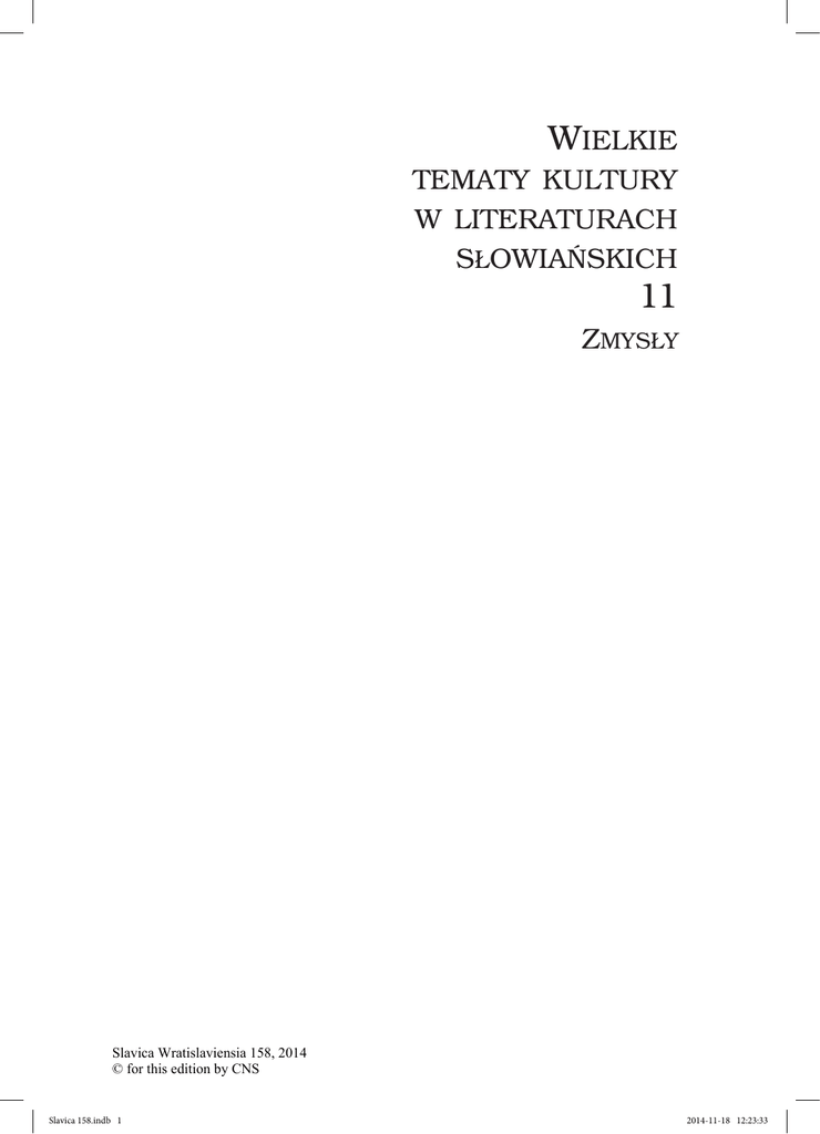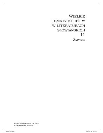 Wielkie tematy kultury w literaturach s£owiaÑskich 11 Zmysły Slavica Wratislaviensia 158, 2014 © for this edition by CNS Slavica 158.indb 1 2014-11-18 12:23:33 Slavica Wratislaviensia 158, 2014 © for this edition by CNS Slavica 158.indb 2 2014-11-18 12:23:35 Pani Tom dedykowany Profesor Krystynie Galon-Kurkowej w siedemdziesiątą rocznicę urodzin Slavica Wratislaviensia 158, 2014 © for this edition by CNS Slavica 158.indb 3 2014-11-18 12:23:35 A cta U niversitatis W ratislaviensis N o 3570 Slavica Wratislaviensia 158, 2014 © for this edition by CNS Slavica 158.indb 4 2014-11-18 12:23:35 Slavica Wratislaviensia CLVIII Wielkie tematy kultury w literaturach słowiańskich 11 Zmysły Redakcja Izabella Malej Elżbieta Tyszkowska-Kasprzak Wrocław 2014 Wydawnictwo Uniwersytetu Wrocławskiego Slavica Wratislaviensia 158, 2014 © for this edition by CNS Slavica 158.indb 5 2014-11-18 12:23:35 Komitet Redakcyjny Oleh Beley, Krystyna Galon-Kurek, Tadeusz Klimowicz, Ewa Komisaruk (redaktor naczelny), Krzysztof Kusal, Izabella Malej, Agnieszka Matusiak, Anna Paszkiewicz, Michał Sarnowski, Milica Semków, Jan Sokołowski, Elżbieta Tyszkowska-Kasprzak (sekretarz redakcji), Janina Wołczuk, Anna Zura Rada Redakcyjna Olga Demidowa (Sankt Petersburg), Agnes Dukkon (Budapeszt), Jana Hoffmanova (Praga), Walery Mokijenko (Sankt Petersburg), Galina Nefagina (Słupsk), Predrag Piper (Belgrad), Bojana Stojanović-Pantović (Nowy Sad), Ireneusz Szarycz (Waterloo), Natalia Teres (Kijów), Harry Walter (Greifswald), Anatolij Zahnitko (Donieck) Adres redakcji „Slavica Wratislaviensia” Instytut Filologii Słowiańskiej Uniwersytetu Wrocławskiego ul. Pocztowa 9 53-313 Wrocław e-mail: [email protected] Lista recenzentów, opis procedury recenzowania oraz wskazówki dla autorów są dostępne na stronie WWW czasopisma: http://swr.wuwr.pl Wersja podstawowa czasopisma: papierowa Ilustracja na okładce: © olly — Fotolia.com © Copyright by Wydawnictwo Uniwersytetu Wrocławskiego Sp. z o.o. Wrocław 2014 ISSN 0239-6661 (AUWr) ISSN 0137-1150 (SW) ISBN 978-83-229-3432-6 Nakład: 210 egz. Publikacja przygotowana w Wydawnictwie Uniwersytetu Wrocławskiego Sp. z o.o. 50-137 Wrocław, pl. Uniwersytecki 15 tel. 71 3752885, e-mail: [email protected] Slavica Wratislaviensia 158, 2014 © for this edition by CNS Slavica 158.indb 6 2014-11-18 12:23:35 Spis treści Curriculum vitae (Krystyna Galon-Kurkowa) . . . . . . . . . . . . . . . . . . . . . . . . . 7 Pani Profesor (Tadeusz Klimowicz) . . . . . . . . . . . . . . . . . . . . . . . . . . . . . . 9 Bibliografia prac Profesor Krystyny Galon-Kurkowej (Izabella Malej, Elżbieta Tyszkowska-Kasprzak) . . . . . . . . . . . . . . . . . . . . . . . . . . . . . . . . . . . . . . . . 13 Jelena Dziuba, Соотношение чувство–мысль в образах исторического прошлого (на материале русской прозы второй половины XVIII века) . . . . . . . . . . . . . . . 21 Aleksandr Smirnow , Сeнсорика пространства в стихотворении Михаила Юрьевича Лермонтова Из Гете […] Горные вершины спят во тьме ночной . . . . . . . . . . 33 Ludmiła Hodanen, Звуковой мир поэмы Михаила Юрьевича Лермонтова Демон . . . . . 41 Diana Oboleńska, Восприятие космоса. Что такое имагинация или алхимический код в Русских ночах Владимира Одоевского . . . . . . . . . . . . . . . . . . . . . . . . 49 Tatjana Kolesniczenko, Реконструкция чувствования в лирике Афанасия Фета . . . . . 59 Bartłomiej Brążkiewicz, Iluzje — złudzenia — omamy. Zniekształcenia percepcyjne w literaturze rosyjskiej XIX wieku na przykładzie małych form prozatorskich . . . . . . . . 69 Irina Bielajewa, Запахи и звуки как знаки любви в романе Ивана Гончарова Обломов . . 83 Marija Łoskutnikowa, Карикатура: объект, его чувственное восприятие и художественное воплощение (на материале романа Ивана Гончарова Обрыв) . . . . . . . 93 Natalia Królikiewicz, Осязание, обоняние и вкус как эмоциональные и эстетические десигнаты в избранных произведениях Льва Толстого . . . . . . . . . . . . . . . . 103 Olga Waganowa, „Глядеть не умеем, понимать не умеем”, или сенситивный код к роману Федора Достоевского Идиот . . . . . . . . . . . . . . . . . . . . . . . . . 113 Nel Bielniak, Różnorodność sensualnego doświadczania świata na przykładzie opowiadań Aleksandra Kuprina . . . . . . . . . . . . . . . . . . . . . . . . . . . . . . . . . . . . 125 Andrzej Dudek, Poetyka zapachów w świecie przedstawionym Dmitrija Mierieżkowskiego . 137 Anna Gostiewa, „Клаустрофобный” комплекс в творчестве Федора Сологуба . . . . . 149 Halina Mazurek, Oczy w poetyckiej wyobraźni Mariny Cwietajewej . . . . . . . . . . . . 161 Wanda Laszczak, Ekstaza miłości. Asceza w teorii i praktyce życiowej Jelizawiety Skobcowej (Matki Marii, 1891–1945) . . . . . . . . . . . . . . . . . . . . . . . . . . . . . 173 Jelena Kabkowa, Olga Stukałowa, Синестезия в пространстве художественного творчества (Александр Скрябин и Владимир Набоков) . . . . . . . . . . . . . . . . 185 Wiktorija Zacharowa, Чувство красоты обыденного в русской литературе и живописи Серебряного века . . . . . . . . . . . . . . . . . . . . 
