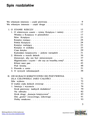 Spis rozdziałów We własnym interesie - część pierwsza We własnym interesie - część druga 9 12 I. O STANIE RZECZY 1. O właściwym czasie - rytmy Księżyca i natury Wiedza o Księżycu w przeszłości Nów Księżyca Księżyc rosnący Pełnia Księżyca Księżyc malejący Księżyc w zodiaku Czas dotyku Kalendarz księżycowy - jedyne narzędzie 2. Historia o trzech dniach Zniszczyć, aby nie być zniszczonym Higienicznie i czysto - ale czy za wszelką cenę? Klient nasz pan Pod kreską 3. Prawda o cenie 4. O żywych informacjach 15 17 17 23 24 24 25 25 29 31 36 37 43 45 48 51 58 II. OD KURACJI KSIĘŻYCOWEJ DO POŻYWIENIA DLA CZŁOWIEKA JAKO CAŁOŚCI Siła wyboru O wadze ciała dzikich zwierząt 1. Intuicja i wyczucie Krok pierwszy: żadnych dodatków! Na odwyku Krok drugi: „kuracja księżycowa" Dni „postu" owocowego, sokowego Próby smakowe 71 72 73 76 79 82 85 91 93 5 http://d-nb.info/1028252498 2. W stronę odżywiania na nowe tysiąclecie Typ alfa i typ omega Dwie strony tego samego medalu Alfa i omega pod jednym dachem Odżywianie przyszłości Dni soli - Byk, Panna, Koziorożec Dni oleju - Bliźnięta, Waga, Wodnik Dni węglowodanów - Rak, Skorpion, Ryby Dni owocowo-bialkowe - Baran, Lew, Strzelec 3. Ponadczasowe tajemnice kuchni - ponadczasowe reguły odżywiania Mądrość z kraju kolorowych potraw Kolory znaków zodiaku Działanie kolorów w rytmie księżycowym Moc ziół Ostrożnie z przedawkowaniem? Trzy tajemnice zielarstwa Właściwy czas na używanie ziół kuchennych Groch z kapustą, czyli różne wskazówki III. CZUĆ SIĘ DOBRZE WE WŁASNEJ SKÓRZE PIELĘGNACJA CIAŁA WE WŁAŚCIWYM CZASIE 1. Czym jest i co potrafi nasza skóra 2. Trzy najważniejsze typy skóry i ich pielęgnacja Rzadki przypadek - skóra normalna Skóra sucha Skóra tłusta 3. Środek pielęgnacyjny nr 1 - o mocy wody 4. Wędrówka przez ciało i znaki zodiaku Baran Peeling Jak sobie radzić z trądzikiem? Dobrodziejstwo dla oczu Operacje plastyczne - korekta twarzy Byk Moc szałwii w dniach Byka Pielęgnacja i trwałość zębów Bliźnięta Dni Bliźniąt - dni masażu 6 95 95 109 110 114 117 117 118 118 121 122 123 126 135 135 136 138 139 159 164 173 173 174 175 177 182 183 184 185 185 186 187 188 188 190 191 Rak 193 Najprostsza droga do ładnego biustu 193 Lew 195 Włosy jak grzywa lwa 195 Panna 198 Gimnastyka spod znaku Panny 198 Pielęgnacja włosów pod znakiem Panny 199 Waga 200 Zapobieganie rozstępom skóry spowodowanym ciążą . . . . 2 0 0 Skorpion 201 Naturalna pielęgnacja miejsc intymnych 201 Błogosławieństwo nasiadówek 204 Hemoroidy 204 Strzelec 205 Środek przeciwko „skórce pomarańczowej" 205 Zioła na „pajączki" 206 Koziorożec 206 Głębokie oczyszczanie skóry 206 Materiał powodujący alergie 207 Przyjaźń ze słońcem 207 Pielęgnacja paznokci 209 Depilacja 210 Wodnik 210 Co jest dobre dla łydek 211 Żylaki 211 Ryby 212 Pielęgnacja stóp i palców u stóp 212 Wrastanie paznokci 212 Usuwanie zrogowaciałej skóry 213 Usuwanie brodawek na stopach 213 Grzybica skóry, grzybica stóp, grzybica paznokci 214 Strzyżenie o niewłaściwej porze? 214 I na dobre zakończenie - masaż receptorów stóp 214 Zdrowe odżywianie, mądra pielęgnacja ciała, prawdziwa uroda .... 217 Indeks 221