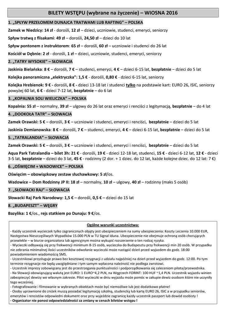 BILETY WSTĘPU (wybrane na życzenie) – WIOSNA 2016 1. „SPŁYW PRZEŁOMEM DUNAJCA TRATWAMI LUB RAFTING” – POLSKA Zamek w Niedzicy: 14 zł - dorośli, 12 zł – dzieci, uczniowie, studenci, emeryci, seniorzy Spływ tratwą z flisakami: 49 zł – dorośli, 24,50 zł – dzieci do 10 lat Spływ pontonem z instruktorem: 65 zł – dorośli, 60 zł – uczniowie i studenci do 26 lat Kościół w Dębnie: 2 zł - dorośli, 1 zł – dzieci, uczniowie, studenci, emeryci, seniorzy 2. „TATRY WYSOKIE” – SŁOWACJA Jaskinia Bielaoska: 8 € – dorośli, 7 € – studenci, emeryci, 4 € – dzieci 6-15 lat, bezpłatnie – dzieci do 5 lat Kolejka panoramiczna „elektryczka”: 1,5 € - dorośli, 0,80 € - dzieci 6-15 lat, seniorzy Kolejka Hrebienok: 9 € - dorośli, 8 € - dzieci 13-18 lat i studenci tylko na podstawie kart: EURO 26, ISIC, seniorzy powyżej 60 lat, 6 € - dzieci 7-12 lat, bezpłatnie – do 6 lat 3. „KOPALNIA SOLI WIELICZKA” – POLSKA Kopalnia: 55 zł – normalny, 39 zł – ulgowy do 26 lat oraz emeryci i renciści z legitymacją, bezpłatnie – do 4 lat 4. „DOOKOŁA TATR” – SŁOWACJA Zamek Orawski: 5 € – dorośli, 3 € – uczniowie i studenci, emeryci i renciści, bezpłatnie – dzieci do 5 lat Jaskinia Demianowska: 8 € – dorośli, 7 € – studenci, emeryci, 4 € – dzieci 6-15 lat, bezpłatnie – dzieci do 5 lat 5. „TATRALANDIA” – SŁOWACJA Zamek Orawski: 5 € – dorośli, 3 € – uczniowie i studenci, emeryci i renciści, bezpłatnie – dzieci do 5 lat Aqua Park Tatralandia – bilet 3h: 21 € - dorośli, 19 € - dzieci 12-18 lat, studenci, 15 € - dzieci 6-12 lat, 12 € - dzieci 3-5 lat, bezpłatnie – dzieci do 3 lat, 45 € - rodzinny (2 dor. + 1 dziec. do 12 lat, każde kolejne dziec. do 12 lat: 7 €) 6. „OŚWIĘCIM + WADOWICE” – POLSKA Oświęcim – obowiązkowy zestaw słuchawkowy: 5 zł/os. Wadowice – Dom Rodzinny JP II: 18 zł – normalny, 10 zł – ulgowy, 40 zł – rodzinny (maks 5 osób) 7. „SŁOWACKI RAJ” – SŁOWACJA Słowacki Raj Park Narodowy: 1,5 € – dorośli, 0,5 € – dzieci do 15 lat 8. „BUDAPESZT” – WĘGRY Bazylika: 1 €/os., rejs statkiem po Dunaju: 9 €/os. Ogólne warunki uczestnictwa: - Każdy uczestnik wycieczek tylko zagranicznych objęty jest ubezpieczeniem na sumy ubezpieczenia: Koszty Leczenia 10.000 EUR, Następstwa Nieszczęśliwych Wypadków 15.000 PLN w TU Signal Iduna. Ubezpieczenie nie obejmuje ochroną osób chorujących przewlekle – w biurze organizatora lub agencyjnym można wykupid rozszerzenie o ten rodzaj ryzyka. - Wycieczki odbywają się przy frekwencji minimum 8-15 osób, wycieczka do Budapesztu przy frekwencji min 20 osób. W przypadku nie zebrania minimalnej ilości uczestników odwołanie wycieczki może nastąpid dzieo przed wyjazdem do godz. 18:00 powiadomieniem wiadomością SMS. - Uczestnikowi przysługuje prawo bez kosztowej rezygnacji z udziału najpóźniej na dzieo przed wyjazdem do godz. 12:00. Po tym terminie rezygnacje nie będą uwzględniane i tym samym wpłacona należnośd nie podlega zwrotowi. - Uczestnik imprezy zobowiązany jest do przestrzegania punktualności i podporządkowania się zaleceniom pilota/przewodnika. - Na Słowacji obowiązującą walutą jest EURO: 1 EURO~4,2 PLN, na Węgrzech FORINT: 100 HUF ~1,4 PLN. Uczestnik wyjazdu winien zabezpieczyd dewizy we własnym zakresie. Pilot wycieczki w dniu wyjazdu może pomóc w zakupie dewiz osobom które nie uczyniły tego wcześniej. - Fotografowanie i filmowanie w wybranych obiektach może byd niemożliwe lub jest dodatkowo płatne! - Osoby uprawnione do zniżek muszą posiadad legitymację szkolną, studencką lub kartę EURO 26, ISIC a w przypadku seniorów, emerytów i rencistów odpowiedni dokument oraz przy wyjeździe zagranicę każdy uczestnik paszport lub dowód osobisty ! - Organizator nie ponosi odpowiedzialności za zmiany w cenach biletów wstępu !