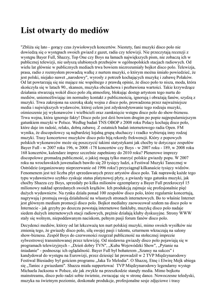 List otwarty do mediów "Zbliża się lato - gorący czas żywiołowych koncertów. Niestety, fani muzyki disco polo nie dowiedzą się o występach swoich gwiazd z gazet, radia czy telewizji. Nie przeczytają recenzji z występu Bayer Full, Shazzy, Top One czy Boys na łamach największych pism, nie zobaczą ich w publicznej telewizji, nie usłyszą ulubionych przebojów w ogólnopolskich stacjach radiowych. Od wielu lat głównie w publicznych mediach trwa bowiem niezrozumiały bojkot disco polo. Telewizja, prasa, radio z rozmysłem prowadzą walkę z nurtem muzyki, o którym można śmiało powiedzieć, że jest polski, niejako nawet „narodowy", wyrosły z potrzeb kochających muzykę i zabawę Polaków. Od lat powtarzają się nie mające nic wspólnego z prawdą opinie, że disco polo to nisza, moda, która skończyła się w latach 90., skansen, muzyka obciachowa i pozbawiona wartości. Takie krzywdzące działania stwarzają wokół disco polo złą atmosferę, blokując dostęp artystom tego nurtu do mediów, uniemożliwiając im normalny kontakt z publicznością, ignorują i obrażają fanów, szydzą z muzyki. Trwa zakrojona na szeroką skalę wojna z disco polo, prowadzona przez najważniejsze media i największych wydawców, której celem jest zdyskredytowanie tego rodzaju muzyki, ośmieszenie jej wykonawców i wielbicieli oraz zamknięcie wstępu disco polo do show-biznesu. Trwa wojna, która ignoruje fakty! Disco polo jest dziś bowiem drugim po popie najpopularniejszym gatunkiem muzyki w Polsce. Według badań TNS OBOP z 2008 roku Polacy kochają disco polo, które daje im radość, relaks, dobrą zabawę. Z ostatnich badań internetowego radia Open. FM wynika, że discopolowcy są najbardziej lojalną grupą słuchaczy i rzadko wybierają inny rodzaj muzyki. Trasy koncertowe muzyków disco polo biją rekordy frekwencji. Który z popowych polskich wykonawców może się poszczycić takimi statystykami jak choćby te dotyczące zespołów Bayer Full - w 2007 roku 196, w 2008 -178 koncertów czy Boys - w 2007 roku - 189, w 2008 roku 168 koncertów, kalendarz imprez szczelnie zapełniony do 2010 roku? Plenerowe imprezy discopolowe gromadzą publiczność, o jakiej mogą tylko marzyć polskie gwiazdy popu. W 2007 roku na wrocławskich juwenaliach bawiło się 20 tysięcy ludzi, a Festiwal Muzyki Tanecznej w Ostródzie (organizowany nieprzerwanie od 1996 roku!) przyciągnął kilkanaście tysięcy widzów. Fenomenem jest też liczba płyt sprzedawanych przez artystów disco polo. Tak naprawdę każde tego typu wydawnictwo szybko zyskuje status platynowej płyty, a gwiazdy tego gatunku muzyki, jak choćby Shazza czy Boys, sprzedały po kilka milionów egzemplarzy a Bayer Full przekroczył 15 milionowy nakład sprzedanych swoich krążków. Ich produkcją zajmuje się profesjonalnie pięć dużych wydawnictw. Na rynku działa ponad 100 zespołów disco polo, które regularnie koncertują, nagrywają i promują swoją działalność na własnych stronach internetowych. Bo to właśnie Internet jest głównym medium promocji disco polo. Bojkot medialny zaowocował szałem na disco polo w Internecie - jak grzyby po deszczu powstają internetowe fankluby, muzykę disco polo nadaje siedem dużych internetowych stacji radiowych, prężnie działają kluby dyskusyjne. Strony WWW stały się wolnym, niepoddawanym naciskom, pełnym pasji forum fanów disco polo. Decydenci mediów, którzy od lat lekceważą ten nurt polskiej muzyki, mimo swoich wysiłków nie zmienią tego, że gwiazdy disco polo, siłą swojej pasji i talentu, szturmem wkraczają na salony show-biznesu. Zespół Boys do czerwoności rozgrzał publiczność na stołecznej imprezie sylwestrowej transmitowanej przez telewizję. Od niedawna gwiazdy disco polo pojawiają się w programach telewizyjnych - „Dzień dobry TVN", „Kuba Wojewódzki Show", „Pytanie na śniadanie" - podnosząc ich oglądalność. Bayer Full był bohaterem „Szansy na sukces" i kandydował do występu na Eurowizji, przez dziesięć lat prowadził w 2 TVP Międzynarodowy Festiwal Biesiadny był gościem programu „Jaka To Melodia". O Shazzę, Etnę i Elwirę Mejk ubiega się „Taniec z gwiazdami". Shazza miała supportować TVP Międzynarodowy legendarny występ Michaela Jacksona w Polsce, ale jak zwykle na przeszkodzie stanęły media. Mimo bojkotu mainstreamu, disco polo radzi sobie świetnie, zwracając się w stronę dance. Nowoczesne teledyski, muzyka na świetnym poziomie, doskonałe produkcje, profesjonalne sesje zdjęciowe i trasy koncertowe - takie jest dzisiejsze oblicze disco polo. Dlaczego wciąż jest torpedowane przez decydentów tworzących polską scenę muzyczną? Dlaczego odmawia się mu prawa funkcjonowania w głównym nurcie muzyki? Dlaczego od lat jest spychane na margines show-biznesu? Disco polo to potężna siła, a fanom tej muzyki należy się nie tylko szacunek mediów, ale też pełen dostęp do informacji. Drugi w Polsce pod względem popularności nurt muzyki wreszcie musi wyjść z cienia i zyskać odpowiednią oprawę medialną. O gustach się nie dyskutuje, ale nie sposób lekceważyć faktów, które mówią same za siebie! Disco polo słucha 30 procent Polaków i państwowe media muszą wreszcie to zauważyć! Oby za rok kolejne letnie festiwale disco polo były już transmitowane przez TVP i rzetelnie opisywane przez prasę. Tym głosem chcemy rozpocząć dyskusję, która, mamy nadzieję, pozwoli uzdrowić sytuację na rynku i da zielone światło twórcom oraz wielbicielom disco polo. Chcemy przebić mur obojętności mediów, zapraszając do rozmowy o polskim show-biznesie jego twórców i dziennikarzy. Do dyskusji zapraszamy też fanów, którzy na dziesiątkach stron internetowych od dawna apelują o „normalność", a milionami wejść na WWW dobitnie pokazują, że disco polo ma potencjał i siłę. Spierajmy się, wojujmy na argumenty, ale za drzwiami zostawmy złe słowa, których tyle padło pod