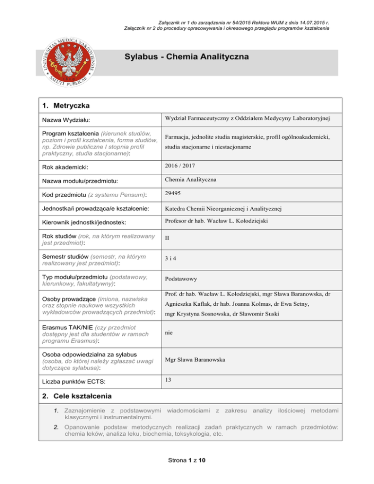 Załącznik nr 1 do zarządzenia nr 54/2015 Rektora WUM z dnia 14.07.2015 r. Załącznik nr 2 do procedury opracowywania i okresowego przeglądu programów kształcenia Sylabus - Chemia Analityczna 1. Metryczka Nazwa Wydziału: Program kształcenia (kierunek studiów, poziom i profil kształcenia, forma studiów, np. Zdrowie publiczne I stopnia profil praktyczny, studia stacjonarne): Wydział Farmaceutyczny z Oddziałem Medycyny Laboratoryjnej Farmacja, jednolite studia magisterskie, profil ogólnoakademicki, studia stacjonarne i niestacjonarne Rok akademicki: 2016 / 2017 Nazwa modułu/przedmiotu: Chemia Analityczna Kod przedmiotu (z systemu Pensum): 29495 Jednostka/i prowadząca/e kształcenie: Katedra Chemii Nieorganicznej i Analitycznej Kierownik jednostki/jednostek: Profesor dr hab. Wacław L. Kołodziejski Rok studiów (rok, na którym realizowany jest przedmiot): II Semestr studiów (semestr, na którym realizowany jest przedmiot): 3i4 Typ modułu/przedmiotu (podstawowy, kierunkowy, fakultatywny): Podstawowy Osoby prowadzące (imiona, nazwiska oraz stopnie naukowe wszystkich wykładowców prowadzących przedmiot): Prof. dr hab. Wacław L. Kołodziejski, mgr Sława Baranowska, dr Agnieszka Kaflak, dr hab. Joanna Kolmas, dr Ewa Setny, mgr Krystyna Sosnowska, dr Sławomir Suski Erasmus TAK/NIE (czy przedmiot dostępny jest dla studentów w ramach programu Erasmus): nie Osoba odpowiedzialna za sylabus (osoba, do której należy zgłaszać uwagi dotyczące sylabusa): Mgr Sława Baranowska Liczba punktów ECTS: 13 2. Cele kształcenia 1. Zaznajomienie z podstawowymi wiadomościami z zakresu analizy ilościowej metodami klasycznymi i instrumentalnymi. 2. Opanowanie podstaw metodycznych realizacji zadań praktycznych w ramach przedmiotów: chemia leków, analiza leku, biochemia, toksykologia, etc. Strona 1 z 10 Załącznik nr 1 do zarządzenia nr 54/2015 Rektora WUM z dnia 14.07.2015 r. Załącznik nr 2 do procedury opracowywania i okresowego przeglądu programów kształcenia 3. Nabycie umiejętności: - wyboru metody analitycznej - pobrania i przygotowania próbki do badań - przygotowania roztworów o żądanym stężeniu, podstawowych i mianowanych - wykonywania analiz ilościowych związków nieorganicznych i organicznych metodami klasycznymi oraz instrumentalnymi (chromatograficznymi, spektroskopowymi oraz elektrochemicznymi) - obliczania wyników analizy z wykorzystaniem metod matematycznych i graficznych - oceny statystycznej wyników analizy i stosowanej metody analitycznej - zastosowania podstawy walidacji metod analitycznych Strona 2 z 10 Załącznik nr 1 do zarządzenia nr 54/2015 Rektora WUM z dnia 14.07.2015 r. Załącznik nr 2 do procedury opracowywania i okresowego przeglądu programów kształcenia 3. Wymagania wstępne 1. Znajomość metod matematycznych ze szczególnym uwzględnieniem metod statystycznych 2. Znajomość podstaw fizyki na poziomie liceum 3. Znajomość podstaw chemii ogólnej i nieorganicznej, chemii analitycznej jakościowej oraz podstaw pracy laboratoryjnej 4. Przedmiotowe efekty kształcenia Lista efektów kształcenia Symbol przedmiotowego efektu kształcenia Treść przedmiotowego efektu kształcenia Odniesienie do efektu kierunkowego (numer) Symbol tworzony przez osobę wypełniającą sylabus (kategoria: W-wiedza, U-umiejętności, K-kompetencje oraz numer efektu) Efekty kształcenia określają co student powinien wiedzieć, rozumieć i być zdolny wykonać po zakończeniu zajęć. Efekty kształcenia wynikają z celów danego przedmiotu. Osiągniecie każdego z efektów powinno być zweryfikowane, aby student uzyskał zaliczenie. Numer kierunkowego efektu kształcenia zawarty w Rozporządzeniu Ministra Nauki bądź Uchwały Senatu WUM właściwego kierunku studiów. W1 - zna rodzaje i właściwości roztworów w chemii analitycznej w zakresie analizy ilościowej BW7 W2 - definiuje i objaśnia procesy utleniania i redukcji w chemii analitycznej w zakresie analizy ilościowej BW8 W3 - zna charakterystykę metali i niemetali oraz nomenklaturę i właściwości związków nieorganicznych i kompleksowych w chemii analitycznej w zakresie analizy ilościowej BW9 W4 - zna i opisuje klasyczne metody analizy ilościowej: analizę wagową, analizę objętościową (alkacymetria, redoksymetria, argentometria, kompleksonometria i analiza gazowa) BW12 W5 - zna klasyfikację instrumentalnych technik analitycznych, objaśnia podstawy teoretyczne i metodyczne technik spektroskopowych, elektrochemicznych i chromatograficznych w zakresie chemii analitycznej ilościowej oraz tłumaczy zasady funkcjonowania aparatów stosowanych w tych technikach na potrzeby chemii analitycznej BW13 W6 - zna kryteria wyboru metody analitycznej (klasycznej i instrumentalnej) oraz zasady walidacji metody analitycznej BW14 W7 - zna podstawy elektrochemii: potencjometrii, polarografii i konduktometri BW16 W8 - zna znaczenie korelacji i regresji w zakresie analizy ilościowej BW25 Strona 3 z 10 Załącznik nr 1 do zarządzenia nr 54/2015 Rektora WUM z dnia 14.07.2015 r. Załącznik nr 2 do procedury opracowywania i okresowego przeglądu programów kształcenia W9 - zna podstawy technik informatycznych oraz zasady pracy z edytorami tekstu, arkuszami kalkulacyjnymi i programami graficznymi na potrzeby chemii analitycznej U1 - dobiera metodę analityczną do rozwiązania konkretnego zadania analitycznego oraz przeprowadza jej walidację BU7 U2 - wykonuje analizy ilościowe pierwiastków oraz nieorganicznych związków chemicznych metodami klasycznymi i instrumentalnymi oraz ocenia wiarygodność wyniku analizy w oparciu o metody statystyczne BU8 U3 - wykorzystuje metody matematyczne w opracowaniu i interpretacji wyników analiz i pomiarów BU13 U4 - stosuje metody statystyczne do opracowania danych z badań, ocenia rozkład zmiennych losowych, wyznacza średnią, medianę, przedział ufności, wariancję i odchylenie standardowe, formułuje i testuje hipotezy statystyczne oraz dobiera i stos