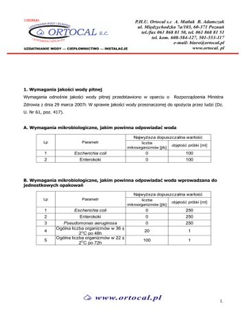 CENTRUM A WODY I ŚCIEKÓ NIANI W DAT Z U I SY STEMÓ H W CIEPLNYC UZDATNIANIE WODY — CIEPŁOWNICTWO — INSTALACJE P.H.U. Ortocal s.c A. Matlak B. Adamczak ul. Międzychodzka 7a/103, 60-371 Poznań tel./fax 061 868 81 50, tel. 061 868 81 51 tel. kom. 608-584-127, 501-553-117 e-mail: [email protected] www.ortocal. pl 1. Wymagania jakości wody pitnej Wymagania odnośnie jakości wody pitnej przedstawiono w oparciu o Rozporządzenia Ministra Zdrowia z dnia 29 marca 2007r. W sprawie jakości wody przeznaczonej do spoŜycia przez ludzi (Dz. U. Nr 61, poz. 417). A. Wymagania mikrobiologiczne, jakim powinna odpowiadać woda NajwyŜsza dopuszczalna wartość Lp Parametr liczba mikroorganizmów [jtk] objętość próbki [ml] 1 2 Escherichia coli Enterokoki 0 0 100 100 B. Wymagania mikrobiologiczne, jakim powinna odpowiadać woda wprowadzana do jednostkowych opakowań NajwyŜsza dopuszczalna wartość Lp Parametr liczba mikroorganizmów [jtk] objętość próbki [ml] 1 Escherichia coli 0 250 2 Enterokoki 0 250 3 Pseudomonas aeruginosa Ogólna liczba organizmów w 36 ± 2OC po 48h Ogólna liczba organizmów w 22 ± 2OC po 72h 0 250 20 1 100 1 4 5 1. C. Wymagania mikrobiologiczne, jakim powinna odpowiadać woda w cysternach, zbiornikach magazynujących wodę w środkach transportu lądowego, powietrznego lub wodnego NajwyŜsza dopuszczalna wartość Lp Parametr liczba mikroorganizmów [jtk] objętość próbki [ml] 1 Escherichia coli 0 100 2 Enterokoki 0 100 3 Pseudomonas aeruginosa Ogólna liczba organizmów w 36 ± 2OC po 48h 0 100 100 1 4 D. Wymagania mikrobiologiczne, jakim powinna odpowiadać ciepła woda Lp Parametr liczba mikroorganizmów [jtk] objętość próbki [ml] 1 Legionella sp. 1) <100 100 Objaśnienia: 1) NaleŜy badać w ciepłej wodzie w budynkach zamieszkania zbiorowego i zakładach opieki zdrowotnej zamkniętej (od dnia 1 stycznia 2008 r.). Uwaga: W zakładach opieki zdrowotnej zamkniętej na oddziałach, w których przebywają pacjenci o obniŜonej odporności, w tym objęci leczeniem immunosupresyjnym, pałeczki Legionella sp. powinny być nieobecne w próbce wody o objętości 1.000 ml. 2. PODSTAWOWE WYMAGANIA CHEMICZNE, JAKIM POWINNA ODPOWIADAĆ WODA 1 2 3 4 5 6 7 8 9 9a 10 11 12 13 14 15 16 17 18 19 19a 20 21 22 23 24 25 26 26a Akryloamid Antymon Arsen Azotany Azotyny Benzen Benzo(a)piren Bor Bromiany Bromiany Chlorek winylu Chrom Cyjanki 1,2-dichloroetan Epichlorohydryna Fluorki Kadm Miedź Nikiel Ołów Ołów Pestycydy Σ pestycydów Rtęć Selen Σ trichloroetenu i tetrachloroetenu Σ Wielopierścieniowych węglowodorów aromatycznych Σ THM Σ THM 0,101),2) 0,005 0,01 0,0257a) 0,0107b) 0,108),9) 0,508),10) 0,001 0,01 10,0 µg/l mg/l mg/l mg/l mg/l µg/l µg/l mg/l mg/l mg/l µg/l mg/l mg/l µg/l µg/l mg/l mg/l mg/l mg/l mg/l mg/l µg/l µg/l mg/l mg/l µg/l 0,1011) µg/l 1503a) 1004),5),12) µg/l µg/l 503) 0,503) 1,0 0,010 1,0 0,0253a) 0,0104),5) 0,502),6) 0,05 0,05 3,0 0,101),2) 1,5 0,005 2,07) 0,02 3. Objaśnienia: 1) Oznaczać, gdy wystąpienie parametru w wodzie moŜe wynikać ze stosowanej technologii uzdatniania wody lub materiałów konstrukcyjnych zastosowanych w instalacjach. 2) Wartość odnosi się do stęŜenia pozostałości monomeru w wodzie, obliczonego zgodnie ze specyfikacjami maksymalnego uwalniania z odpowiedniego polimeru w kontakcie z wodą. 3) NaleŜy spełnić warunek: [azotany]/50+[azotyny]/3 <1, gdzie wartości w nawiasach kwadratowych oznaczają stęŜenie azotanów (NO3) i azotynów (NO2) w mg/l, ponadto aby stęŜenie azotynów w wodzie wprowadzanej do sieci wodociągowej lub innych urządzeń dystrybucji nie przekraczało wartości 0,10 mg/l. 3a) 4) Stosuje się do dnia 1 stycznia 2008 r. Stosuje się od dnia 1 stycznia 2008 r. 5) W miarę moŜliwości bez ujemnego wpływu na dezynfekcję, powinno dąŜyć się do osiągnięcia niŜszej wartości. 6) Oznaczać w wodzie przesyłanej instalacjami z polichlorku winylu. 7) Wartość dopuszczalna, jeŜeli nie powoduje zmiany barwy wody spowodowanej agresywnością korozyjną wody dla rur miedzianych. 7a) Stosuje się do dnia 1 stycznia 2013 r. 7b) Stosuje się od dnia 1 stycznia 2013 r. 8) Termin "pestycydy" obejmuje organiczne: insektycydy, herbicydy, fungicydy, nematocydy, akarycydy, algicydy, rodentycydy, slimicydy, a takŜe produkty pochodne (m.in. regulatory wzrostu) oraz ich pochodne metabolity, a takŜe produkty ich rozkładu i reakcji; oznaczać jedynie te pestycydy, których występowania w wodzie moŜna oczekiwać. 9) Wartość stosuje się do kaŜdego poszczególnego pestycydu. W przypadku aldryny, dieldryny, heptachloru i epoksydu heptachloru NDS wynosi 0,030 µg/l. 10) Suma pestycydów oznacza sumę poszczególnych pestycydów wykrytych i oznaczonych ilościowo w ramach monitoringu. 11) Wartość oznacza sumę stęŜeń wyszczególnionych związków: benzeno(b)fluoranten, benzeno(k)fluoranten, benzeno(gih)perylen, indeno(1,2,3,-c,d)piren. 12)Suma THM - wartość oznacza sumę stęŜeń związków: trichlorometan, dichlorobromometan, dibromochlorometan, tribromometan. 4. DODATKOWE WYMAGANIA MIKROBIOLOGICZNE, ORGANOLEPTYCZNE, FIZYKOCHEMICZNE ORAZ RADIOLOGICZNE, JAKIM POWINNA ODPOWIADAĆ WODA A. Wymagania mikrobiologiczne Lp 1 2 3 4 Parametr NajwyŜsza dopuszczalna wartość parametru w próbce wody liczba mikroorganizmów [jtk] objętość próbki [ml] 0 100 50 1 100 1 0 100 Bakterie grupy coli 1) Ogólna liczba organizmów w 36 ± 2O C po 48h Ogólna liczba organizmów w 22 ± 2O C po 72h Clostridium perfringens (łącznie ze sporami)2) B. Wymagania organoleptyczne i fizykochemiczne Lp Parametr Dopuszczalny zakres wartości 3) Jednostka 1 Amonowy jon 0,5 mg/l 2 Barwa mg/l5) 3 Chlorki 154) 2506) 4 Glin 0,2 mg/l 5 Mangan 0,05 mg/l 6 Mętność 1 NT U 7 Ogólny węgiel organiczny mg/l 8 pH 9 Przewodność 5,07) 6,5-9,56) 25006) µS/cm8) 10 Siarczany 2506) mg/l 11 Smak akceptowalny4) - 12 200 mg/l 13 Sód Utlenialność z KMnO 4 mg/l 14 Zapach 59),10) akceptowalny4) mg/l - - 5. C. W