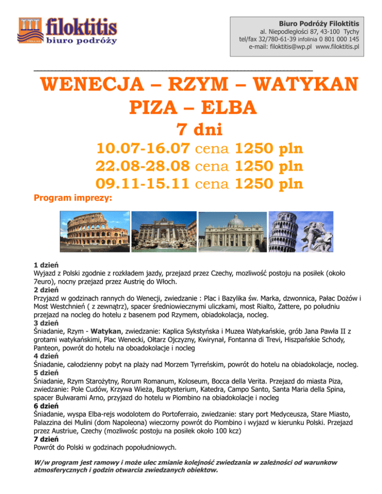 Biuro Podróży Filoktitis al. Niepodległości 87, 43-100 Tychy tel/fax 32/780-61-39 infolinia 0 801 000 145 e-mail: [email protected] www.filoktitis.pl ______________________________________________________________________________ WENECJA – RZYM – WATYKAN PIZA – ELBA 7 dni 10.07-16.07 cena 1250 pln 22.08-28.08 cena 1250 pln 09.11-15.11 cena 1250 pln Program imprezy: 1 dzień Wyjazd z Polski zgodnie z rozkładem jazdy, przejazd przez Czechy, mozliwość postoju na posiłek (około 7euro), nocny przejazd przez Austrię do Włoch. 2 dzień Przyjazd w godzinach rannych do Wenecji, zwiedzanie : Plac i Bazylika św. Marka, dzwonnica, Pałac Dożów i Most Westchnień ( z zewnątrz), spacer średniowiecznymi uliczkami, most Rialto, Zattere, po południu przejazd na nocleg do hotelu z basenem pod Rzymem, obiadokolacja, nocleg. 3 dzień Śniadanie, Rzym - Watykan, zwiedzanie: Kaplica Sykstyńska i Muzea Watykańskie, grób Jana Pawła II z grotami watykańskimi, Plac Wenecki, Ołtarz Ojczyzny, Kwirynał, Fontanna di Trevi, Hiszpańskie Schody, Panteon, powrót do hotelu na oboadokolacje i nocleg 4 dzień Śniadanie, całodzienny pobyt na plaży nad Morzem Tyrreńskim, powrót do hotelu na obiadokolacje, nocleg. 5 dzień Śniadanie, Rzym Starożytny, Rorum Romanum, Koloseum, Bocca della Verita. Przejazd do miasta Piza, zwiedzanie: Pole Cudów, Krzywa Wieża, Baptysterium, Katedra, Campo Santo, Santa Maria della Spina, spacer Bulwarami Arno, przyjazd do hotelu w Piombino na obiadokolacje i nocleg 6 dzień Śniadanie, wyspa Elba-rejs wodolotem do Portoferraio, zwiedzanie: stary port Medyceusza, Stare Miasto, Palazzina dei Mulini (dom Napoleona) wieczorny powrót do Piombino i wyjazd w kierunku Polski. Przejazd przez Austriue, Czechy (mozliwośc postoju na posiłek około 100 kcz) 7 dzień Powrót do Polski w godzinach popołudniowych. W/w program jest ramowy i może ulec zmianie kolejność zwiedzania w zależności od warunkσw atmosferycznych i godzin otwarcia zwiedzanych obiektσw. Cena obejmuje: przejazd autokarem (klimatyzacja, toaleta, siedzenia uchylane, cafe barek, video) 4 noclegi we Włoszech, w hotelach, pokoje 2, 3-osobowe z łazienkami 4 śniadania i 4 obiadokolacje obsługę pilota-przewodnika, ubezpieczenie KL+NW+bagaż podatek VAT Uwagi : Wstępy i komunikacja miejska uczestnicy pokrywają we własnym zakresie, na ten cel sugerujemy przeznaczyć ok. 70 EUR. Pilot – przewodnik nie oprowadza po muzeach i wnętrzach zwiedzanych obiektów.