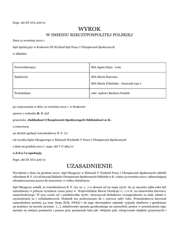 Sygn. akt III AUa 416/12 WYROK W IMIENIU RZECZYPOSPOLITEJ POLSKIEJ Dnia 12 września 2012 r. Sąd Apelacyjny w Krakowie III Wydział Sąd Pracy i Ubezpieczeń Społecznych w składzie: Przewodniczący: SSA Agata Pyjas - Luty Sędziowie: SSA Maria Szaroma SSA Marta Fidzińska - Juszczak (spr.) Protokolant: sekr. sądowy Barbara Dudzik po rozpoznaniu w dniu 12 września 2012 r. w Krakowie sprawy z wniosku B. F. (1) przeciwko Zakładowi Ubezpieczeń Społecznych Oddziałowi w K. o emeryturę na skutek apelacji wnioskodawcy B. F. (1) od wyroku Sądu Okręgowego w Kielcach Wydziału V Pracy i Ubezpieczeń Społecznych z dnia 29 grudnia 2011 r. sygn. akt V U 984/11 o d d a l a apelację. Sygn. akt III AUa 416/12 UZASADNIENIE Wyrokiem z dnia 29 grudnia 2011r. Sąd Okręgowy w Kielcach V Wydział Pracy i Ubezpieczeń Społecznych oddalił odwołanie B. F. (2) od decyzji Zakładu Ubezpieczeń Społecznych Oddziału w K. z dnia 13 września 2011r. odmawiającej ubezpieczonemu prawa do emerytury w wieku obniżonym. Sąd Okręgowy ustalił, że wnioskodawca B. F. (2), ur. (...) w okresie od 22 maja 1972r. do 31 stycznia 1989 roku był zatrudniony w pełnym wymiarze czasu pracy w Wojewódzkim Biurze Geodezji i (...) w K. na stanowisku kierowcy samochodowego. W tym czasie od 1 października 1976r. otrzymywał dodatkowe wynagrodzenie za stały udział w czynnościach za i wyładunkowych. Dodatek ten podwyższano do 1 czerwca 1987 roku. Wnioskodawca kierował samochodem poniżej 3,5 tony (typu ŻUK, NYSA) i do jego obowiązków należały wyjazdy służbowe z geodetami na pomiary na terenie powiatu (...), załadowanie sprzętu geodezyjnego na samochód, pomoc w przeniesieniu tego sprzętu na miejsce pomiarów i pomoc przy pomiarach taka jak: wbijanie pali, wkopywanie słupków granicznych i betonowych graniczników, pomoc przy przenoszeniu sprzętu na inne stanowiska pomiarów, i powrót samochodem do bazy. Codziennie wyjeżdżał w teren z inną grupą geodetów, którym pomagał w noszeniu ciężkiego sprzętu, którego mieli do pomiarów bardzo dużo. Wyjazd w teren odbywał się ok. godz. 7.10, a droga do najdalej oddalonego miejsca trwała ok. 40 minut. Praca w terenie trwała nawet do 10 godzin, a w sezonie letnim nawet 12 godzin, była to praca na akord. Zimą praca trwała od 5-6 godzin w terenie, a w czasie dużych mrozów nie wykonywano takich wyjazdów. W przedsiębiorstwie było kilkunastu geodetów, toteż oprócz wnioskodawcy jeździł z nimi także drugi kierowca. Zdarzało się, że w terenie wnioskodawca i po 8 godzin wykonywał pracę pomocnika geodety. W dniu 2 sierpnia 2011r. ubezpieczony złożył wniosek o emeryturę. Ogólny staż wnioskodawcy wynosi 32 lata, 5 miesięcy i 7 dni. Staż pracy w warunkach szczególnych udowodniony na dzień 1 stycznia 1999 roku wynosi 11 lat, 9 miesięcy i 12 dni. Powyższy stan faktyczny Sąd pierwszej instancji ustalił na podstawie akt emerytalnych ZUS, akt osobowych z okresu zatrudnienia w Wojewódzkim Biurze Geodezji i (...) w K., zeznań świadków, wyjaśnień wnioskodawcy i zważył, że odwołanie B. F. (2) nie jest zasadne. Powołując się na treść art. 184 ust. 1 w związku z art. 32 ustawy z dnia 17 grudnia 1998 r. o emeryturach i rentach z Funduszu Ubezpieczeń Społecznych ( Dz. U. z 2009 r. Nr 153, poz. 1227 ze zm.) stwierdził Sąd, że spór w niniejszej sprawie sprowadzał się do rozstrzygnięcia czy zatrudnienie ubezpieczonego od 1 października 1976r. do 15 października 1987r. stanowiło świadczenie pracy w warunkach szczególnych. Sąd dał wiarę zeznaniom świadków A. D., S. K., M. S. oaz L. W., z których wynika, że istota pracy wnioskodawcy polegała na przewozie geodetów i ich sprzętu pomiarowego na miejsce. Tam wyładowywał sprzęt w tym słupki betonowe ważące około 20 kg., do niego należało też ich czyszczenie, wkopywanie, znoszenie i załadowywanie po skończonej pracy do samochodu. Powyższe czynności były pomocnicze przy pomiarach geodezyjnych, przy czym sam załadunek i wyładunek nie był pracą stałą i w pełnym wymiarze czasu pracy, bowiem wykonywał on szereg czynności zgodnych ze stanowiskiem kierowcy jakie zajmował. Wskazana specyfika pracy wnioskodawcy zdaniem Sądu pierwszej instancji - nie pozwala na zakwalifikowanie jej do prac w szczególnych warunkach opisanych w wykazie A stanowiącym załącznik do rozporządzenia Rady Ministrów z dnia 7 lutego 1983r. w sprawie wieku emerytalnego pracowników zatrudnionych w szczególnych warunkach lub szczególnym charakterze (Dz. U. z 1983, nr 8, poz. 43 ze zm.), a obejmującym katalog prac wykonywanych w szczególnych warunkach, które uprawniają do niższego wieku emerytalnego. Jako błędną ocenił Sąd kwalifikację wskazaną przez samego ubezpieczonego, a opartą o dokumenty dotyczące wypłaty dodatku za pracę przy czynnościach za i wyładunkowych, która wskazywała, że jego praca odpowiadała tej wymienionej w wykazie A, dział VII poz. 1 cyt. wyż. rozporządzenia. Podniósł Sąd, że wskazana pozycja rozporządzenia dotyczy stanowisk związanych z ciężkimi pracami załadunkowymi i wyładunkowymi oraz przeładunek materiałów sypkich, pylistych, toksycznych, żrących lub parzących w transporcie, tymczasem obowiązki ubezpieczonego i zakres jego pracy tej kwalifikacji nie odpowiadają. Zdaniem Sądu takie okoliczności jak noszenie sprzętu geodetów ciężarze 20 kg, wkopywanie i wykopywanie słupków nie przesądzają o wykonywaniu pracy w szczególnych warunkach jaka wynika z regulacji cyt. wyż. rozporządzenia. Sąd uznał zatem, że wnioskodawca nie legitymuje się wymaganym 15 – letnim okresem pracy w warunkach szczególnych, a tym samym nie spełnia wszystkich przesłanek do nabycia emerytury przewidzianych w powołanych na wstępie przepisach ustawy. Z tych względów, na podstawie art. 47714 § 1 kpc Sąd Okręgowy orzekł jak w sentencji. Apelację od powyższego wyroku wniósł wnioskodawca reprezentowany przez 