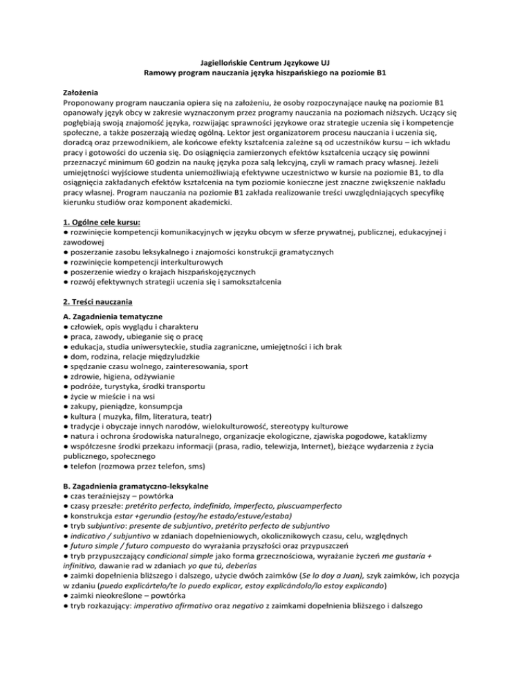 Jagiellońskie Centrum Językowe UJ Ramowy program nauczania języka hiszpańskiego na poziomie B1 Założenia Proponowany program nauczania opiera się na założeniu, że osoby rozpoczynające naukę na poziomie B1 opanowały język obcy w zakresie wyznaczonym przez programy nauczania na poziomach niższych. Uczący się pogłębiają swoją znajomość języka, rozwijając sprawności językowe oraz strategie uczenia się i kompetencje społeczne, a także poszerzają wiedzę ogólną. Lektor jest organizatorem procesu nauczania i uczenia się, doradcą oraz przewodnikiem, ale końcowe efekty kształcenia zależne są od uczestników kursu – ich wkładu pracy i gotowości do uczenia się. Do osiągnięcia zamierzonych efektów kształcenia uczący się powinni przeznaczyć minimum 60 godzin na naukę języka poza salą lekcyjną, czyli w ramach pracy własnej. Jeżeli umiejętności wyjściowe studenta uniemożliwiają efektywne uczestnictwo w kursie na poziomie B1, to dla osiągnięcia zakładanych efektów kształcenia na tym poziomie konieczne jest znaczne zwiększenie nakładu pracy własnej. Program nauczania na poziomie B1 zakłada realizowanie treści uwzględniających specyfikę kierunku studiów oraz komponent akademicki. 1. Ogólne cele kursu: ● rozwinięcie kompetencji komunikacyjnych w języku obcym w sferze prywatnej, publicznej, edukacyjnej i zawodowej ● poszerzanie zasobu leksykalnego i znajomości konstrukcji gramatycznych ● rozwinięcie kompetencji interkulturowych ● poszerzenie wiedzy o krajach hiszpańskojęzycznych ● rozwój efektywnych strategii uczenia się i samokształcenia 2. Treści nauczania A. Zagadnienia tematyczne ● człowiek, opis wyglądu i charakteru ● praca, zawody, ubieganie się o pracę ● edukacja, studia uniwersyteckie, studia zagraniczne, umiejętności i ich brak ● dom, rodzina, relacje międzyludzkie ● spędzanie czasu wolnego, zainteresowania, sport ● zdrowie, higiena, odżywianie ● podróże, turystyka, środki transportu ● życie w mieście i na wsi ● zakupy, pieniądze, konsumpcja ● kultura ( muzyka, film, literatura, teatr) ● tradycje i obyczaje innych narodów, wielokulturowość, stereotypy kulturowe ● natura i ochrona środowiska naturalnego, organizacje ekologiczne, zjawiska pogodowe, kataklizmy ● współczesne środki przekazu informacji (prasa, radio, telewizja, Internet), bieżące wydarzenia z życia publicznego, społecznego ● telefon (rozmowa przez telefon, sms) B. Zagadnienia gramatyczno-leksykalne ● czas teraźniejszy – powtórka ● czasy przeszłe: pretérito perfecto, indefinido, imperfecto, pluscuamperfecto ● konstrukcja estar +gerundio (estoy/he estado/estuve/estaba) ● tryb subjuntivo: presente de subjuntivo, pretérito perfecto de subjuntivo ● indicativo / subjuntivo w zdaniach dopełnieniowych, okolicznikowych czasu, celu, względnych ● futuro simple / futuro compuesto do wyrażania przyszłości oraz przypuszczeń ● tryb przypuszczający condicional simple jako forma grzecznościowa, wyrażanie życzeń me gustaría + infinitivo, dawanie rad w zdaniach yo que tú, deberías ● zaimki dopełnienia bliższego i dalszego, użycie dwóch zaimków (Se lo doy a Juan), szyk zaimków, ich pozycja w zdaniu (puedo explicártelo/te lo puedo explicar, estoy explicándolo/lo estoy explicando) ● zaimki nieokreślone – powtórka ● tryb rozkazujący: imperativo afirmativo oraz negativo z zaimkami dopełnienia bliższego i dalszego ● zdanie warunkowe I typu ● mowa zależna; przekazywanie informacji, pytań (dice, pregunta, dijo, preguntó, etc.) próśb, sugestii (dice, pide) ● strona bierna z ser ● zdania bezosobowe ● konstrukcje peryfrastyczne z infinitivo (empezar a, dejar de, acabar de, volver a) oraz seguir+gerundio / sin, llevar+gerundio / sin ● konstrukcje do wyrażania trwania czynności hace … que, desde hace, desde (również w pytaniach) ● ser/ estar ● słowotwórstwo ● spójniki ● rodzajniki - poszerzenie wiadomości ● przyimki - poszerzenie wiadomości, rekcja czasowników ● wybrane wyrażenia idiomatyczne i przysłowia C. Funkcje językowe ● opisywanie cech osób i miejsc, właściwości przedmiotów i zjawisk, formułowanie definicji, np. Es una persona amable. Está guapa. Es de metal, sirve para..., está en ... ● opowiadanie w czasie teraźniejszym np. opis obyczajów, przeczytanej książki, filmu, np. En Polonia solemos preparar doce platos para la cena de Nochebuena. Sira es costurera y vive con su madre en Madrid. ● przywoływanie wspomnień, relacjonowanie w uporządkowany sposób w czasie przeszłym wydarzeń z uwzględnieniem okoliczności, opowiadanie anegdot, np. ¿A qué tipo de escuela ibas? Estaba en el salón viendo la tele, cuando oí el disparo. Primero… y entonces… ● przedstawianie początku, trwania i końca danej czynności, np. Empecé a jugar al tenis en 2012. Llevo dos años tocando la guitarra. He dejado de fumar. ● mówienie o umiejętnościach i ich braku, np. Soy bastante bueno dibujando, soy capaz de … Los idiomas me resultan fáciles. Me cuesta aprenderlo. ● proszenie o radę, udzielanie rad i wskazówek, np. Usa siempre crema protectora. No lleves mucho dinero. Deberías descansar. Yo en tu lugar esperaría. Te aconsejo que te compres una buena guía. Es importante hacerlo / que lo hagas. ● rozkazywanie, nakazywanie, np. ¡Hazlo!, ¡No te vayas! ● przekazywanie informacji, pytań (dice, pregunta, dijo, preguntó) próśb, sugestii (dice, pide), np. Dice que tiene hambre y pregunta si tienes dinero. Pide que le compres un helado. Dijo que no lo sabía y preguntó cómo nos habíamos enterado. ● przedstawianie opinii na dany temat, argumentowanie, podsumowanie, np. Creo que es interesante, pero no pienso que sea urgente. Está claro que hay muchos problemas y no es verdad que el gobierno no haga nada. En mi opinión... Por un lado... por otro lado... Además, etc. ● stwierdzanie fa