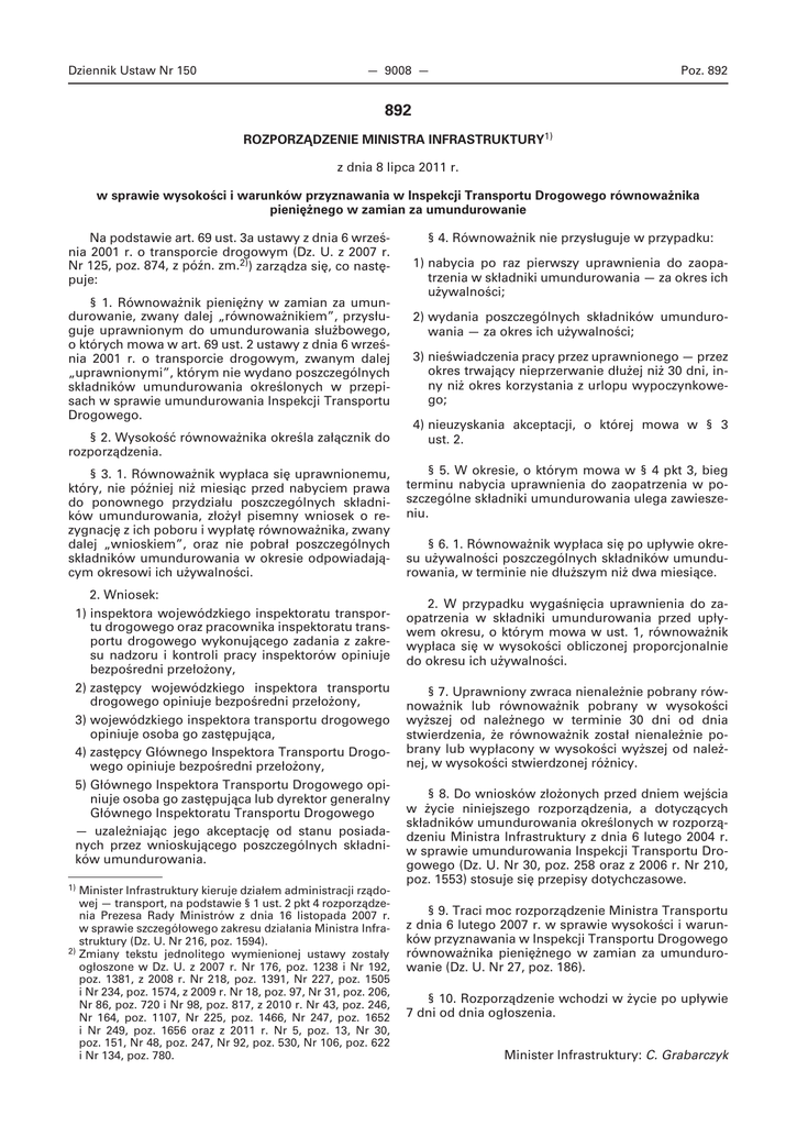 Dziennik Ustaw Nr 150 — 9008 — Poz. 892 892 ROZPORZĄDZENIE MINISTRA INFRASTRUKTURY1) z dnia 8 lipca 2011 r. w sprawie wysokości i warunków przyznawania w Inspekcji Transportu Drogowego równoważnika pieniężnego w zamian za umundurowanie Na podstawie art. 69 ust. 3a ustawy z dnia 6 września 2001 r. o transporcie drogowym (Dz. U. z 2007 r. Nr 125, poz. 874, z późn. zm.2)) zarządza się, co następuje: § 1. Równoważnik pieniężny w zamian za umundurowanie, zwany dalej „równoważnikiem”, przysługuje uprawnionym do umundurowania służbowego, o których mowa w art. 69 ust. 2 ustawy z dnia 6 września 2001 r. o transporcie drogowym, zwanym dalej „uprawnionymi”, którym nie wydano poszczególnych składników umundurowania określonych w przepisach w sprawie umundurowania Inspekcji Transportu Drogowego. § 2. Wysokość równoważnika określa załącznik do rozporządzenia. § 3. 1. Równoważnik wypłaca się uprawnionemu, który, nie później niż miesiąc przed nabyciem prawa do ponownego przydziału poszczególnych składników umundurowania, złożył pisemny wniosek o rezygnację z ich poboru i wypłatę równoważnika, zwany dalej „wnioskiem”, oraz nie pobrał poszczególnych składników umundurowania w okresie odpowiadającym okresowi ich używalności. 2. Wniosek: 1) inspektora wojewódzkiego inspektoratu transportu drogowego oraz pracownika inspektoratu transportu drogowego wykonującego zadania z zakresu nadzoru i kontroli pracy inspektorów opiniuje bezpośredni przełożony, 2) zastępcy wojewódzkiego inspektora transportu drogowego opiniuje bezpośredni przełożony, 3) wojewódzkiego inspektora transportu drogowego opiniuje osoba go zastępująca, 4) zastępcy Głównego Inspektora Transportu Drogowego opiniuje bezpośredni przełożony, 5) Głównego Inspektora Transportu Drogowego opiniuje osoba go zastępująca lub dyrektor generalny Głównego Inspektoratu Transportu Drogowego — uzależniając jego akceptację od stanu posiadanych przez wnioskującego poszczególnych składników umundurowania. 1) Minister Infrastruktury kieruje działem administracji rządowej — transport, na podstawie § 1 ust. 2 pkt 4 rozporządzenia Prezesa Rady Ministrów z dnia 16 listopada 2007 r. w sprawie szczegółowego zakresu działania Ministra Infrastruktury (Dz. U. Nr 216, poz. 1594). 2) Zmiany tekstu jednolitego wymienionej ustawy zostały ogłoszone w Dz. U. z 2007 r. Nr 176, poz. 1238 i Nr 192, poz. 1381, z 2008 r. Nr 218, poz. 1391, Nr 227, poz. 1505 i Nr 234, poz. 1574, z 2009 r. Nr 18, poz. 97, Nr 31, poz. 206, Nr 86, poz. 720 i Nr 98, poz. 817, z 2010 r. Nr 43, poz. 246, Nr 164, poz. 1107, Nr 225, poz. 1466, Nr 247, poz. 1652 i Nr 249, poz. 1656 oraz z 2011 r. Nr 5, poz. 13, Nr 30, poz. 151, Nr 48, poz. 247, Nr 92, poz. 530, Nr 106, poz. 622 i Nr 134, poz. 780. § 4. Równoważnik nie przysługuje w przypadku: 1) nabycia po raz pierwszy uprawnienia do zaopatrzenia w składniki umundurowania — za okres ich używalności; 2) wydania poszczególnych składników umundurowania — za okres ich używalności; 3) nieświadczenia pracy przez uprawnionego — przez okres trwający nieprzerwanie dłużej niż 30 dni, inny niż okres korzystania z urlopu wypoczynkowego; 4) nieuzyskania akceptacji, o której mowa w § 3 ust. 2. § 5. W okresie, o którym mowa w § 4 pkt 3, bieg terminu nabycia uprawnienia do zaopatrzenia w poszczególne składniki umundurowania ulega zawieszeniu. § 6. 1. Równoważnik wypłaca się po upływie okresu używalności poszczególnych składników umundurowania, w terminie nie dłuższym niż dwa miesiące. 2. W przypadku wygaśnięcia uprawnienia do zaopatrzenia w składniki umundurowania przed upływem okresu, o którym mowa w ust. 1, równoważnik wypłaca się w wysokości obliczonej proporcjonalnie do okresu ich używalności. § 7. Uprawniony zwraca nienależnie pobrany równoważnik lub równoważnik pobrany w wysokości wyższej od należnego w terminie 30 dni od dnia stwierdzenia, że równoważnik został nienależnie pobrany lub wypłacony w wysokości wyższej od należnej, w wysokości stwierdzonej różnicy. § 8. Do wniosków złożonych przed dniem wejścia w życie niniejszego rozporządzenia, a dotyczących składników umundurowania określonych w rozporządzeniu Ministra Infrastruktury z dnia 6 lutego 2004 r. w sprawie umundurowania Inspekcji Transportu Drogowego (Dz. U. Nr 30, poz. 258 oraz z 2006 r. Nr 210, poz. 1553) stosuje się przepisy dotychczasowe. § 9. Traci moc rozporządzenie Ministra Transportu z dnia 6 lutego 2007 r. w sprawie wysokości i warunków przyznawania w Inspekcji Transportu Drogowego równoważnika pieniężnego w zamian za umundurowanie (Dz. U. Nr 27, poz. 186). § 10. Rozporządzenie wchodzi w życie po upływie 7 dni od dnia ogłoszenia. Minister Infrastruktury: C. Grabarczyk Dziennik Ustaw Nr 150 — 9009 — Poz. 892 Załącznik do rozporządzenia Ministra Infrastruktury z dnia 8 lipca 2011 r. (poz. 892) WYSOKOŚĆ RÓWNOWAŻNIKA Tabela 1. Wysokość równoważnika przysługująca inspektorowi transportu drogowego — mężczyźnie Lp. Wyszczególnienie Wysokość równoważnika w zł 1 Kurtka 3/4 678,18 2 Marynarka z tropiku 350,48 3 Marynarka gabardynowa 376,64 4 Bluza polowa 175,45 5 Spodnie z tropiku 144,14 6 Spodnie gabardynowe 153,34 7 Spodnie polowe 166,87 8 Sweter 140,71 9 Koszula z długimi rękawami 50,95 10 Koszula z krótkimi rękawami 49,54 11 Kamizelka ostrzegawcza 65,34 12 Półbuty koloru czarnego 199,83 13 Buty polowe 377,92 14 Czapka zimowa z daszkiem 59,14 15 Czapka z daszkiem (typu sportowego) 33,59 16 Czapka gabardynowa 99,93 17 Pas główny 54,46 18 Krawat 19,53 19 Szalik 23,50 20 Pokrowiec w kolorze białym na czapkę 11,07 21 Identyfikator imienny 29,16 22 Rękawice zimowe 64,85 23 Pochewka z dystynkcją na pagon 15,78 24 T-shirt 27,40 25 Skarpety do obuwia polowego 26 Oznaka Inspekcji Transportu Drogowego 5,36 14,02 Dziennik Ustaw Nr 150 — 9010 — Poz