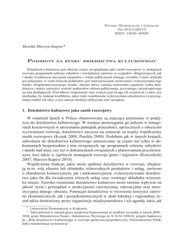 Studia Regionalne i Lokalne Nr 3(41)/2010 ISSN 1509–4995 Monika Murzyn-Kupisz* Podmioty na rynku dziedzictwa kulturowego 1 Dziedzictwo kulturowe jest obecnie często uwzględniane jako zasób rozwojowy w strategiach rozwoju, programach ochrony zabytków i rewitalizacji zarówno ze względów obligatoryjnych, jak i dzięki świadomym decyzjom ekspertów i władz publicznych różnego szczebla. Celem artykułu jest pokazanie, iż wiele różnych podmiotów jest interesariuszami zachowania i wykorzystania tego bardzo sfragmentaryzowanego zasobu. Innymi słowy, istnieją różnorodne segmenty rynku dziedzictwa i należy zauważyć wielość podmiotów sektora publicznego, prywatnego i pozarządowego na nim działających. Prawidłowe rozpoznanie oraz wzięcie pod uwagę ich oczekiwań i celów jest niezbędne, by uniknąć konfliktów, jakie rodzi współczesne wykorzystanie dziedzictwa (a przynajmniej osłabić ich siłę), a tym samym bardziej efektywnie nim zarządzać. 1. Dziedzictwo kulturowe jako zasób rozwojowy W ostatnich latach w Polsce obserwowane są znaczące przemiany w podejściu do dziedzictwa kulturowego. W miejsce postrzegania go jedynie w kategoriach kosztownych w utrzymaniu pamiątek przeszłości, sprzecznych z obecnymi wyzwaniami rozwoju, dziedzictwo zaczyna się uznawać za ważny współczesny zasób rozwojowy (Kozak 2008; Purchla 2009). Podobnie jak w innych krajach, odwołania do dziedzictwa kulturowego umieszczane są często nie tylko w dokumentach bezpośrednio z nim związanych, np. programach ochrony zabytków i opieki nad nimi, czy też w dokumentach związanych z planowaniem przestrzennym, lecz także w ogólnych strategiach rozwoju gmin i regionów (Kościelecki 2007; Murzyn-Kupisz 2010). Współczesne funkcje, jakie może spełniać dziedzictwo w rozwoju, obejmują m.in. rolę rdzenia lub składnika różnorodnych produktów i usług, zarówno o charakterze komercyjnym, jak i niekomercyjnym, wykorzystywanie dziedzictwa jako tła dla świadczenia różnych usług oraz ważnego składnika wizerunku miejsc. Szeroko rozumiane dziedzictwo kulturowe może istotnie wpływać na jakość życia i przesądzać o atrakcyjności turystycznej, rekreacyjnej oraz inwestycyjnej danego obszaru. Potencjał dziedzictwa w tworzeniu korzyści zarówno ekonomicznych, jak i pozaekonomicznych w skali lokalnej i regionalnej został także dostrzeżony przez organizacje międzynarodowe i ich agendy, takie jak * Uniwersytet Ekonomiczny w Krakowie. Tekst powstał w ramach pracy naukowej finansowanej ze środków na naukę w latach 2008– 2010; grant Ministerstwa Nauki i Szkolnictwa Wyższego nr N N114 209634, projekt badawczy pt. „Rola dziedzictwa kulturowego w rozwoju społeczno-gospodarczym. Doświadczenia Polski doby transformacji systemowej”. 1 62 Monika Murzyn-Kupisz Bank Światowy. W programach wspierających rozwój i mających na celu walkę z ubóstwem zauważają one, iż zachowanie i wykorzystanie dziedzictwa kulturowego może mieć znaczący wpływ na poziom zatrudnienia oraz przychody w sektorze działalności związanych z kulturą oraz turystyką. Wskazuje się także na ważne korzyści pozaekonomiczne generowane przez dziedzictwo, takie jak: wpływ na poziom szkolnictwa i zachowanie tożsamości, a przez to oddziaływanie na spójność społeczną, rolę dziedzictwa w przeciwdziałaniu wykluczeniu społecznemu, działaniach na rzecz rozwoju kapitału społecznego oraz stymulowaniu kreatywności (World Bank 2001). Wielowymiarowe oddziaływanie dziedzictwa kulturowego czyni je też możliwą bazą działalności gospodarczej w ramach tzw. ekonomii społecznej. W ostatnim czasie Unia Europejska współfinansowała wiele międzynarodowych programów podejmujących zarówno z praktycznego, jak i teoretycznego punktu widzenia kwestie oddziaływania dziedzictwa kulturowego na rozwój lokalny i regionalny. Na przykład w ramach inicjatywy INTERREG IIIB CADSES realizowane były projekty HERMES – „Heritage and New Media for Sustainable Regional Development” oraz „Heritage Alive!”, a w ramach INTERREG IIIC program CULTURED – „Best Practice in the Presentation and Market Oriented Valorisation of Cultural Heritage as Instrument of Regional Development” (Allaert, Ludtke 2007). W ramach programu Komisji Europejskiej „EuropeAid” zrealizowano projekt ARCADE – „Awareness Raising on Culture and Development in Europe”. Niezwykle ciekawy pod względem naukowym był projekt ESPON 1.3.3 „Impacts of Cultural Heritage and Identity” realizowany w latach 2004–2006 w ramach Europejskiej Sieci Obserwacyjnej Rozwoju Terytorialnego i Spójności Terytorialnej, w którym starano się m.in. w sposób ilościowy przedstawić zasoby dziedzictwa i ich rozmieszczenie w przestrzeni Europy oraz stworzyć wskaźniki podaży dziedzictwa i popytu na dziedzictwo, pokazując zróżnicowanie w tym zakresie pomiędzy różnymi regionami kontynentu (Dynamo Trans-national Group 2006). Dziedzictwo kulturowe jest potencjalnie istotnym, lecz bardzo sfragmentaryzowanym zasobem, zarówno pod względem zawartości pojęcia, jak i wielości podmiotów, które je tworzą, wykorzystują oraz konsumują (Ashworth, Graham, Tunbridge 2000; Graham, Howard 2008). Podejmując decyzje w zakresie projektów związanych z odnową, udostępnieniem oraz interpretacją dziedzictwa kulturowego na potrzeby społeczności lokalnej, usług kulturalnych, turystycznych czy rekreacyjnych oraz formułując zawierające odwołania do dziedzictwa strategie, władze publiczne wszystkich szczebli winny brać pod uwagę wiele uwarunkowań. Po pierwsze, by dobrze określić potencjał zasobu, konieczne jest uwzględnienie rozmaitych wartości, które można uznać za dziedzictwo. Podejście do spuścizny przeszłości ewoluowało znacząco w ciągu ostatnich dwustu lat. Początkowo za istotne uważano jedynie wybrane materialne zabytki kultury narodowej. Stopniowo spektrum wartości uznanych za godne zaintere
