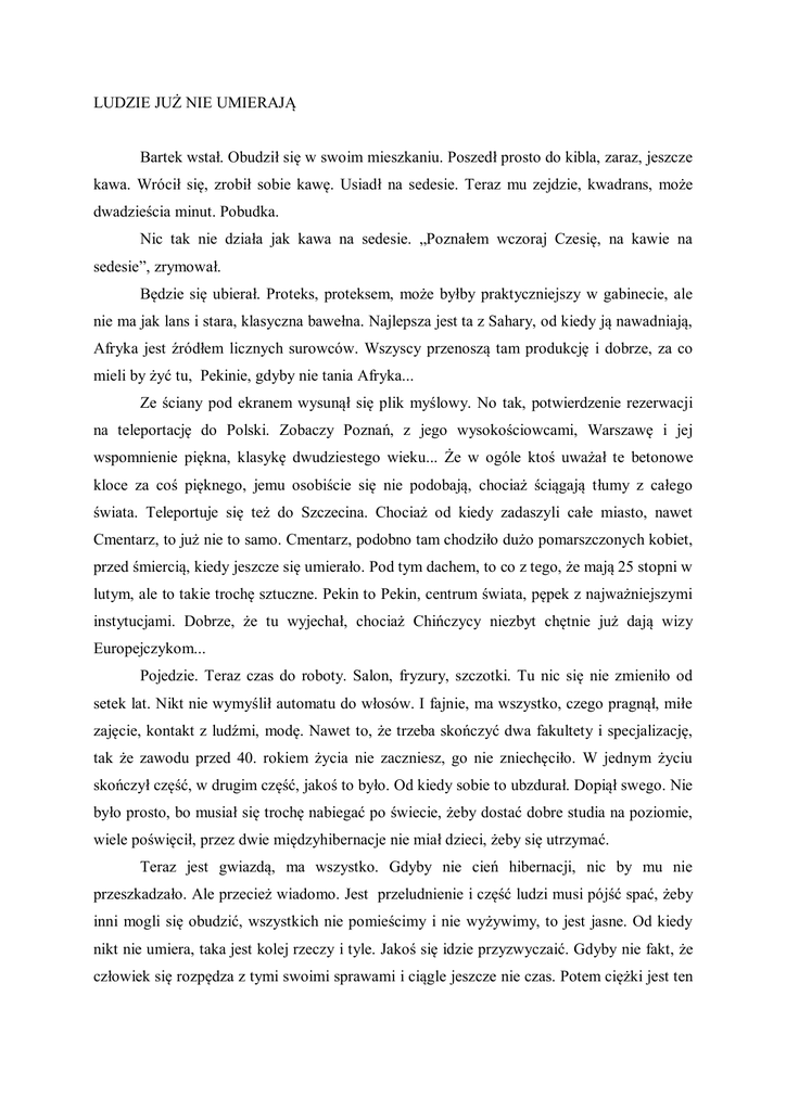 LUDZIE JUŻ NIE UMIERAJĄ Bartek wstał. Obudził się w swoim mieszkaniu. Poszedł prosto do kibla, zaraz, jeszcze kawa. Wrócił się, zrobił sobie kawę. Usiadł na sedesie. Teraz mu zejdzie, kwadrans, może dwadzieścia minut. Pobudka. Nic tak nie działa jak kawa na sedesie. „Poznałem wczoraj Czesię, na kawie na sedesie”, zrymował. Będzie się ubierał. Proteks, proteksem, może byłby praktyczniejszy w gabinecie, ale nie ma jak lans i stara, klasyczna bawełna. Najlepsza jest ta z Sahary, od kiedy ją nawadniają, Afryka jest źródłem licznych surowców. Wszyscy przenoszą tam produkcję i dobrze, za co mieli by żyć tu, Pekinie, gdyby nie tania Afryka... Ze ściany pod ekranem wysunął się plik myślowy. No tak, potwierdzenie rezerwacji na teleportację do Polski. Zobaczy Poznań, z jego wysokościowcami, Warszawę i jej wspomnienie piękna, klasykę dwudziestego wieku... Że w ogóle ktoś uważał te betonowe kloce za coś pięknego, jemu osobiście się nie podobają, chociaż ściągają tłumy z całego świata. Teleportuje się też do Szczecina. Chociaż od kiedy zadaszyli całe miasto, nawet Cmentarz, to już nie to samo. Cmentarz, podobno tam chodziło dużo pomarszczonych kobiet, przed śmiercią, kiedy jeszcze się umierało. Pod tym dachem, to co z tego, że mają 25 stopni w lutym, ale to takie trochę sztuczne. Pekin to Pekin, centrum świata, pępek z najważniejszymi instytucjami. Dobrze, że tu wyjechał, chociaż Chińczycy niezbyt chętnie już dają wizy Europejczykom... Pojedzie. Teraz czas do roboty. Salon, fryzury, szczotki. Tu nic się nie zmieniło od setek lat. Nikt nie wymyślił automatu do włosów. I fajnie, ma wszystko, czego pragnął, miłe zajęcie, kontakt z ludźmi, modę. Nawet to, że trzeba skończyć dwa fakultety i specjalizację, tak że zawodu przed 40. rokiem życia nie zaczniesz, go nie zniechęciło. W jednym życiu skończył część, w drugim część, jakoś to było. Od kiedy sobie to ubzdurał. Dopiął swego. Nie było prosto, bo musiał się trochę nabiegać po świecie, żeby dostać dobre studia na poziomie, wiele poświęcił, przez dwie międzyhibernacje nie miał dzieci, żeby się utrzymać. Teraz jest gwiazdą, ma wszystko. Gdyby nie cień hibernacji, nic by mu nie przeszkadzało. Ale przecież wiadomo. Jest przeludnienie i część ludzi musi pójść spać, żeby inni mogli się obudzić, wszystkich nie pomieścimy i nie wyżywimy, to jest jasne. Od kiedy nikt nie umiera, taka jest kolej rzeczy i tyle. Jakoś się idzie przyzwyczaić. Gdyby nie fakt, że człowiek się rozpędza z tymi swoimi sprawami i ciągle jeszcze nie czas. Potem ciężki jest ten okres asymilacji, kiedy trzeba przyzwyczaić się do nowej rzeczywistości, poznać nowe zasady świata, załapać zmiany, które nastąpiły przez 40 lat snu. Dobrze, że chociaż skończyli już z tymi nagłymi hibernacjami. Teraz człowiek zna termin i jakoś jest się w stanie do tego przygotować. Ale to zawsze tych 60 lat jakoś żal i jest wyścig. Teraz jest właśnie czas na wycieczkę, jeszcze dwa lata i trzy miesiące i znika. Klienci, przypływają cały dzień, suną przez salon, a on stoi, dotyka sprzętu i noże działają, jest nieźle, to jednak to, co lubi robić. Oczywiście pierwsze dwie osoby w poniedziałek to przyjemność, teraz, pod koniec tygodnia, miałby ochotę ich wszystkich pożegnać i zrobić coś pięknego, ale teraz projektując na ekranie grzywkę, którą zaraz przytną, odpływa i zamyśla się. Dobiega termin wyjazdu do Europy. Najlepsze, że będzie miał scecklamp IV. To takie urządzono, na którym będzie mógł spokojnie nadawać swoje myśli do ludzi na całym świecie, tak, że będzie mógł się kontaktować ze wszystkimi w Pekinie bez potrzeby utraty kontaktu. Będzie się czuł jak na jednej z ulic swojego miasta No i fajne jest, że jak pomyśli dwa razy czyjeś imię, to widzi w myślach jego obraz na żywo, a jak pomyśli imię i blok, to ten ktoś nie podsłucha przypadkiem jego myśli. Wszystko się wtedy wyłącza dla tego kontaktu. Zresztą, ma swoją starą, dobrą dwutorowość. Kiedyś myślenie o dwóch rzeczach na raz uznawano nawet za chorobę, określano „gonitwa myśli”, a dziś dzieci się trenuje, żeby mogły mieć wyłączony bieg tylko dla siebie. Jak można żyć, mając jednotorowość. Tak... teraz to się leczy. Ciągle coś uznają za normę, a coś leczą... Już niedługo Europa, ale fajnie. Ile czasu już tam nie był? 20... 26 lat. Tak. Od ostatniej hibernacji minęły 63 lata. Normalnie hibernują po 40, 45 latach w większości krajów, ale wiadomo, tu brakuje inżynierów, tam brakuje specjalistów i tak dobrze wykształcony Bartek mógł spokojnie przenieść się do Zjednoczonej Azji i dostać pracę w Pekinie, nie dość, że znacznie lepiej płatną niż w Europie, to jeszcze 20 lat dłużej. Tyle dodają wykwalifikowanym rzemieślnikom do międzyhibernacji. Warto być fryzjerem. Tak w ogóle warto. Pieniądze, sława, lokalna, ale zawsze, i fajna praca, po prostu. W Poznaniu deszcz. Ciekawe, po co im to. Takie bogate miasto może sobie spokojnie wybrać pogodę... W dole wieżowce, tramwajem dojechał do hotelu. Wybrał go, bo jest blisko seksklubu. Zawsze tak robił na wyjazdach. Delikatne ekri pokoju, poduszki i trochę retro, łazienka osobno, nie wiadomo po co, może trochę usprawiedliwiał to rok budowy tego miejsca. Europa, stara dobra Europa. Restauracje z retrożywnością, drzewa na ulicach, tramwaje w powietrzu, jak za dawnych lat... po prostu pięknie! Ale teraz ogarnie się trochę, weźmie tabletki na rozkład potu i pójdzie sobie pobzykać. Potem się zobaczy. W seksklubie niewiele się zmieniło od jego poprzedniego pobytu. To nie do wiary, jakby czas stanął w miejscu. Schodzi się po schodach, w starej, dziewiętnastowiecznej części miasta. W środku bar, zaraz przy schodach, wszystko w starej gołej cegle. W lewym skrzydle rozłożone kanapy, w