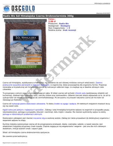 Informacje o produkcie Utworzono 02-03-2017 Radix Bis Sól Himalajska Czarna Drobnoziarnista 300g Cena : 2,99 zł er m ar k Producent : Radix-Bis Dostępność : Dostępny Stan magazynowy : < 0 Średnia ocena : brak recenzji at Czarna sól himalajska, wydobywana w Pakistanie, ma podobnie do soli różowej mnóstwo cennych właściwości. Zawiera praktycznie wszystkie pierwiastki w ilościach śladowych, w organicznej, łatwo przyswajalnej dla organizmu formie. Proporcje minerałów w krystalicznej soli himalajskiej niemal są lustrzanym odbiciem tego, co znajduje się w idealnie zdrowym ciele człowieka. w To przyprawa o ostrym zapachu, przypominającym jajka. W skład czarnej soli wchodzi chlorek sodu (podstawowy składnik soli kuchennej), śladowe ilości siarczanu sodu, siarczku żelaza oraz siarkowodoru. Głównie siarczek żelaza odpowiada za to, że sól ta zyskuje kolor od różowo-brązowego aż do ciemnofioletowego. Po skruszeniu na proszek naturalna czarna sól ma kolor od różowego po fioletowy. Czarna sól wykazuje pewne właściwości zdrowotne. To dobry środek na zgagę i wzdęcia. W niektórych indyjskich miastach leczy się nią nawet wole. Kąpiel solna jest jednym z najlepszych sposobów . Zabieg z solą himalajską korzystnie wpływa na organizm w przypadku grypy, rekonwalescencji, pomaga w przypadku stłuczeń i zwichnięć, bólu mięśni i stawów. Ma również wyśmienity wpływ na skórę, pomaga w różnorodnych problemach skórnych. Doskonałym zabiegiem jest również moczenie nóg w osolonej wodzie. Zabieg ten także prowadzani do detoksykacji organizmu i wspaniale wpływa na stopy. Kuchnia indyjska wykorzystuje czarną sól do przyprawiania przekąsek, dipów, czatnejów, sałatek, a nawet owoców. Jest składnikiem indyjskiej przyprawy chaat masala. Chętnie sięgają po nią wegetarianie i weganie – jest ona dla nich ciekawym dodatkiem, imituje bowiem smak i zapach jajek. Skład: sól himalajska czarna drobnoziarnista spożywcza. Nie zawiera przeciwzbrylaczy. Wygenerowano w programie www.oscGold.com w at er m ar k Waga: 300g