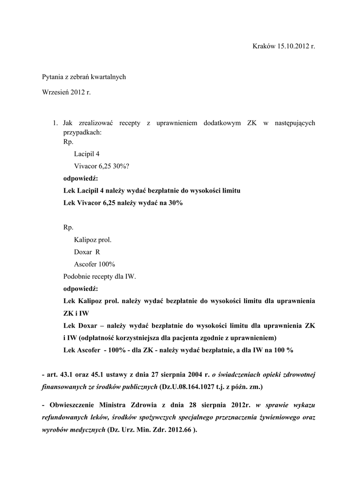 Kraków 15.10.2012 r. Pytania z zebrań kwartalnych Wrzesień 2012 r. 1. Jak zrealizować recepty z uprawnieniem dodatkowym ZK w następujących przypadkach: Rp. Lacipil 4 Vivacor 6,25 30%? odpowiedź: Lek Lacipil 4 należy wydać bezpłatnie do wysokości limitu Lek Vivacor 6,25 należy wydać na 30% Rp. Kalipoz prol. Doxar R Ascofer 100% Podobnie recepty dla IW. odpowiedź: Lek Kalipoz prol. należy wydać bezpłatnie do wysokości limitu dla uprawnienia ZK i IW Lek Doxar – należy wydać bezpłatnie do wysokości limitu dla uprawnienia ZK i IW (odpłatność korzystniejsza dla pacjenta zgodnie z uprawnieniem) Lek Ascofer - 100% - dla ZK - należy wydać bezpłatnie, a dla IW na 100 % - art. 43.1 oraz 45.1 ustawy z dnia 27 sierpnia 2004 r. o świadczeniach opieki zdrowotnej finansowanych ze środków publicznych (Dz.U.08.164.1027 t.j. z późn. zm.) - Obwieszczenie Ministra Zdrowia z dnia 28 sierpnia 2012r. w sprawie wykazu refundowanych leków, środków spożywczych specjalnego przeznaczenia żywieniowego oraz wyrobów medycznych (Dz. Urz. Min. Zdr. 2012.66 ). 2. Wpisano na recepcie Furosemid Polfarmex, czy można wydać Furosemid Polpharmakosztują tyle samo. odpowiedź: Można wydać Furosemid Polpharma – zgodnie z art. 44 ust. 1 ustawy z dnia 12 maja 2011 r. o refundacji leków, środków spożywczych specjalnego przeznaczenia żywieniowego oraz wyrobów medycznych (Dz.U.11.122.696 z późn. zm.). 3. Czy lek robiony może być jednoskładnikowy? Magnesium oxydatum, Maść cholesterolowa. odpowiedź: zgodnie z definicją zawartą w rozdziale1 pkt.12) ustawy z dnia 6 września 2001r. Prawo farmaceutyczne (Dz. U. 2008.45.271tj.) lekiem recepturowym jest produkt leczniczy sporządzony w aptece na podstawie recepty lekarskiej. Przepis nie uściśla z ilu składników ma być on sporządzony. 4. W jakich przypadkach można wydać zamiennik, którego cena jest wyższa od limitu i ceny leku zapisanego przez lekarza? odpowiedź: 1. Osoba wydająca leki, środki spożywcze specjalnego przeznaczenia żywieniowego, wyroby medyczne objęte refundacją ma obowiązek poinformować świadczeniobiorcę o możliwości nabycia leku objętego refundacją, innego niż lek przepisany na recepcie, o tej samej nazwie międzynarodowej, dawce, postaci farmaceutycznej, która nie powoduje powstania różnic terapeutycznych, i o tym samym wskazaniu terapeutycznym, którego cena detaliczna nie przekracza limitu finansowania ze środków publicznych oraz ceny detalicznej leku przepisanego na recepcie. Apteka ma obowiązek zapewnić dostępność tego leku. 2. Osoba wydająca leki, środki spożywcze specjalnego przeznaczenia żywieniowego oraz wyroby medyczne objęte refundacją ma obowiązek, na żądanie świadczeniobiorcy, wydać lek, o którym mowa w ust. 1, którego cena detaliczna jest niższa niż cena leku przepisanego na recepcie. Nie dotyczy to sytuacji, w której osoba uprawniona dokonała odpowiedniej adnotacji na druku recepty, wskazując na niemożność dokonania zamiany przepisanego leku. 3. Przepisy ust. 1 i 2 stosuje się odpowiednio do środków spożywczych specjalnego przeznaczenia żywieniowego oraz wyrobów medycznych. – art. 44 ustawy z dnia 12 maja 2011 r. o refundacji leków, środków spożywczych specjalnego przeznaczenia żywieniowego oraz wyrobów medycznych (Dz.U.11.122.696 z późn. zm.) Droższy odpowiednik można wydać na życzenia pacjenta tylko na 100 %. 5. Czy pacjent z uprawnieniami IN płaci za leki jak pacjent ubezpieczony? Jaki ma być na recepcie kod oddziału NFZ? odpowiedź: W przypadku osób posiadających uprawnienia IN na recepcie w miejscu „Oddział NFZ” wpisuje się znak: „X” - § 3.1.3.b rozporządzenia z dnia 8 marca 2012 r. w sprawie recept lekarskich (Dz.U.2012.260). Pacjent posiada uprawnienia do bezpłatnych świadczeń zgodnie z zasadami art. 12 ustawy o świadczeniach opieki zdrowotnej finansowanych ze środków publicznych 6. Jak zrealizować receptę ze skreślonym kodem kreskowym recepty? odpowiedź: Recepta ze skreślonym kodem kreskowym, co wskazuje na jego brak, realizowana jest jako pełnopłatna - § 3.4 oraz 5.1 rozporządzenia z dnia 8 marca 2012 r. w sprawie recept lekarskich (Dz.U.2012.260). 7. Recepty z datą realizacji od ? odpowiedź: „Osoba uprawniona może wystawić do trzech recept na następujące po sobie okresy stosowania nieprzekraczające łącznie 90 dni stosowania, a w przypadku recept na środki antykoncepcyjne do sześciu recept na następujące po sobie okresy stosowania nieprzekraczające łącznie 6-miesięcznego stosowania”. Powyższy przepis nie wymusza stosowania równych odstępów czasowych pomiędzy receptami, określając jedynie następującą kolejność ich realizacji i nieprzekraczalny okres stosowania zawartych na nich leków (odpowiednio 90 dni lub 6 miesięcy dla środków antykoncepcyjnych). W związku z faktem, że weryfikacja takich recept, w sytuacji w której nie są realizowane w jednej aptece jest niemożliwa, należy przyjąć, że ilości leków podanych na recepcie nie mogą przekraczać łącznie 90 dniowego okresu stosowania lub 6 miesięcznego okresu stosowania dla środków antykoncepcyjnych, bez względu na datę wystawienia takiej recepty, ponieważ osoba realizująca nie może założyć, że kuracja rozpoczyna się w dniu wystawienia recepty. Wiążące pozostają daty realizacji recept i obliczany na tej podstawie okres ich ważności. Ww. recepty muszą spełniać wszystkie wymogi formalne określone w obowiązujących przepisach prawa - §8.3 rozporządzenia z dnia 8 marca 2012 r. w sprawie recept lekarskich (Dz.U.2012.260). 8. Ilość środka antykoncepcyjnego – na 90 dni czy na 6 miesięcy odpowiedź: Środek antykoncepcyjny można przepisać dla jednego pacjenta jednorazowo w ilości niezbędnej do 6-miesięcznego stosowania - § 8.1.2 rozporządzenia z dnia 8 marca 2012 r. w sprawie recept lekarskich (Dz.U.2012.260) 9. Zakresy numerowe recept- dopisywanie przez leka