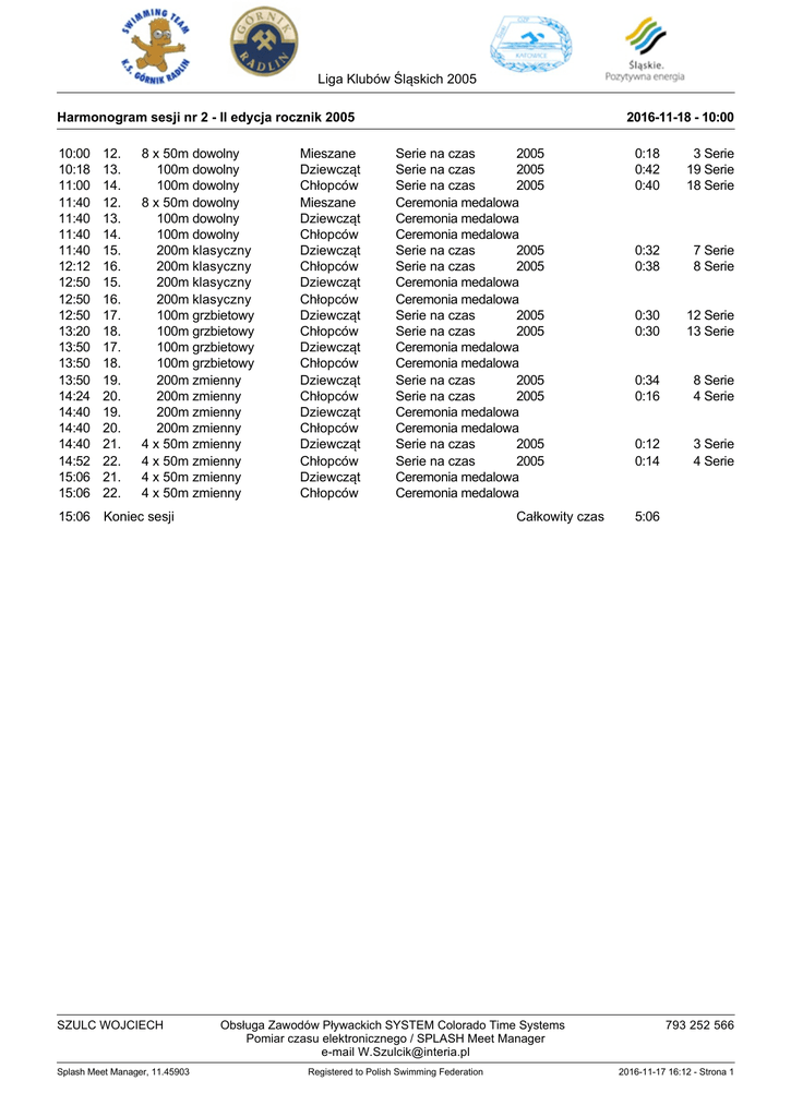 Liga Klubów Śląskich 2005 Harmonogram sesji nr 2 - II edycja rocznik 2005 10:00 10:18 11:00 11:40 11:40 11:40 11:40 12:12 12:50 12:50 12:50 13:20 13:50 13:50 13:50 14:24 14:40 14:40 14:40 14:52 15:06 15:06 12. 13. 14. 12. 13. 14. 15. 16. 15. 16. 17. 18. 17. 18. 19. 20. 19. 20. 21. 22. 21. 22. 8 x 50m dowolny 100m dowolny 100m dowolny 8 x 50m dowolny 100m dowolny 100m dowolny 200m klasyczny 200m klasyczny 200m klasyczny 200m klasyczny 100m grzbietowy 100m grzbietowy 100m grzbietowy 100m grzbietowy 200m zmienny 200m zmienny 200m zmienny 200m zmienny 4 x 50m zmienny 4 x 50m zmienny 4 x 50m zmienny 4 x 50m zmienny 15:06 Koniec sesji SZULC WOJCIECH Splash Meet Manager, 11.45903 Mieszane Dziewcząt Chłopców Mieszane Dziewcząt Chłopców Dziewcząt Chłopców Dziewcząt Chłopców Dziewcząt Chłopców Dziewcząt Chłopców Dziewcząt Chłopców Dziewcząt Chłopców Dziewcząt Chłopców Dziewcząt Chłopców 2016-11-18 - 10:00 Serie na czas 2005 Serie na czas 2005 Serie na czas 2005 Ceremonia medalowa Ceremonia medalowa Ceremonia medalowa Serie na czas 2005 Serie na czas 2005 Ceremonia medalowa Ceremonia medalowa Serie na czas 2005 Serie na czas 2005 Ceremonia medalowa Ceremonia medalowa Serie na czas 2005 Serie na czas 2005 Ceremonia medalowa Ceremonia medalowa Serie na czas 2005 Serie na czas 2005 Ceremonia medalowa Ceremonia medalowa Całkowity czas Obsługa Zawodów Pływackich SYSTEM Colorado Time Systems Pomiar czasu elektronicznego / SPLASH Meet Manager e-mail [email protected] Registered to Polish Swimming Federation 0:18 0:42 0:40 3 Serie 19 Serie 18 Serie 0:32 0:38 7 Serie 8 Serie 0:30 0:30 12 Serie 13 Serie 0:34 0:16 8 Serie 4 Serie 0:12 0:14 3 Serie 4 Serie 5:06 793 252 566 2016-11-17 16:12 - Strona 1