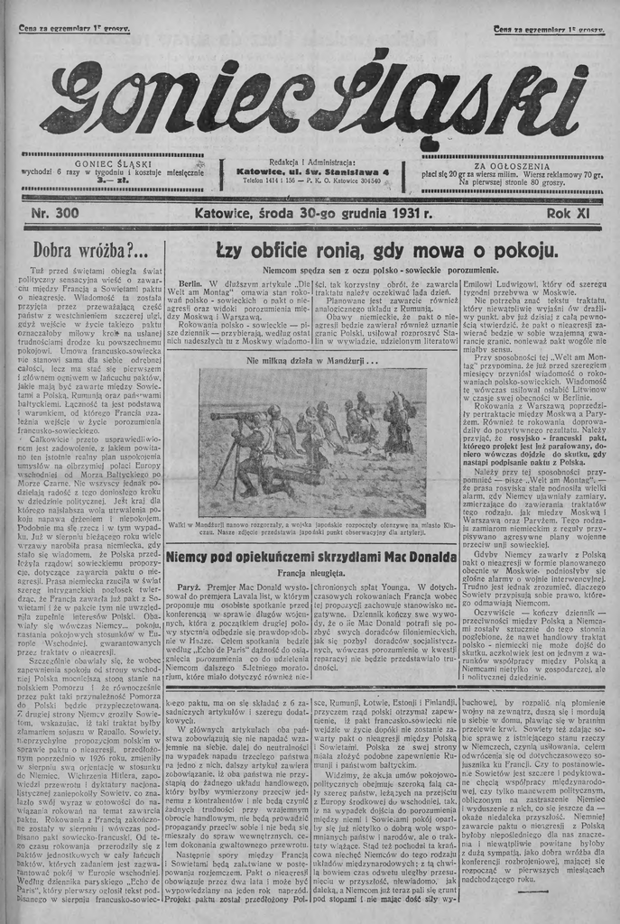 Cena za eerzemntarz 1" proezv. Ceng za eerzemniflrz Is prnczv. 'SmieeJUaAfti ■ #r GONIEC ŚLĄSKI A wychodzi 6 razy w tygodniu i kosztuje miesięcznie 3.— zł. Nr. 300 Dobra wróżba?... Redakcja i Administracja: [ Katowice, ul. św. Stanisława 4 Telefon 1414 1 156 — P. K. O. Katowice 304540 , ZA OGŁOSZENIA płaci się 20 gr za wiersz miiim. Wiersz reklamowy 70 gr. Na pierwszej stronie 80 groszy. Katowice, środa 30-go grudnia 1931 r. Rok XI Łzy obficie ronią, gdy mowa o pokoju. Niemcom spędza sen z oczu polsko-sowieckie porozumienie. Tuż przed świętami obiegła świat polityczny sensacyjna wieść o zawar Berlin. W .dłuższym artykule „Die ści, tak korzystny obrót, że zawarcia Emilowi Ludwigowi, który od szeregu ciu między Francją a Sowietami paktu Welt am Montag“ omawia stan roko traktatu należy oczekiwać lada dzień. tygodni przebywa w Moskwie. 0 nieagresję. Wiadomość ta została wań polsko - sowieckich o pakt o nie Planowane jest zawarcie również Nie potrzeba znać tekstu traktatu, przyjęta przez przeważającą część agresji oraz widoki porozumienia mię analogicznego układu z Rumunią. który niewątpliwie wyjaśni ów drażli państw z westchnieniem szczerej ulgi, dzy Moskwą i Warszawą. Obawy niemieckie, że pakt o nie wy punkt, aby już dzisiaj z całą pewno gdyż wejście w życie takiego paktu Rokowania polsko - sowieckie — pi agresji będzie zawierał również uznanie ścią stwierdzić, że pakt o nieagresji za oznaczałoby milowy kroił- na usłanej sze dziennik — przybierają, według ostat granic Polski, usiłował rozproszyć Sta wierać bedzie w sobie wzajemną gwa trudnościami drodze ku powszechnemu nich nadeszłych tu z Moskwy wiadomo- lin w wywiadzie, udzielonym literatowi rancję granic, nonieważ pakt wogóle nie miałby sensu. pokojowi. Umowa francusko-sowiecka Przy sposobności tej „Welt am Mon nie stanowi sama dla siebie odrębnej Nie milkną działa w Mandżur;!... tag“ przypomina, że już przed szeregiem całości, lecz ma stać się pierwszem lilii: miesięcy orzyniósł wiadomość o roko 1 głównem ogniwem w łańcuchu paktów, waniach polsko-sowieckich. Wiadomość jakie mają być zawarte między Sowie tę wówczas usiłował osłabić Litwinow tami a Polską, Rumun ją oraz państwami w czasje swej obecności w Berlinie. bałtyckiemu Łączność ta jest podstawą Rokowania z Warszawą poprzedzi i warunkiem, od którego Francja uza ły pertraktacje między Moskwą a Pary leżnia wejście w życie porozumienia żem. Również te rokowania doprowa dziły do pozytywnego rezultatu. Należy francusko-sowieckiego. przyjąć, że rosyjsko - francuski pakt, ' Całkowicie przeto usprawiedli wió którego projekt jest już parafowany, dorem jest zadowolenie, z jakiem powita oiero wówczas dojdzie do skutku, gdy no ten istotnie realny plan uspokojenia nastąpi podpisanie paktu z Polską. umysłów na olbrzymiej połaci Europy Należy przy tej sposobności przy wschodniej od Morza Bałtyckiego po pomnieć — pisze „Welt am Montag“, — Morze Czarne. Nie wszyscy jednak po że prasa rosyjska stale podnosiła wielki dzielają radość z tego doniosłego kroku alarm, gdy Niemcy ujawniały zamiary, w dziedzinie politycznej. Jeśt kraj, dla zmierzające do zawierania traktatów którego najsłabsza woła utrwalenia po tego rodzaju, jak miedzy Moskwą i koju napawa drżeniem i niepokojem. Warszawą oraz Paryżem. Tego rodza nanowo rozgorzały, a wojska japońskie rozpoczęły ofenzywę na miasto KiuPodobnie ma się rzecz i w tym wypad Walki w Mandżurii ju zamiarom niemieckim z reguły przy czau. Nasze zdjęcie przedstawia japoński punkt obserwacyjny dla artylerii. ku. Już w sierpniu bieżącego roku wiele pisywano agresywne plany wojenne przeciw unji sowieckiej. wrzawy narobiła prasa niemiecka, gdy stało się wiadomem. że Polska przed Niemcy zawarły z Polską Niemcy pod opiekuńcze«! skrzydłami Mac Donalda paktGdyby o nieagresji w formie planowanego łożyła rządowi sowieckiemu propozy obecnie w Moskwie, podniosłyby się cje, dotyczące zawarcia paktu o nie Francja nieugięta. głośne alarmy o wojnie interwencyjnej. agresji. Prasa niemiecka rzuciła w świat Trudno jest jednak zrozumieć, dlaczego chromonych spłat Younga. W dotych Paryż. Premjer Mac Donald wysto szereg intryganckich pogłosek twier Sowiety przypisują sobie prawo, które sował do premiera Lavala list, w którym czasowych rokowaniach Francja wobec dząc, że Francja zawarła już pakt z So go odmawiają Niemcom. wietami i że w pakcie tym nie uwzględ proponuje mu osobiste spotkanie przed tej propozycji zachowuje stanowisko ne Oczywiście — kończy dziennik — niła zupełnie interesów Polski. Oba konferencją w sprawie długów wojen gatywne. Dziennik kończy swe wywo przeciwności między Polską a Niemca wiały się wówczas Niemcy... pokoju, nych, która z początkiem drugiej poło dy, że o ile Mac Donald potrafi się po mi zostały sztucznie do tego stonnia nastania pokojowych stosunków' w Eu wy stycznia odbędzie się prawdopodob zbyć swych doradców filoniemieckich, pogłębione, że nawet handlowy traktat ropie Wschodniej. gwarantowanych nie w Hadze. Celem spotkania będzie jak się pozbył doradców.socjalistycz polsko - niemiecki nie może dojść do według „Echo de Paris“ dążność do osią nych, wówczas porozumienie w kwestji skutku, aczkolwiek jest on jednym z wa przez traktaty o nieagresji. Szczególnie obawiały się, że wobec gnięcia porozumienia co do udzielenia reparacyj nie będzie przedstawiało tru runków współpracy między Polską a Niemcami nie tylko w gospodarczej, ale zapewnienia spokoju od strony wschod Niemcom dalszego 5-letniego morato dności. i nolitycznej dziedzinie. niej Polska mocniejsza stopą stanie na rium, które miało dotyczyć również nieDolskiem Pomorzu i że równocześnie przez pakt taki przynależność Pomorza do Polski będzie przypieczętowaną. kiego paktu, ma on si