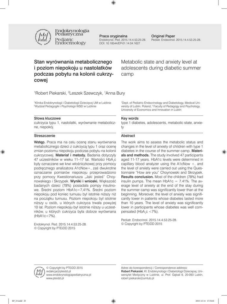 Praca oryginalna Endokrynol. Ped. 2015.14.4.53.25-28. DOI: 10.18544/EP-01.14.04.1627 Stan wyrównania metabolicznego i poziom niepokoju u nastolatków podczas pobytu na kolonii cukrzycowej Original Paper Pediatr. Endocrinol. 2015.14.4.53.25-28. Metabolic state and anxiety level at adolescents during diabetic summer camp Robert Piekarski, 2Leszek Szewczyk, 1Anna Bury 1 2 Klinika Endokrynologii i Diabetologii Dziecięcej UM w Lublinie Wydział Pedagogiki i Psychologii WSEI w Lublinie Dept. of Pediatric Endocrinology and Diabetology, Medical University of Lublin, Poland; 2 Faculty of Pedagogy and Psychology, University of Economics and Innovation in Lublin Słowa kluczowe cukrzyca typu 1, nastolatki, wyrównanie metaboliczne, niepokój Key words type 1 diabetes, adolescents, metabolic state, anxiety Streszczenie Abstract Wstęp. Praca ma na celu ocenę stanu wyrównania metabolicznego dzieci z cukrzycą typu 1 oraz ocenę zmian poziomu niepokoju podczas pobytu na kolonii cukrzycowej. Materiał i metody. Badania dotyczyły 47 uczestników w wieku 11–17 lat. Wartości HbA1c były oznaczane we krwi włośniczkowej przy pomocy podręcznego analizatora A1cNow+, zaś dwukrotne oznaczanie pomiarów niepokoju przeprowadzono przy pomocy Kwestionariusza „Jaki jesteś” Choynowskiego i Skrzypek. Wyniki i wnioski. Większość badanych dzieci (78%) posiadała pompy insulinowe. Średni poziom HbA1c=7,41%. Średni poziom niepokoju pod koniec turnusu był istotnie niższy niż na początku turnusu. Poziom niepokoju był istotnie niższy u osób, u których cukrzyca trwała powyżej 10 lat. Poziom niepokoju był istotnie niższy u uczestników, u których cukrzyca była dobrze wyrównana (HbA1c<7%). The work aims to assess the metabolic status and changes in the level of anxiety of children with type 1 diabetes in the course of the summer camp. Materials and methods. The study involved 47 participants aged 11-17 years. HbA1c levels were determined in capillary blood analyzer using the A1cNow +, and the level of anxiety were carried out using the Questionnaire “How are you” Choynowski and Skrzypek. Results conclusion. Most of the children (78%) had insulin pumps. The mean HbA1c = 7.41%. The average level of anxiety at the end of the stay during the summer camp was significantly lower than at the beginning. Moreover, the level of anxiety was significantly lower in patients whose diabetes lasted more than 10 years. The level of anxiety was significantly lower in participants whose diabetes was well compensated (HbA1c <7%). 1 Endokrynol. Ped. 2015.14.4.53.25-28. © Copyright by PTEiDD 2015 © Copyright by PTEiDD 2015 [email protected] www.endokrynologiapediatryczna.pl www.pteidd.pl EP_53.indd 25 1 Pediatr. Endocrinol. 2015.14.4.53.25-28. © Copyright by PTEiDD 2015 Adres do korespondencji / Correspondence address: Robert Piekarski, Kl. Endokrynologii i Diabetologii Dziecięcej, Uniwersytet Medyczny w Lublinie, ul. Prof. Gębali 6, 20-093 Lublin, [email protected] 2015-12-14 17:34:41 Wstęp Wiadomo powszechnie, że w cukrzycy typu 1 uwzględnia się rolę stresu psychicznego w ujawnianiu się i jej przebiegu, zaś dziecko chore na cukrzycę typu 1 jest bardziej narażone na różne czynniki stresorodne związane z sytuacją chorobową, w jakiej musi funkcjonować na co dzień oraz z nie zawsze optymistyczną oceną siebie zarówno aktualną, jak i perspektywiczną [1]. Badania osobowości wykazały u dzieci z cukrzycą typu 1 większą labilność emocjonalną, większą submisyjność, nasilenie poczucia zmęczenia ogólnego, ale także wzrost dojrzałości charakterologicznej i samodzielności [2,3]. Mimo wszystko poczucie jakości życia nie zawsze jest doskonałe, co wiąże się z przestrzeganiem diety cukrzycowej, sposobem insulinoterapii [4,5]. Z badań lubelsko-wrocławskich [6] wynika, że stosowanie leczenia przy pomocy osobistej pompy insulinowej daje większą możliwość działania i niezależności w codziennym życiu, co sprzyja lepszemu wyrównaniu metabolicznemu. Ważne znaczenie ma także postawa dziecka wobec swojej choroby [7]. Badania miały na celu ocenę stanu metabolicznego dzieci z cukrzycą typu 1 przebywających na kolonii cukrzycowej oraz ocenę zmian poziomu niepokoju jawnego w trakcie pobytu wakacyjnego. Materiał i metody Badania dotyczyły 47 uczestników kolonii cukrzycowej w wieku 11–17 lat (średnio 13,2): 17 osób w wieku do 12 roku życia, zaś 30 osób powyżej 12 roku życia. Prawie połowę stanowili chłopcy (22 osoby), zaś dziewcząt było 25. Uczestnikami kolonii zorganizowanej przez Koło Pomocy Dzieciom i Młodzieży z Cukrzycą (mgr Jadwiga Gruba) w Ośrodku „Astur” nad jeziorem Białym byli pacjenci głównie z Lubelszczyzny. Badania dotyczyły pomiaru wartości HbAlc we krwi włośniczkowej przy pomocy podręcznego analizatora A1c Now+ firmy Bayer Consumer AG. Procedura oceniania HbA1c przy pomocy urządzenia A1c Now+ jest całkowicie zautomatyzowana, wynik jest otrzymywany po 5 minutach od naniesienia krwi na kasetę testową [8,9]. Pomiary poziomu niepokoju przeprowadzono dwukrotnie (na początku i pod koniec turnusu) przy pomocy kwestionariusza „Jaki Jesteś?” Chojnowskiego i Skrzypek, odpowiedniego dla wieku badanych pacjentów [10]. Skala Neurotyczności 26 EP_53.indd 26 Endokrynol. Ped. 2015.14.4.53.25-28 kwestionariusza mierzy skłonności neurotyczne wyrażające się w niepokojach, zmartwieniach, lękach i objawach psychosomatycznych. Średnia dla zdrowych chłopców = 13,45 ±6,08, zaś dla zdrowych dziewcząt = 16,13±6,85. Skala Kłamstwa informuje o stopniu wiarygodności odpowiedzi badanych. Rzetelność i trafność kwestionariusza jest wysoka (p<0,001). Wyniki badań Charakterystykę badanych według wieku i płci przedstawia tabela I. Tabela I. Wiek i płeć badanych Table I. Age and sex of patients Wiek (lata) Chłopcy Dziewczęta Razem 11–12 10 8 18 13–14 6 10 16 15–17 6 7 13 Razem 22 25 47 Większość badanych otrzym