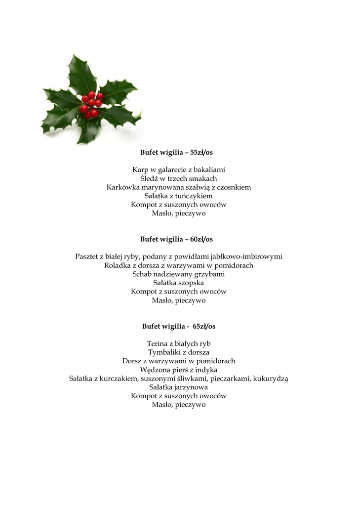 Bufet wigilia – 55zł/os Karp w galarecie z bakaliami Śledź w trzech smakach Karkówka marynowana szałwią z czosnkiem Sałatka z tuńczykiem Kompot z suszonych owoców Masło, pieczywo Bufet wigilia – 60zł/os Pasztet z białej ryby, podany z powidłami jabłkowo-imbirowymi Roladka z dorsza z warzywami w pomidorach Schab nadziewany grzybami Sałatka szopska Kompot z suszonych owoców Masło, pieczywo Bufet wigilia - 65zł/os Terina z białych ryb Tymbaliki z dorsza Dorsz z warzywami w pomidorach Wędzona pierś z indyka Sałatka z kurczakiem, suszonymi śliwkami, pieczarkami, kukurydzą Sałatka jarzynowa Kompot z suszonych owoców Masło, pieczywo Bufet wigilia – 85zł/os Barszcz czerwony z suszonymi śliwkami i pasztecikiem z grzybami Filet z karpia samażony w sosie cytrynowym Filet z dorsza pieczony z kruszonką ziołową Pstrąg pieczony z masłem koperkowym Ziemniaki au’gratine Kolorowy ryż z warzywami Pierogi z dynią i grzybami Kompot z suszonych owoców Bufet wigilia – 94zł/os Łosoś wędzony na zimno z sezamem Filety śledzia korzennego z sosem cytrynowym Rolada z pieczonej płastugi z suszonymi pomidorami Pasztet z sandacza i wędzonej śliwki z sosem grzybowym Pieczona pierś z indyka marynowana w pomarańczy i goździku z sosem żurawinowym Tradycyjna sałatka jarzynowa podana na plastrach pomidora z jajkiem przepiórczym Sałatka z pieczonych buraczków z wędzona gęsiną Sałatka z grillowanego kurczaka z porem i pieczarką Marynaty, sosy zimne: chrzanowy, cumberland, korniszonowy Masło, margaryna Pieczywo i bułeczki mieszane Zupa grzybowa z łazankami Karp w sosie piernikowym Pierogi z kapustą i grzybami Pieczony schab wieprzowy z boczkiem i sosem dijon Pieczone ziemniaki z polskimi ziołami Warzywa blanszowane Piernik czekoladowy z bakaliami, mus czekoladowy z wiśniami Zapraszamy do rezerwacji mailowych- [email protected] bądź telefonicznych 58 551 47 74 lub 501 741 875