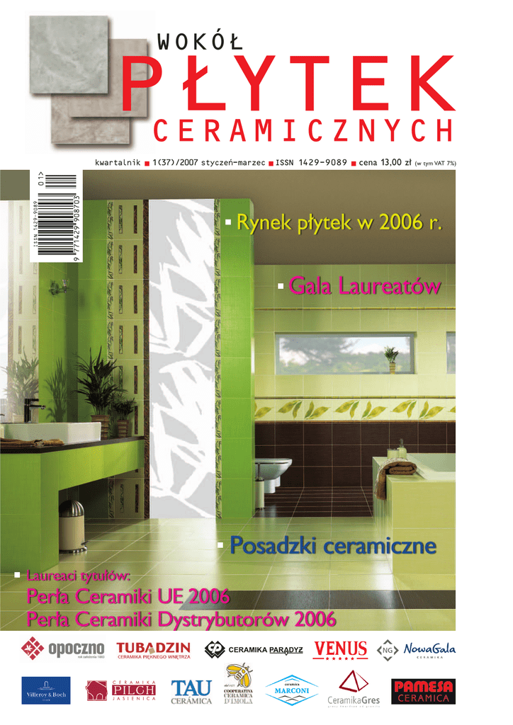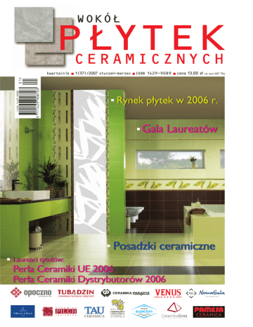 WOKÓ¸ P¸YTEK CERAMICZNYCH kwartalnik ■ 1(37)/2007 styczeƒ-marzec ■ ISSN 1429-9089 ■ cena 13,00 z∏ (w tym VAT 7%) OLA Kolekcja Ola inspirowana jest kolorami nieba o zachodzie s∏oƒca. P∏ytka podstawowa ma format 25x40 cm, natomiast p∏ytka pod∏ogowa, gres porcelanowy szkliwiony – 33,3x33,3 cm. Ca∏oÊç uzupe∏niajà oryginalne modernistyczne dekoracje z przeplatajàcymi si´ elementami geometrycznymi. Elementy dekoracyjne kolekcji to: ■ listwy, dost´pne w dwóch formatach: 25x4,8 i 40x4,8 cm; ■ dekor, sk∏adajàcy si´ z dwóch p∏ytek z prostokàtnym wyci´ciem, w które wkomponowuje si´ listw´ (w formacie 4,8x20 cm). Kolekcja ma uniwersalny charakter, co pozwala na zastosowanie jej zarówno w tradycyjnych, jak i nowoczesnych wn´trzach. Doskonale prezentuje si´ w u∏o˝eniu pionowym i poziomym. www.ceramikakonskie.pl 1 MELODIA – t ´ c z o w a paleta Najnowsza p∏ytka firmy Cersanit z kolekcji Melodia, dzi´ki bogatej gamie a˝ szeÊciu soczystych barw po∏àczonych z ciekawym zestawem dekoracji, pozwala stworzyç we wn´trzach ∏azienki weso∏y klimat dla lubiàcych intensywne kolory u˝ytkowników. Ciekawe, geometryczne kszta∏ty na listwach dekoracyjnych dodatkowo o˝ywiajà form´ oraz nadajà ∏azience nowoczesny design. Odwa˝ne kolorystycznie po∏àczenia sprawdzà si´ w ka˝dej ∏azience. Kolekcja p∏ytek Melodia zdecydowanie zwraca uwag´ i cieszy oko. W sk∏ad kolekcji wchodzà: •p∏ytka Êcienna Melodia 25x35 cm w kolorach: Rosa, Viola, Beige, Orange, Zefir, Verde; •p∏ytka pod∏ogowa Melodio 33,3x33,3 cm w kolorach: Viola, Orange, Verde; •dekoracje: – inserto w kolorach: Beige, Rosa, Zefir; – listwa w kolorach: Beige, Rosa, Zefir; – cygaro w kolorach: Beige, Rosa, Zefir. www.cersanit.com.pl 2 TESALIA – b o g a c t w o dekorów Kolekcja p∏ytek Tesalia to kolejna propozycja firmy Cersanit dost´pna w trzech zestawach dekoracji do wyboru – Classic, Kwiatek lub Modern. Do p∏ytki podstawowej w kolorach Beige, Brown oraz Giallo zaproponowane zosta∏y stylowo zró˝nicowane dodatki w formie dekoracyjnego inserta, listew, cygar czy mozaik. Classic jest eleganckà dekoracjà w postaci przeplatajàcych si´ motywów roÊlinnych. Kwiatek to bardziej odwa˝na propozycja aplikacji intensywnych, ciemnobràzowych kwiatów na jasnym tle. Dekoracja Modern to ju˝ zupe∏nie proste, geometryczne kszta∏ty. W sk∏ad kolekcji wchodzà: •p∏ytka Êcienna Tesalia 33,3x50 cm w kolorach: Beige, Brown, Giallo; •p∏ytka pod∏ogowa Tesalio 33,3x33,3 cm w kolorach: Beige, Giallo; •dekoracje: – inserto Classic, Kwiatek, Modern w kolorach: Beige, Giallo; – listwa Modern, Classic, Kwiatek w kolorach: Brown, Giallo; – cygaro, London, Mozaika w kolorach: Brown, Giallo, Beige; – naro˝nik pod∏ogowy Kwiatek w kolorach: Beige, Giallo; – listwa pod∏ogowa Kwiatek w kolorach: Beige, Giallo. www.cersanit.com.pl 3 OPOCZNO S.A. prezentuje nowe kolekcje INWENCJA z pasji tworzenia Kolekcja Inwencja doskonale wpasowuje si´ w nowoczesne trendy wzornicze. Bogata paleta dziesi´ciu kolorów p∏ytek bazowych oraz mozaik nacinanych i listew szklanych daje nieograniczone mo˝liwoÊci realizacji indywidualnych projektów wn´trz. Satynowa i g∏adka powierzchnia p∏ytek podkreÊla wysublimowany charakter kolekcji, która w doskona∏y sposób mo˝e podkreÊliç pi´kno nowoczesnej ceramiki i armatury ∏azienkowej. Kolekcj´ tworzà: p∏ytka Êcienna Inwencja w formacie 20x20 cm, w kolorach: bia∏ym, bia∏ym po∏yskowym, ecru, be˝owym, mocca, magnolia, pistacjowym, b∏´kitnym, szarym, grafitowym, czerwonym; p∏ytka pod∏ogowa Inwencja w formacie 30x30 cm, w kolorach: ecru, mocca, b∏´kitnym, szarym i bràzowym oraz p∏ytka bia∏a w formacie 30x30 cm; dekoracje: Inwencja classic listwa w formacie 20x1 cm, w kolorach: bia∏ym, ecru, bràzowym, pistacjowym, b∏´kitnym, grafitowym, czerwonym; Mozaika nacinana w formacie 20x20 cm, w kolorach: bia∏ym, bia∏ym po∏yskowym, ecru, be˝owym, mocca, magnolia, pistacjowym, b∏´kitnym, szarym, grafitowym, czerwonym. www.opoczno.com 4 ◆ tel. +48 / 44 / 75 48 100 MAGICA z barwnej krainy Magiczna kolekcja w nasyconych kolorach turkusu, czerwieni, bursztynu oraz czekoladowego bràzu. Kwiatowe dekoracje pokryte satynowanym z∏otem wprowadzajà we wn´trzu fantazyjny bajkowy klimat zaczarowanego Êwiata. Kolekcj´ tworzà: p∏ytki Êcienne Magica i Magica Flower w formacie 25x35 cm, w kolorach: kremowym, bursztynowym, bràzowym, turkusowym i czerwonym; Gres Magica w formacie 33,3x33,3 cm, w kolorach: bursztynowym, bràzowym, turkusowym, czerwonym; dekoracje: Magica classic – listwa w formacie 35x12,4 cm oraz 35x5 cm, w kolorach: bursztynowym, bràzowym, turkusowym i czerwonym; Magica geo – listwa w formacie 35x5 cm oraz 35x8 cm, w kolorach: bràzowym i turkusowym. www.opoczno.com ◆ tel. +48 / 44 / 75 48 100 5 DUSTIN Kolekcja p∏ytek pod∏ogowych, produkowanych w technologii gresu szkliwionego w formacie 30x30 cm. Charakteryzuje si´ ciekawà kamiennà grafikà p∏ytki inspirowanà naturalnym piaskowcem, który w unikalny sposób zosta∏ poddany dzia∏aniu si∏ natury. Powierzchnia p∏ytki jest przyjemna i mi∏a w dotyku. Dekoracje do kolekcji kontrastujà swoim po∏yskiem z satynowà powierzchnià p∏ytek bazowych. Kolekcja skierowana zarówno do klientów poszukujàcych nowatorskich rozwiàzaƒ jak i do tradycjonalistów. Elementy kolekcji i ceny brutto ■ P¸YTKA Dustin Beige, Brown 30x30 cm, 45,14 z∏/m2, LISTWA ■ Dustin Rosa, Brown 30x5 cm, 10,62 z∏/szt, ■ NARO˚NIK Dustin Rosa, Brown 5x5 cm, 7,57 z∏/szt. www.paradyz.com.pl 6 bezp∏atna infolinia: 0 800 55 66 77 IRON Kompletna kolekcja pod∏ogowa w formacie 30x30 cm, zrealizowana w technologii gresu szkliwionego. Ciekawym rozwiàzaniem jest zastosowanie w zag∏´bieniach struktury po∏yskujàcego surowca, który przy odpowiednim oÊwietleniu daje efekt lustra na powierzchni p∏ytek. Kol