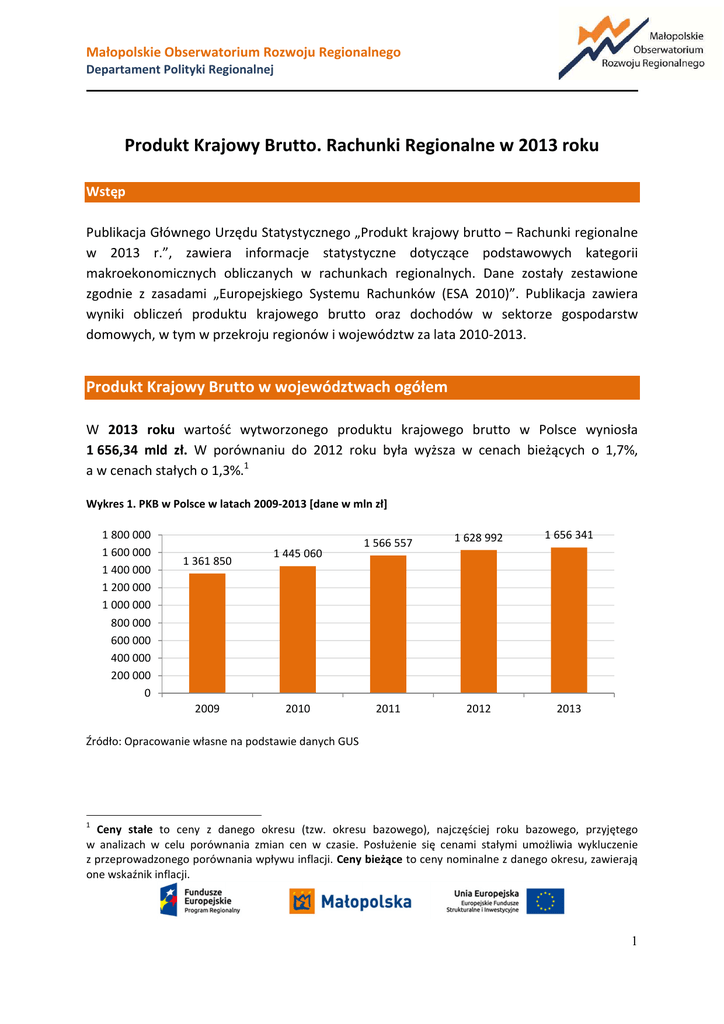 Małopolskie Obserwatorium Rozwoju Regionalnego Departament Polityki Regionalnej Produkt Krajowy Brutto. Rachunki Regionalne w 2013 roku Wstęp Publikacja Głównego Urzędu Statystycznego „Produkt krajowy brutto – Rachunki regionalne w 2013 r.”, zawiera informacje statystyczne dotyczące podstawowych kategorii makroekonomicznych obliczanych w rachunkach regionalnych. Dane zostały zestawione zgodnie z zasadami „Europejskiego Systemu Rachunków (ESA 2010)”. Publikacja zawiera wyniki obliczeń produktu krajowego brutto oraz dochodów w sektorze gospodarstw domowych, w tym w przekroju regionów i województw za lata 2010-2013. Produkt Krajowy Brutto w województwach ogółem W 2013 roku wartość wytworzonego produktu krajowego brutto w Polsce wyniosła 1 656,34 mld zł. W porównaniu do 2012 roku była wyższa w cenach bieżących o 1,7%, a w cenach stałych o 1,3%.1 Wykres 1. PKB w Polsce w latach 2009-2013 [dane w mln zł] 1 800 000 1 600 000 1 400 000 1 200 000 1 000 000 800 000 600 000 400 000 200 000 0 1 361 850 2009 1 445 060 2010 1 566 557 1 628 992 1 656 341 2011 2012 2013 Źródło: Opracowanie własne na podstawie danych GUS 1 Ceny stałe to ceny z danego okresu (tzw. okresu bazowego), najczęściej roku bazowego, przyjętego w analizach w celu porównania zmian cen w czasie. Posłużenie się cenami stałymi umożliwia wykluczenie z przeprowadzonego porównania wpływu inflacji. Ceny bieżące to ceny nominalne z danego okresu, zawierają one wskaźnik inflacji. 1 Małopolskie Obserwatorium Rozwoju Regionalnego Departament Polityki Regionalnej Najwyższą wartość PKB wypracowało województwo mazowieckie 366,4 mld zł. Dysproporcja pomiędzy mazowieckim a pozostałymi regionami jest znaczna. Małopolska zajmuje od lat 5. lokatę w rankingu województw, jeśli chodzi o wartość PKB w regionach. Wykres 2. PKB w województwach w poszczególnych latach [dane w mln zł] 366 431 Mazowieckie 313 703 206 182 Śląskie 186 375 159 784 Wielkopolskie 135 751 140 142 Dolnośląskie 123 313 128 085 Małopolskie 109 601 101 032 Łódzkie 88 462 95 004 Pomorskie 81 769 73 848 Kujawsko-pomorskie 2013 2012 2010 65 305 65 738 Lubelskie 56 446 65 088 Podkarpackie 55 549 61 628 Zachodniopomorskie 55 256 44 555 Warmińsko-mazurskie 39 538 39 866 Świętokrzyskie 37 215 37 525 Podlaskie 32 967 36 564 32 431 Lubuskie 34 868 Opolskie 31 380 0 50 000 100 000 150 000 200 000 250 000 300 000 350 000 400 000 Źródło: Opracowanie własne na podstawie danych GUS 2 Małopolskie Obserwatorium Rozwoju Regionalnego Departament Polityki Regionalnej W przekroju województw w latach 2012-2013 dynamika PKB w ujęciu realnym (w cenach stałych) była zróżnicowana – w województwie świętokrzyskim wystąpił spadek o 1,3%, a w pozostałych województwach wzrost, przy czym największy w województwie mazowieckim o 2,8%. W latach 2010-2013 największy wzrost wolumenu KB w cenach stałych odnotowano w województwie wielkopolskim – o 10,0%, a najmniejszy w województwie świętokrzyskim – o 1,8%, wobec 8,1% dla kraju ogółem. W latach 2010-2013 średnie roczne tempo wzrostu PKB kształtowało się na poziomie 2,6% (w cenach stałych). W omawianym okresie najszybciej wzrastała z roku na rok wartość PKB w województwie wielkopolskim – o 3,3%, a najwolniej w świętokrzyskim – o 0,6%. Tempo wzrostu PKB przewyższające średnią krajową odnotowano także w województwach: mazowieckim (3,1%), pomorskim (3,0%), lubelskim, małopolskim i podkarpackim (2,9%) jak również dolnośląskim (2,7%). Natomiast w pozostałych 8 województwach tempo wzrostu PKB kształtowało się na poziomie od 1,5% w województwach: warmińsko-mazurskim i zachodniopomorskim do 2,5% w województwie łódzkim. Mapa 1. Tempo wzrostu PKB w województwach w 2013 r. w stosunku do 2010 r. Pomorskie Warmińsko-Mazurskie Zachodniopomorskie Podlaskie Kujawsko-pomorskie Lubuskie Mazowieckie Wielkopolskie Łódzkie Lubelskie Dolnośląskie procent Świętokrzyskie Opolskie 101.8 - 105.7 105.7 - 106.8 106.8 - 108.8 108.8 - 109.5 109.5 - 110 Śląskie Małopolskie Podkarpackie Źródło: Opracowanie własne na podstawie danych GUS W 2013 roku, w porównaniu do roku 2010, 5 województw – mazowieckie, wielkopolskie, lubelskie, małopolskie, podkarpackie – zwiększyło swoje udziały w tworzeniu PKB, udziały 4 województw zmniejszyły się (śląskie, świętokrzyskie, opolskie i zachodniopomorskie), a 7 pozostałych (dolnośląskie, kujawsko-pomorskie, lubuskie, łódzkie, podlaskie, pomorskie i warmińsko-mazurskie) nie zmieniły się. 3 Małopolskie Obserwatorium Rozwoju Regionalnego Departament Polityki Regionalnej Wśród województw o największych udziałach w tworzeniu produktu krajowego brutto w latach 2010-2013 niezmiennie pozostawały 2 województwa: mazowieckie i śląskie, wytwarzające razem ponad 1/3 krajowej wartości PKB. W 2013 roku wymienione województwa wypracowały łącznie 34,5% krajowej wartości PKB (w 2010 roku – 34,6%), skupiając na swoim terenie 28,1% ogółu pracujących w gospodarce narodowej (podobnie jak w 2010 roku). W latach 2010-2013 w grupie województw z największymi udziałami w generowaniu PKB, oprócz mazowieckiego i śląskiego, były także województwa: wielkopolskie, dolnośląskie i małopolskie, zajmujące w każdym z omawianych lat te same lokaty. W 2013 roku jednostki prowadzące działalność w wymienionych 5 województwach wytworzyły w sumie 60,3% krajowej wartości PKB (w 2010 roku – 60,1%). Mapa 2. Udział województw w tworzeniu PKB w 2013 roku Pomorskie Warmińsko-Mazurskie Zachodniopomorskie Podlaskie Kujawsko-pomorskie Lubuskie Mazowieckie Wielkopolskie Łódzkie Lubelskie Dolnośląskie procent Świętokrzyskie Opolskie 2.1 - 2.7 2.7 - 4 4 - 6.1 6.1 - 9.6 9.6 - 22.1 Śląskie Małopolskie Podkarpackie Źródło: Opracowanie własne na podstawie danych GUS Produkt Krajowy Brutto w województwach w przeliczeniu na 1 mieszkańca Przeciętny poziom produktu krajowego b