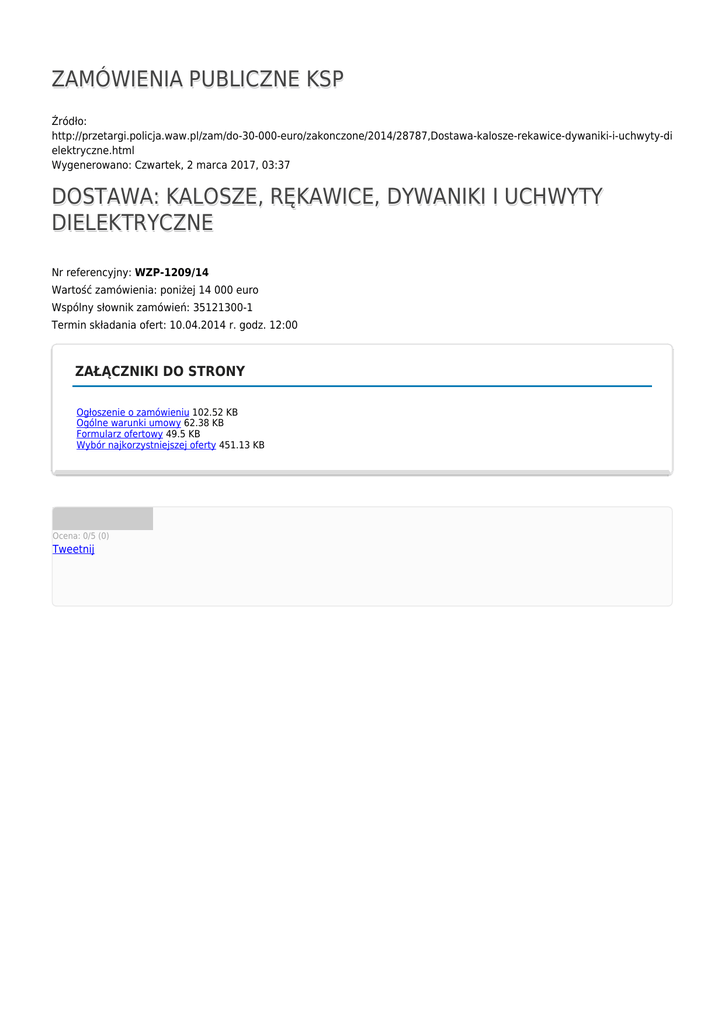 ZAMÓWIENIA PUBLICZNE KSP Źródło: http://przetargi.policja.waw.pl/zam/do-30-000-euro/zakonczone/2014/28787,Dostawa-kalosze-rekawice-dywaniki-i-uchwyty-di elektryczne.html Wygenerowano: Czwartek, 2 marca 2017, 03:37 DOSTAWA: KALOSZE, RĘKAWICE, DYWANIKI I UCHWYTY DIELEKTRYCZNE Nr referencyjny: WZP-1209/14 Wartość zamówienia: poniżej 14 000 euro Wspólny słownik zamówień: 35121300-1 Termin składania ofert: 10.04.2014 r. godz. 12:00 ZAŁĄCZNIKI DO STRONY Ogłoszenie o zamówieniu 102.52 KB Ogólne warunki umowy 62.38 KB Formularz ofertowy 49.5 KB Wybór najkorzystniejszej oferty 451.13 KB Ocena: 0/5 (0) Tweetnij